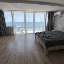 Двухкомнатные апартаменты вместимостью 6 человек. Спальные места: двуспальная кровать, 2 двуспальных дивана. Есть все для удобного отдыха: своя кухня, посуда, микроволновая печь, индукционная плита на 2 конфорки, холодильник, электрочайник, кондиционер, плазменный телевизор, санузел с душем, фен, шкаф. Возможно пользование сауной за дополнительную плату. Находится на 1 этаже с выходом на прекрасный песчаный пляж. Большая терраса добавляет дополнительный комфорт этой комнате.