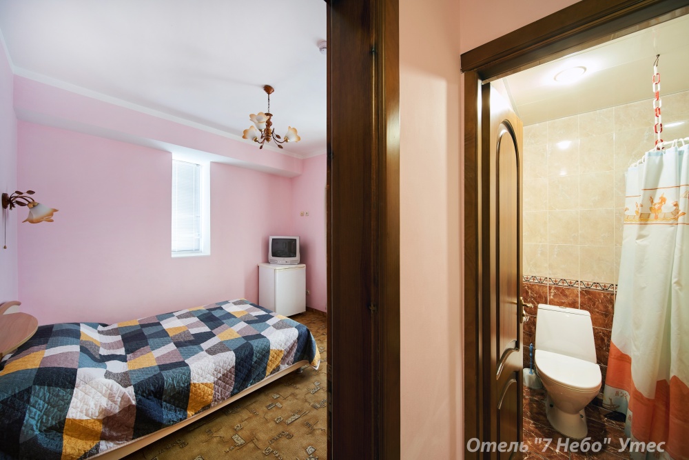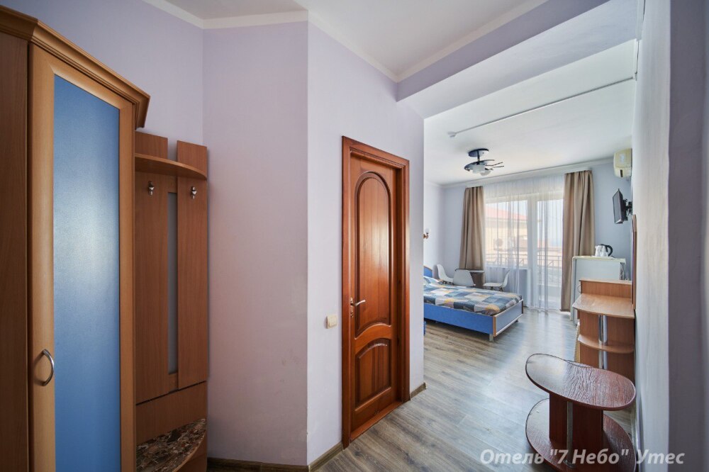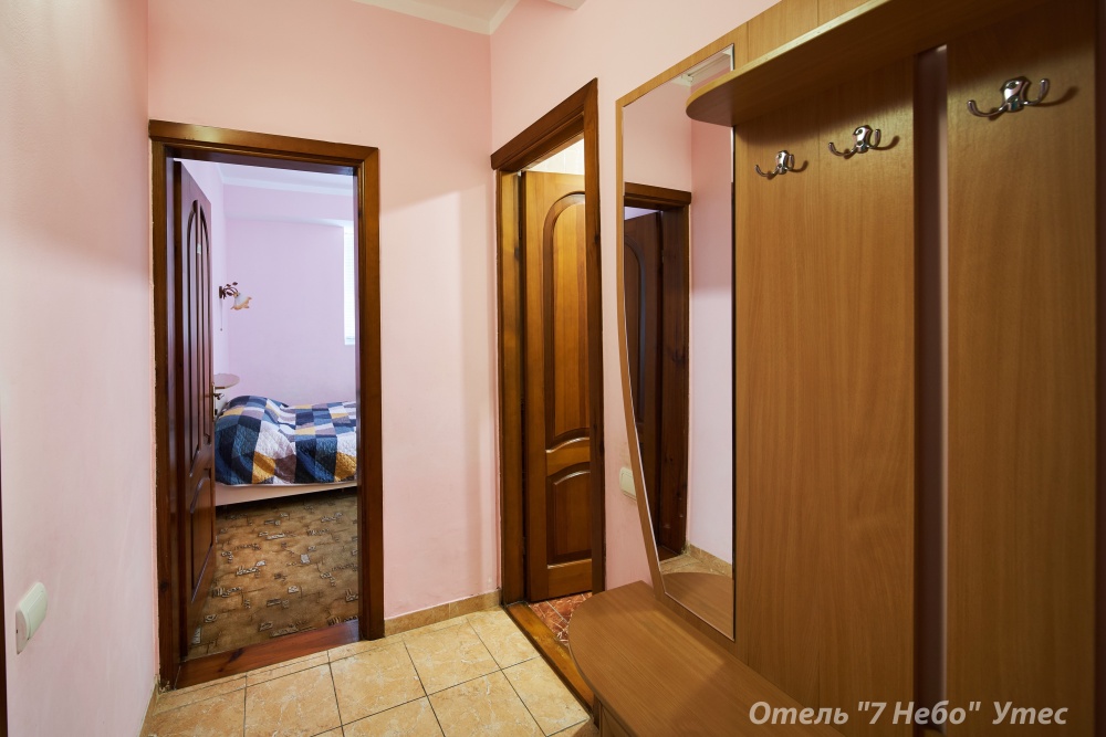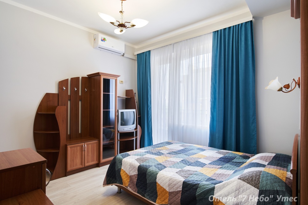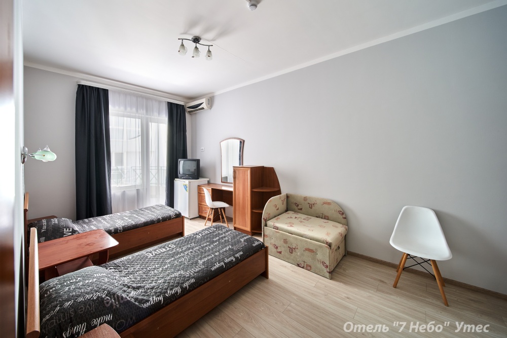 Номер семейный -двухкомнатный номер,с видом на соседнее здание с одним санузлом на две комнаты. Общая площадь номера – 40 м.кв. Номер разделен на две отдельные комнаты. В каждой комнате двуспальная или две полуторные кровати ,шкаф,, трюмо, , кондиционер, телевизор, холодильник. Также в комплектацию номера входит чайник столовые приборы, чашки, тарелки и фен. *Имеется вариант размещения до 6 человек, с дополнительными полуторными кроватями, уточняйте при бронировании. Отель не гарантирует номер с балконом! Смена постельного белья через каждые пять дней, смена полотенец раз в три дня.