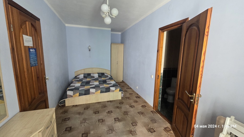 В номере одна двухместная кровать,, шкаф, стулья, трюмо, санузел с душем в каждом номере.