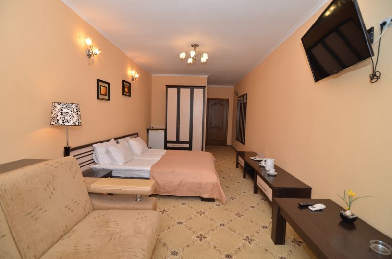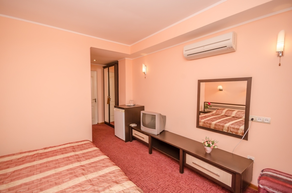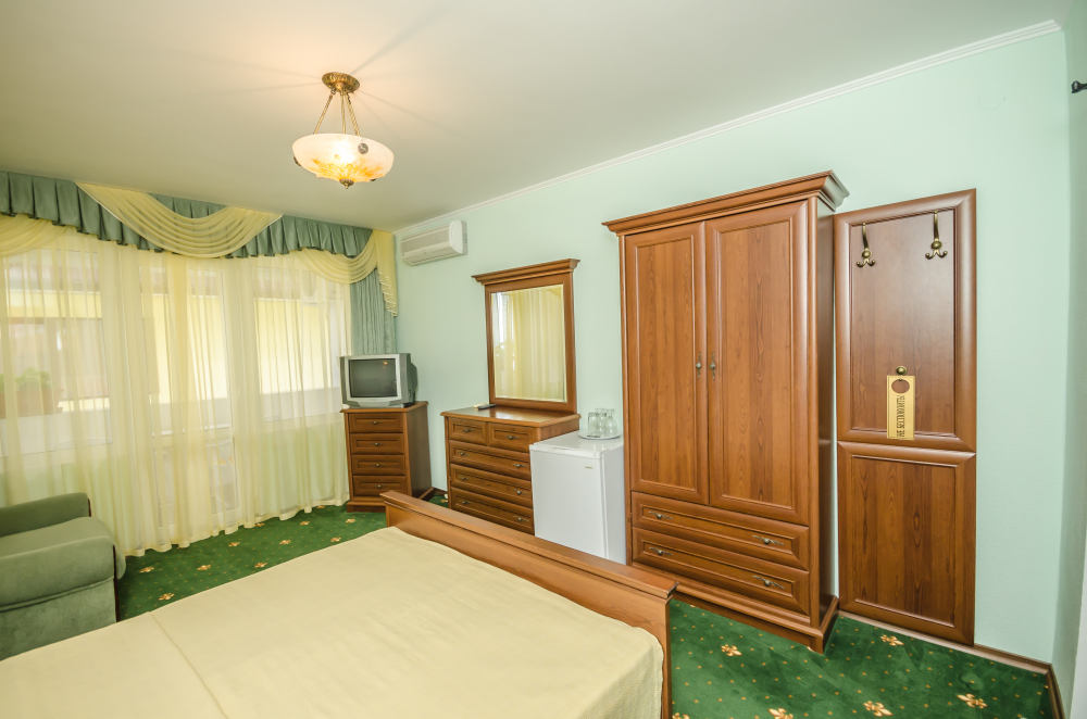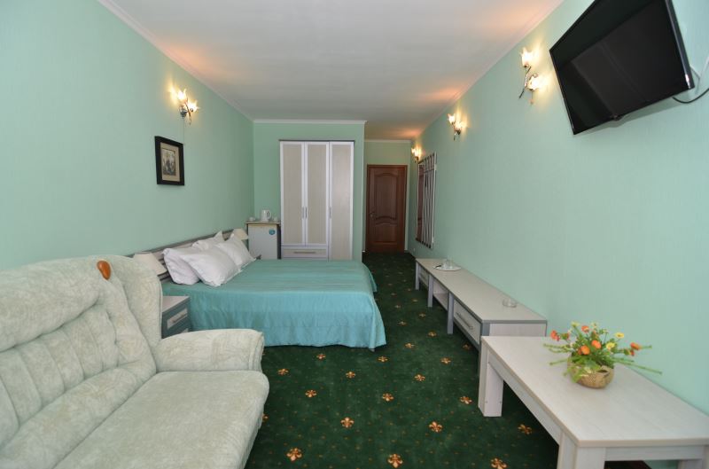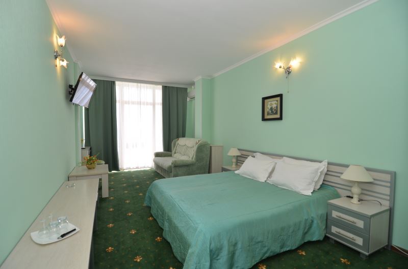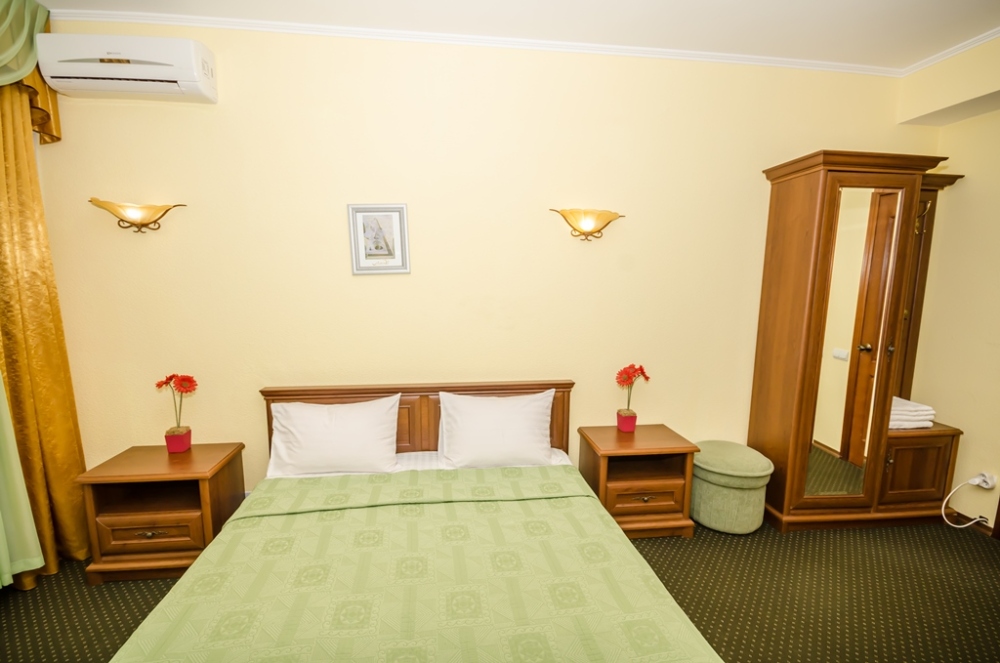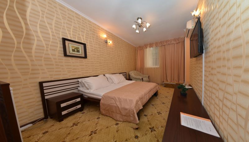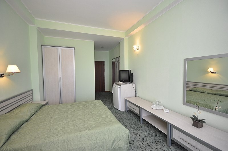 Номера выходят на северную сторону. Для комфортного отдыха вдвоем номер располагает всем необходимым. Это кондиционер для создания прохлады, полный пакет телеканалов, Wi-Fi. Номер без балкона.