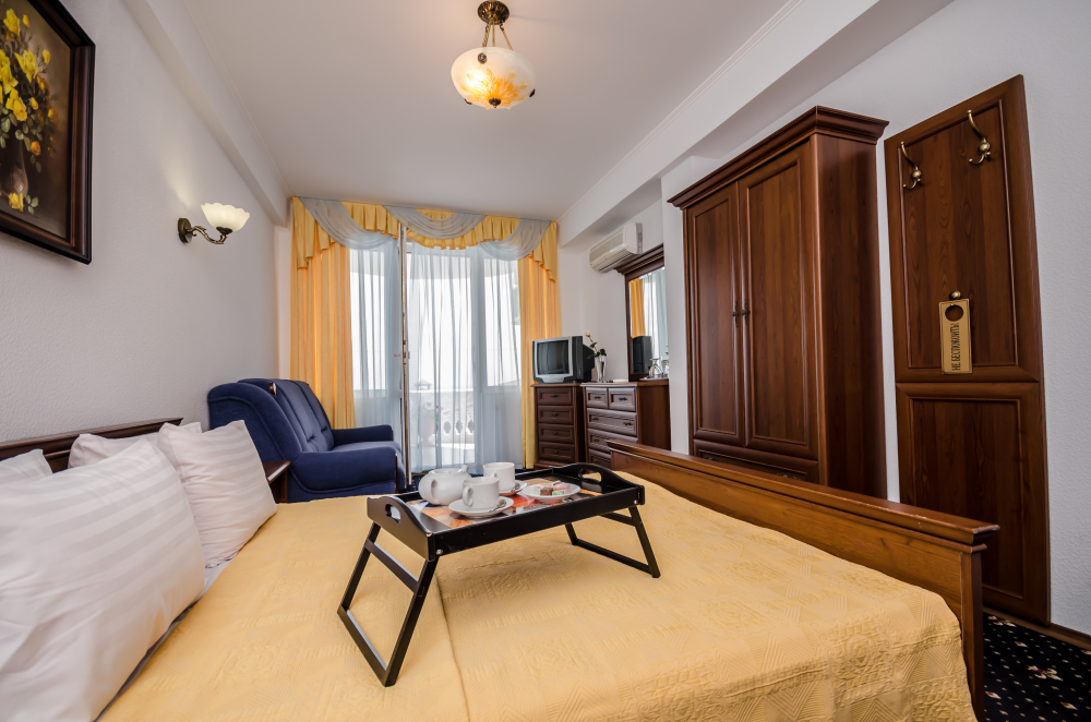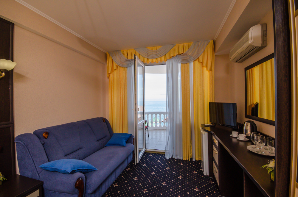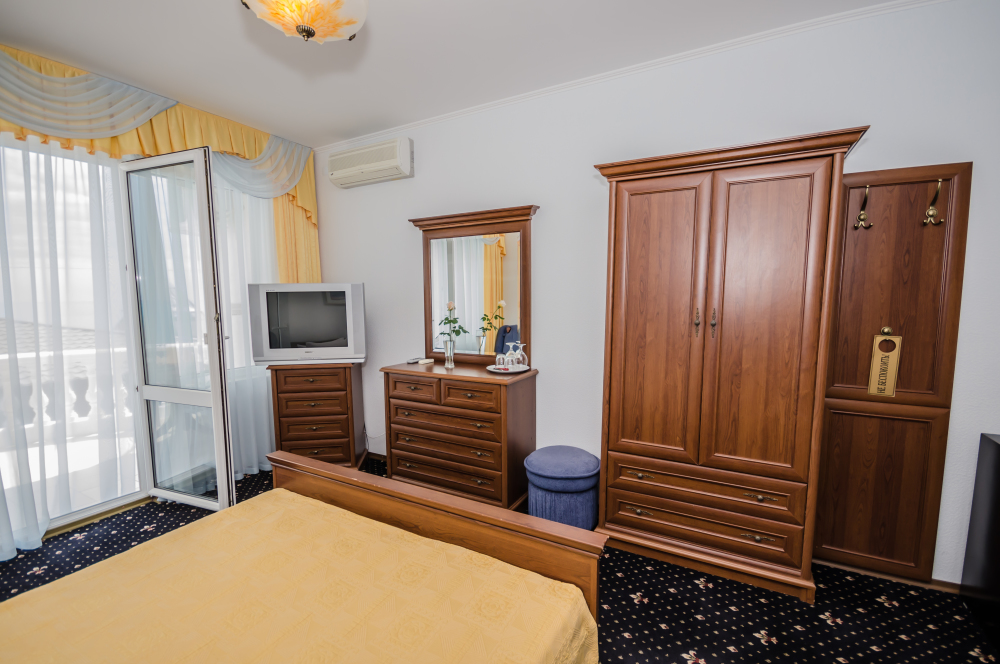 Номера выходят на южную сторону. Здесь всегда светло и по-южному тепло. Для комфортного отдыха вдвоем номер располагает всем необходимым. Это балкон с чудесным видом, кондиционер для создания прохлады, полный пакет телеканалов.