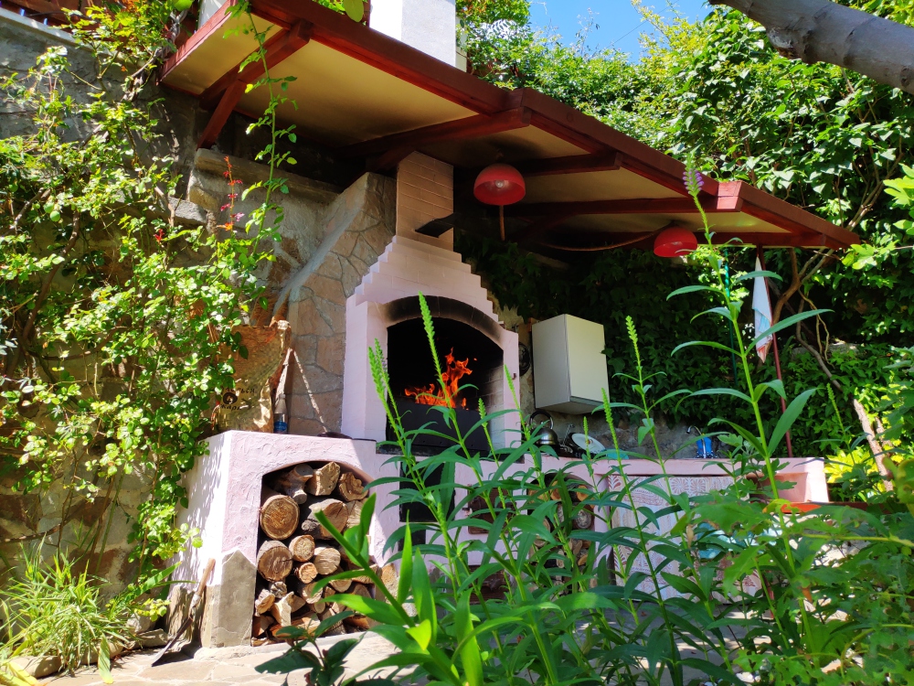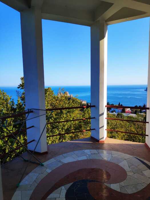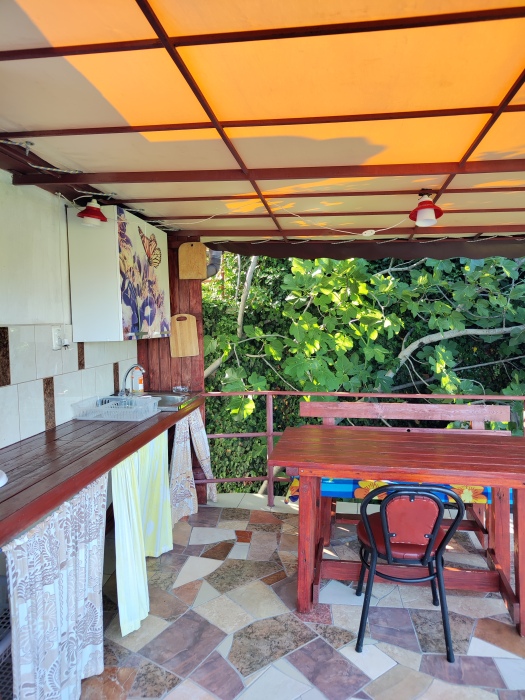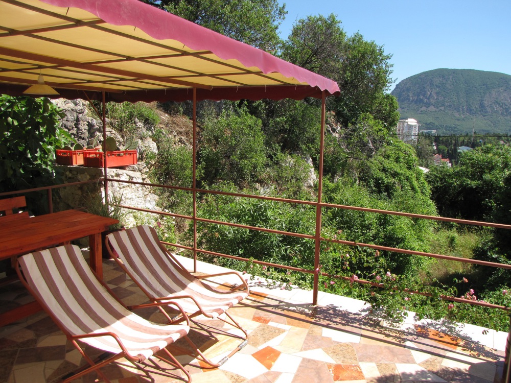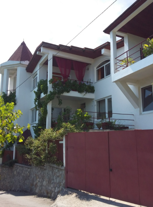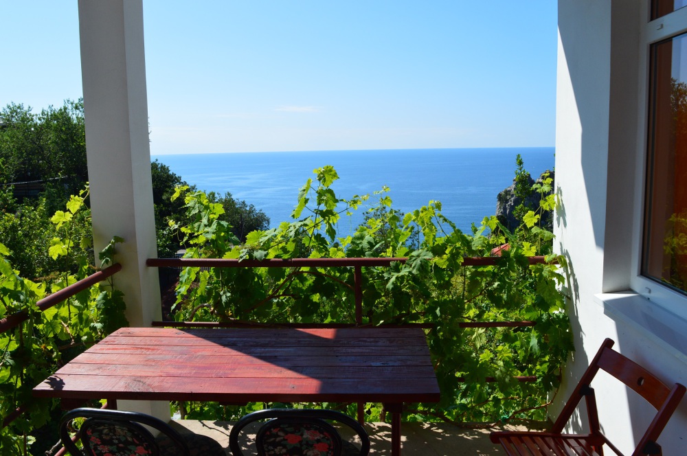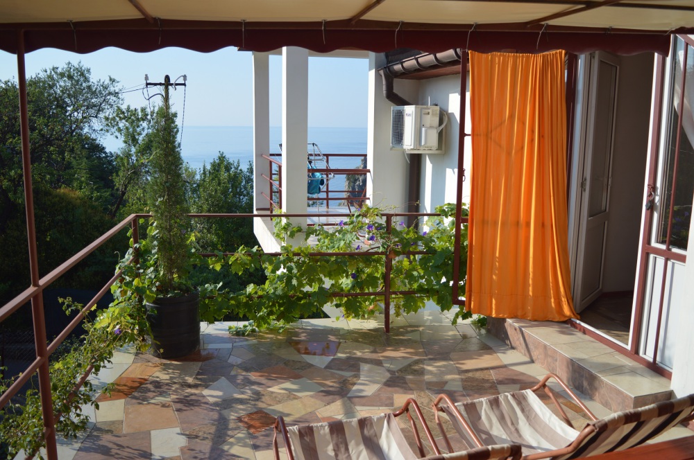 Огороженный живописный двор, есть барбекю, пруд с рыбками, видовая площадка. До пляжа 10-12 минут спуститься, обратно 15-20 минут ( перед домом есть подъем).