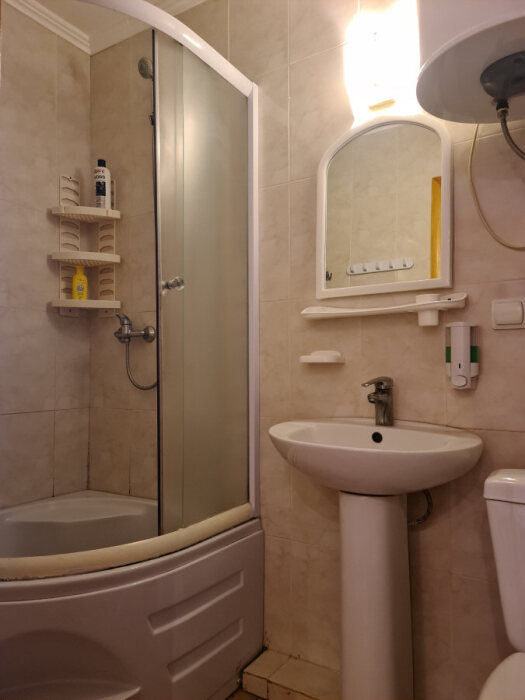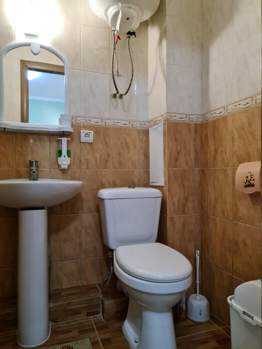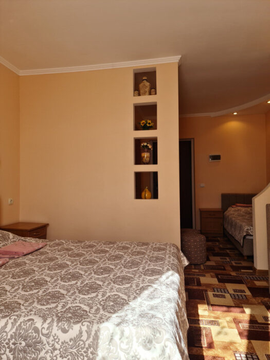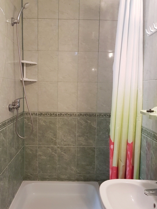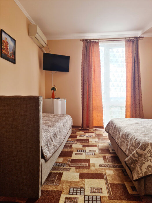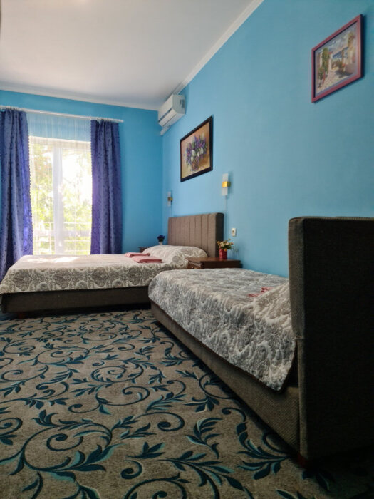 Просторный уютный номер с одной двуспальной и одной односпальной кроватью, постельным бельём и полотенцами, оборудованный всем необходимым для комфортного пребывания 3 человек, включая холодильник, кондиционер, кабельное телевидение, бесплатный WiFi и собственный санузел с душевой кабиной. Находится на 1-ом этаже и балкона не имеет.