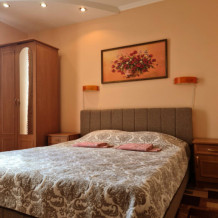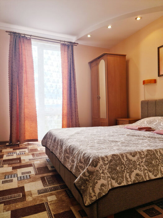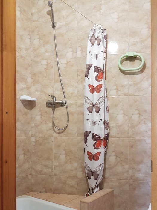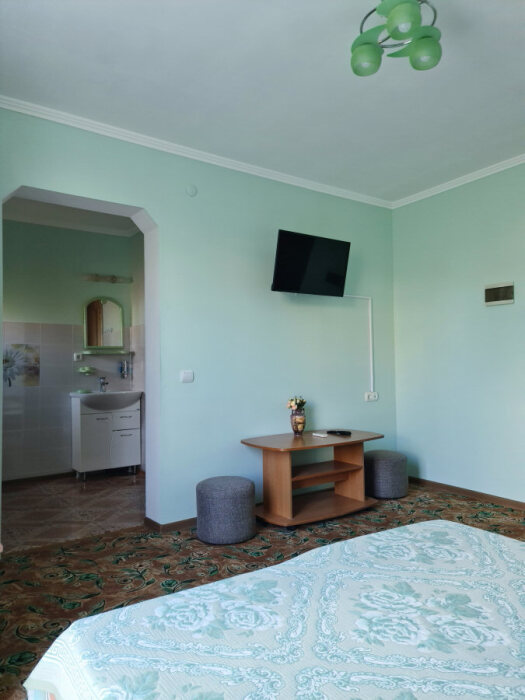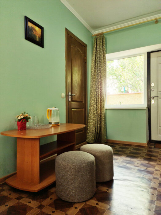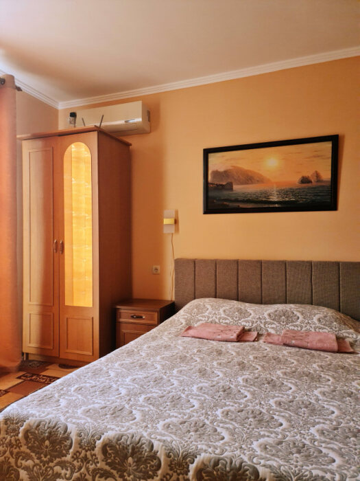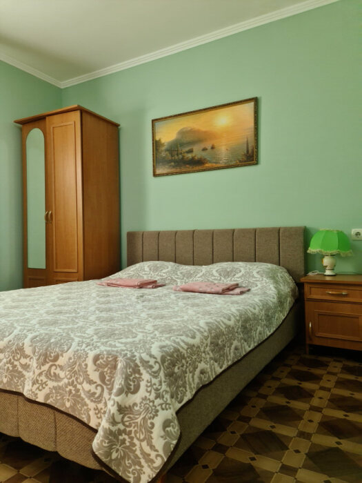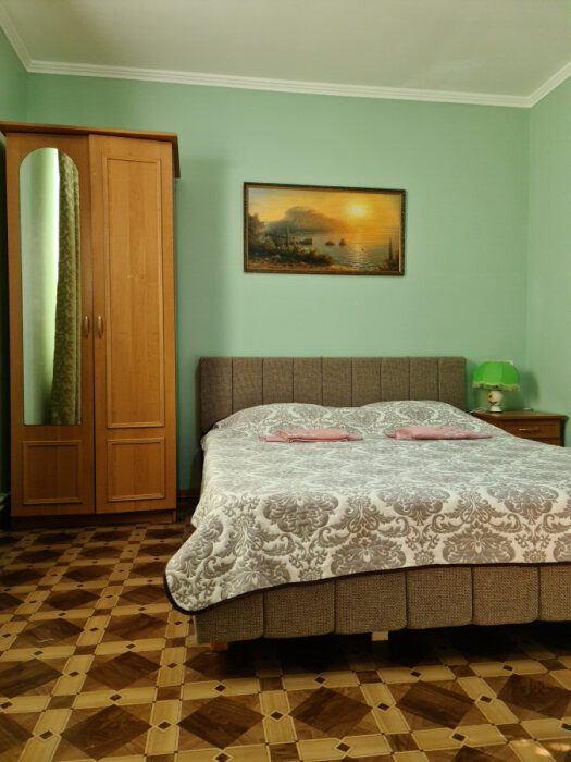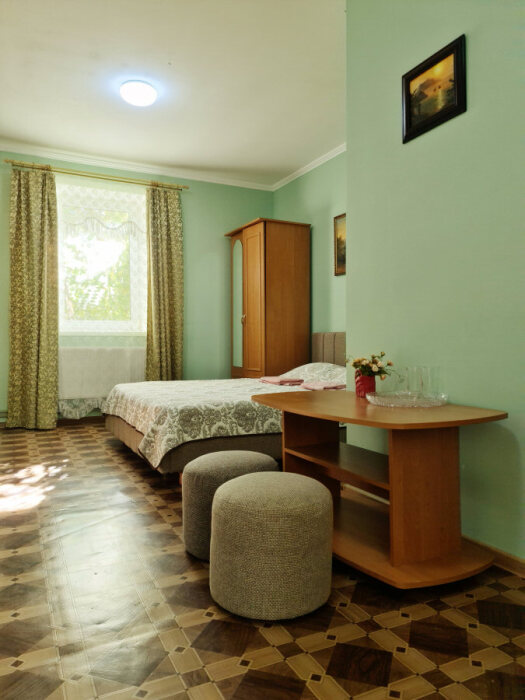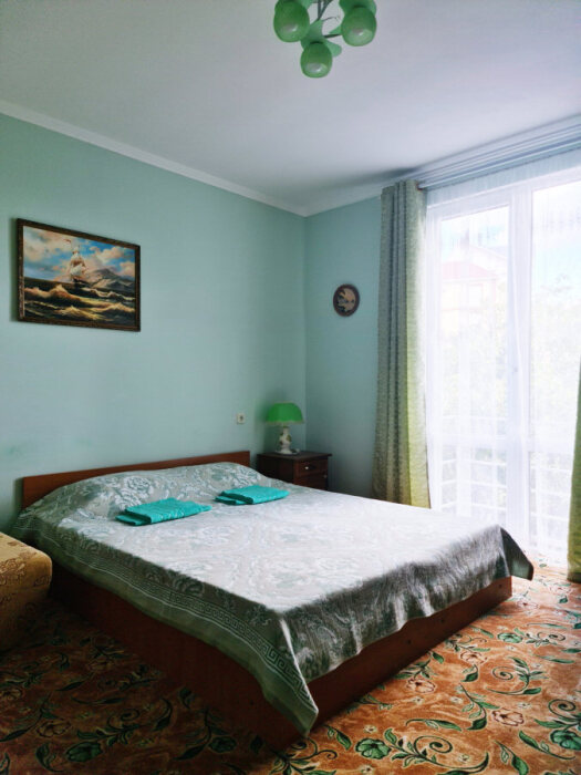 Просторный уютный номер с одной двуспальной и двумя односпальными кроватями, постельным бельём и полотенцами, оборудованный всем необходимым для комфортного пребывания 3-4 человек, включая холодильник, кондиционер, кабельное телевидение, бесплатный WiFi и собственный санузел с душевой кабиной. В номерах 2-го и 3-го этажей имеются балконы с видом на море и окружающие горы.