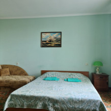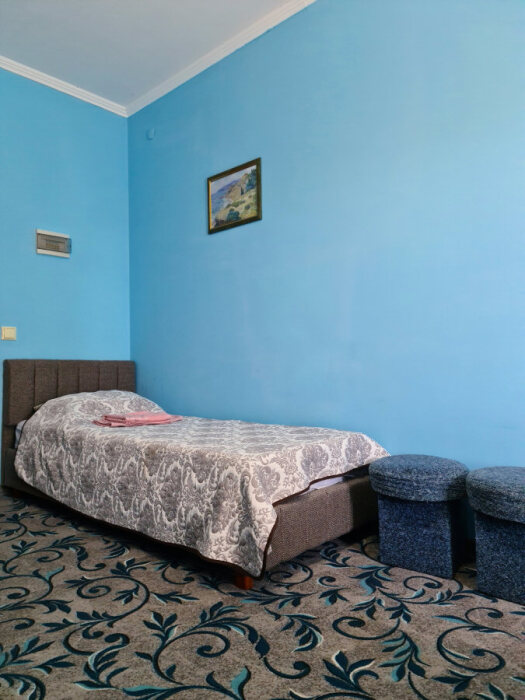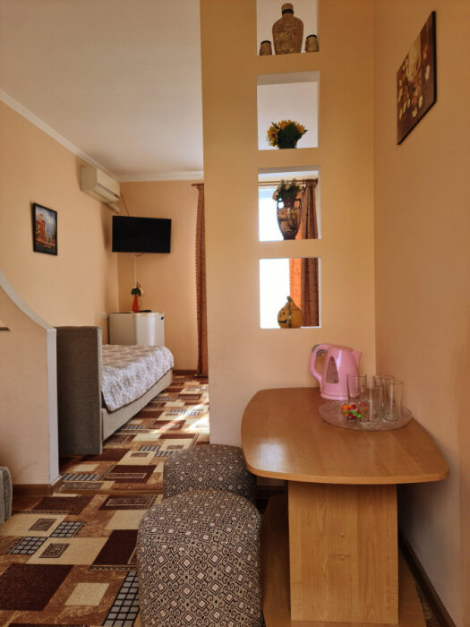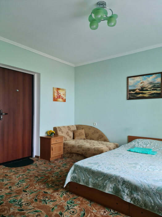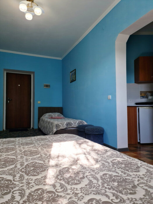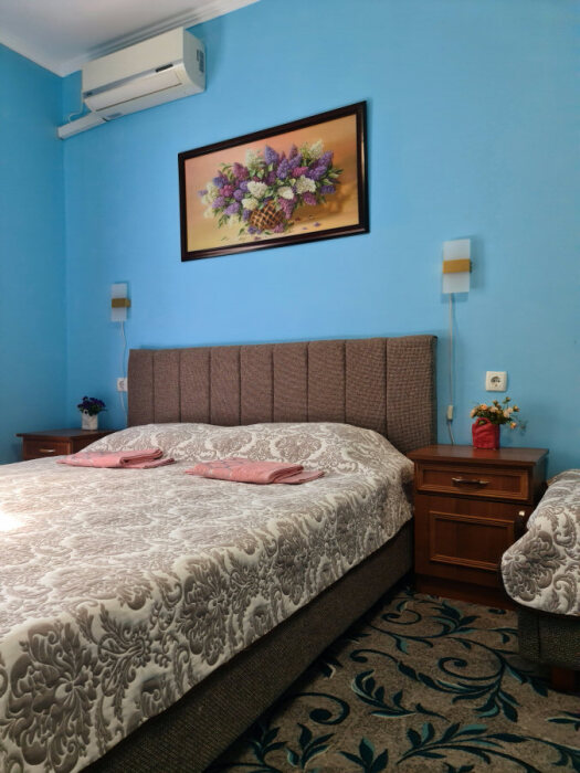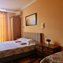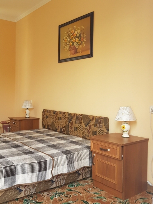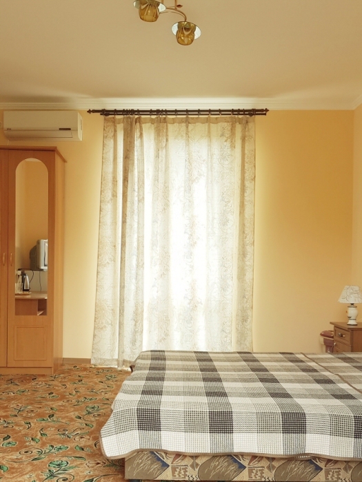 Просторный уютный номер с двуспальной кроватью и небольшим диваном, постельным бельём и полотенцами, оборудованный всем необходимым для комфортного пребывания 1-2 человек, включая холодильник, кондиционер, кабельное телевидение, бесплатный WiFi и собственный санузел с душевой кабиной. В номерах 2-го и 3-го этажей имеются балконы с видом на море и окружающие горы.