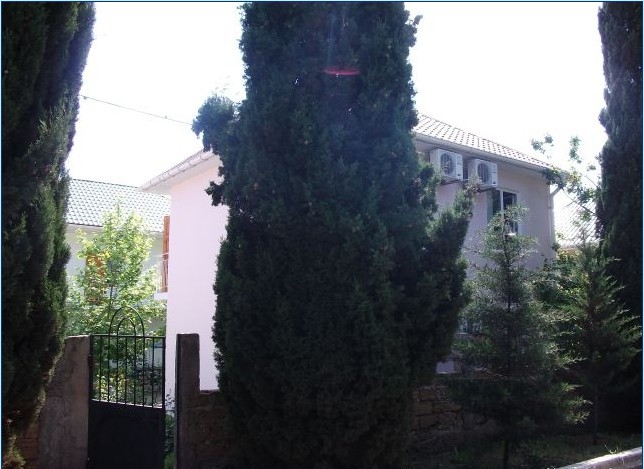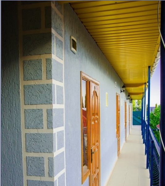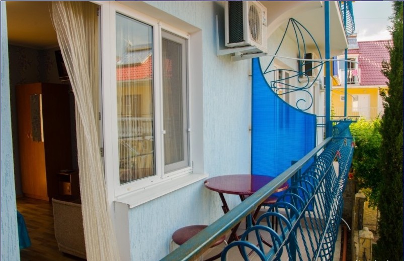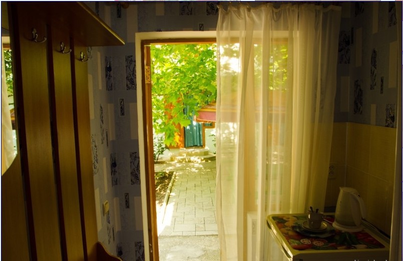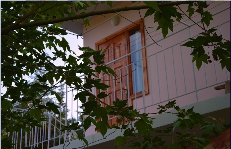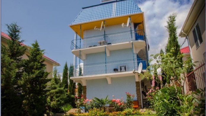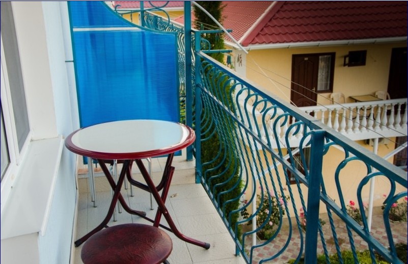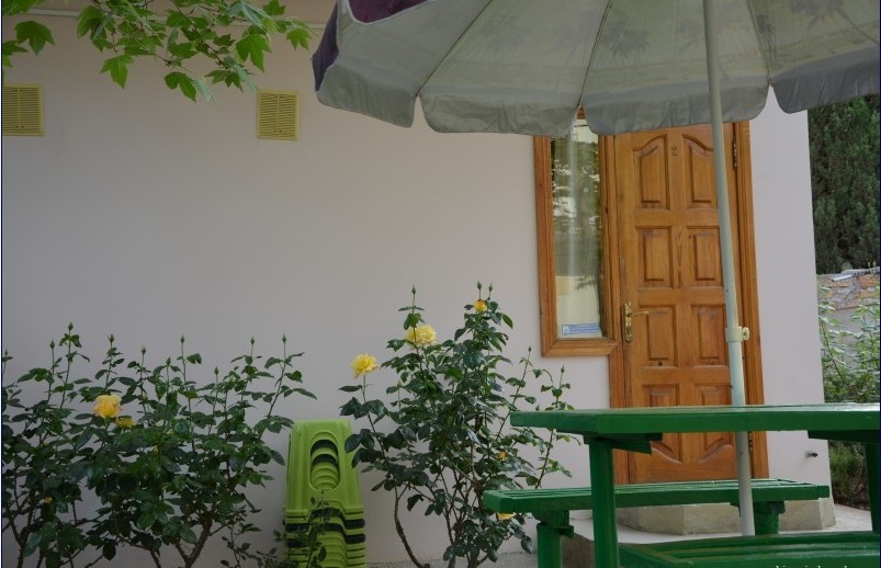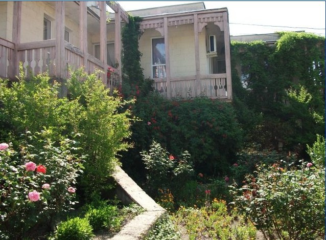 В пансионате имеется собственный дворик со столиками в тени платанов и лужайкой. Территория засажена кипарисами, пальмами, кустами лавровишни, розмарина и туи, а так же розами и различными цветами.