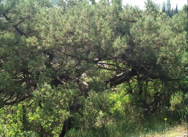 Вечером можно наблюдать, как солнце садится за гору, на которой раскинулась можжевеловая роща, и освещает своими лучами вечернее небо.