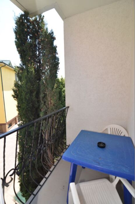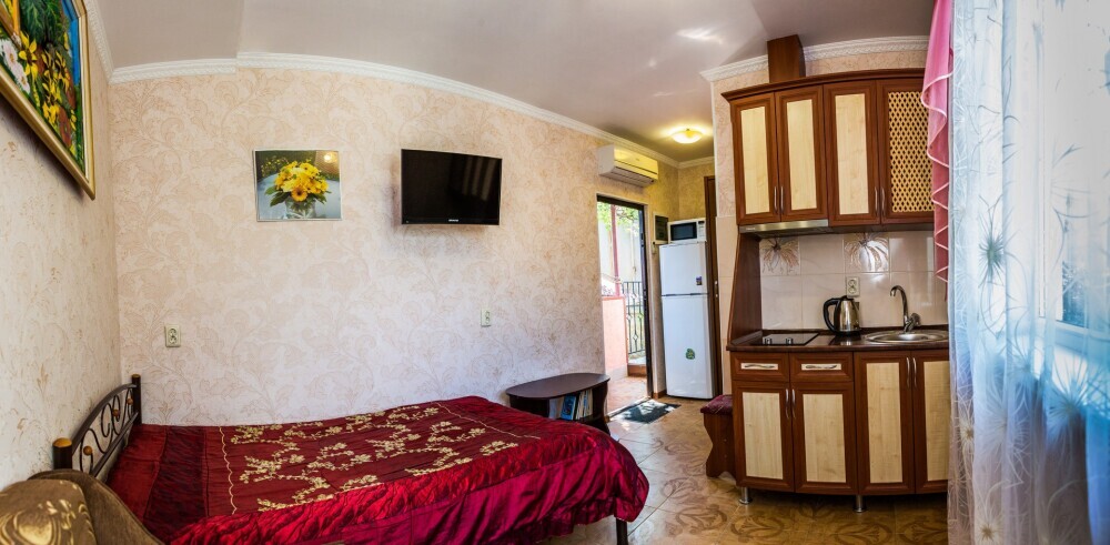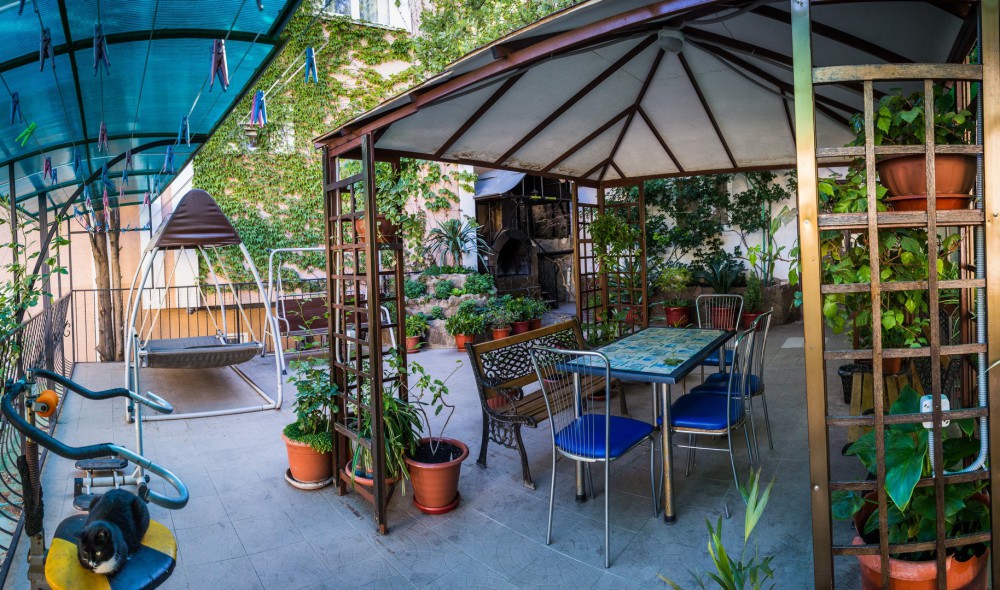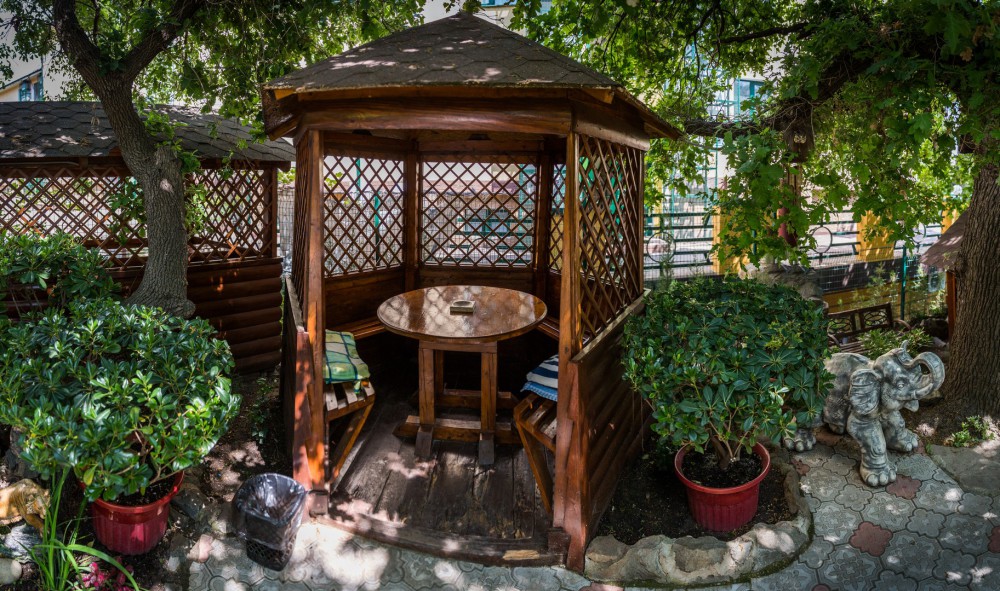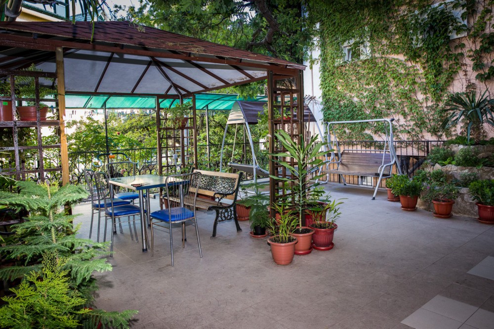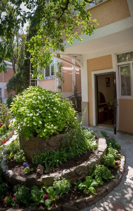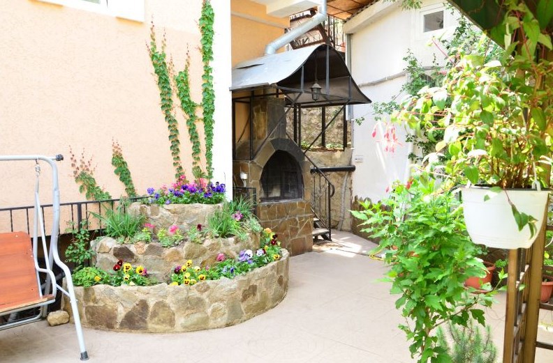 Гостевой дом представляет собой очень уютное небольшое здание с частным двором. Внутри он весь буквально утопает в зелени цветов и декоративных насаждений. Здесь же располагаются удобный гамак с козырьком, беседка с уличной пластиковой мебелью, мангал с дровяной печью, парковка и многое другое, что сделает Ваш отдых комфортным и приятным.