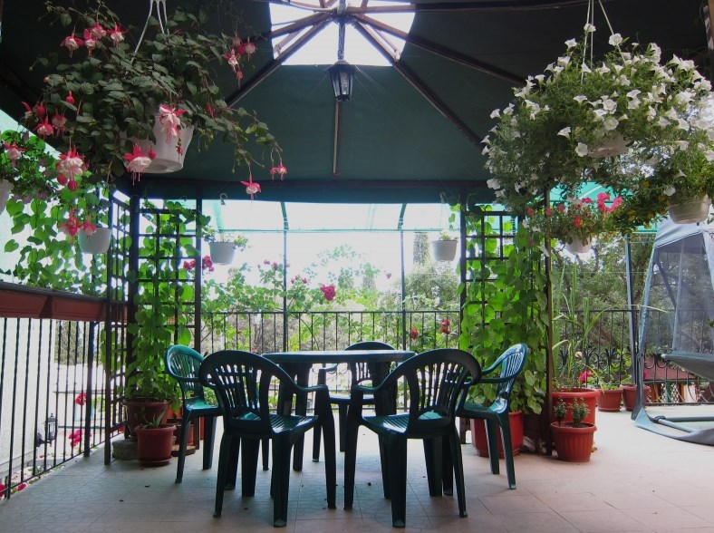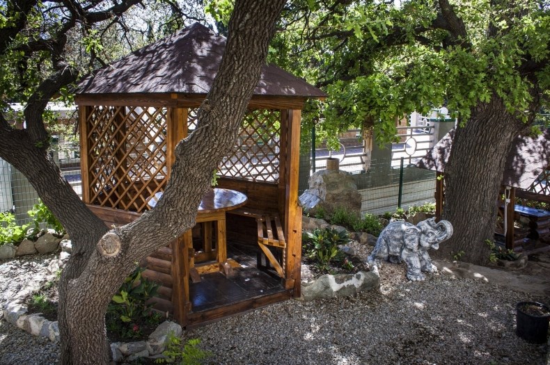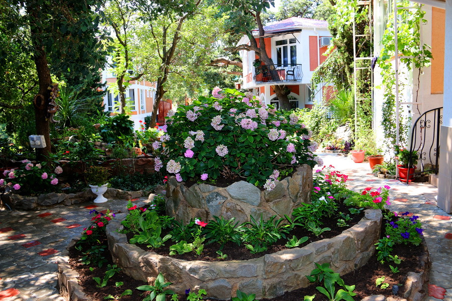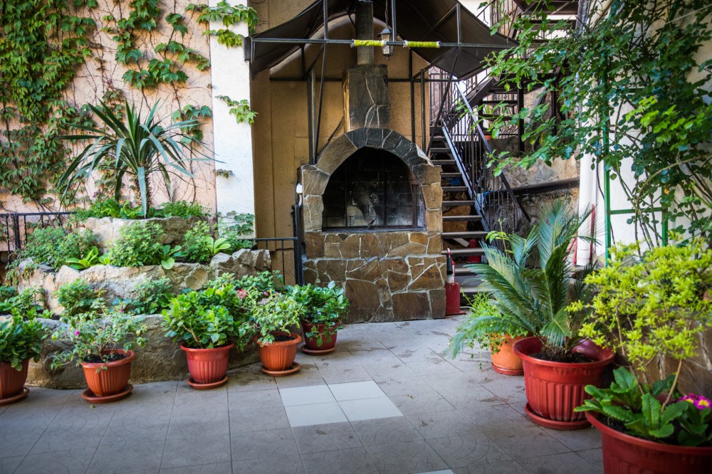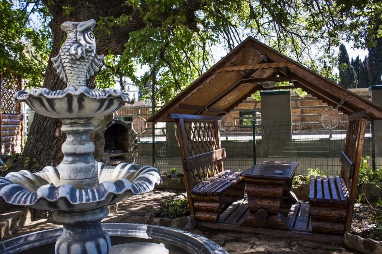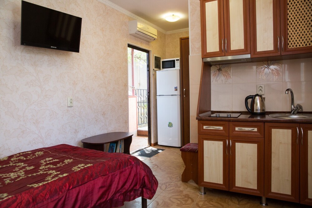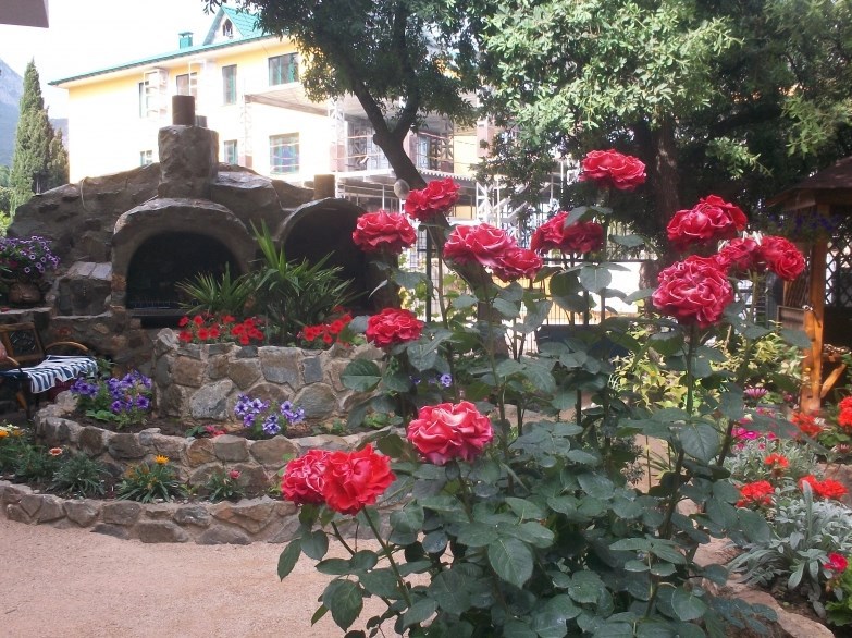 Гостевой дом представляет собой очень уютное небольшое здание с частным двором. Внутри он весь буквально утопает в зелени цветов и декоративных насаждений. Здесь же располагаются удобный гамак с козырьком, беседка с уличной пластиковой мебелью, мангал с дровяной печью, парковка и многое другое, что сделает Ваш отдых комфортным и приятным.
