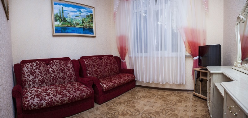 В комнате поменьше - двуспальная кровать, 1,5-спальный раскладной диван, трюмо с зеркалом, телевизор, кондиционер, холодильник.