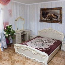 В большой комнате (с верандой): шикарная белая итальянская мебель - двуспальная кровать, шкаф, комод, 2 тумбочки, трюмо с зеркалом, 4 табурета, 2 стула, стол.