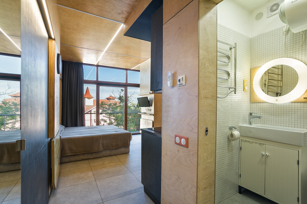 В студии двухспальная кровать и двухъярусная кровати. Оборудована полноценная зона кухни: встроенный холодильник, микроволновка, электрочайник, варочная поверхность, посудомоечная машина, посуда для принятия и приготовления пищи. В санузле бойлер и стиральная машина. Горячая и холодная вода круглосуточно. В летнее время от жары Вас спасет кондиционер, зимой и в межсезонье для комфорта используется теплый пол. Можно ходить босиком. Для комфортного отдыха в квартире имеется утюг, гладильная доска, фен, телевизор,Wi-FI, пылесос. Витражные окна в пол, французский балкон открывают шикарный вид на море и скалу Дива. Можно устроиться перед французским балконом воспользоваться раскладным столиком и за чашечкой кофе или бокалом вина наслаждаться видами на Симеизскую бухту.