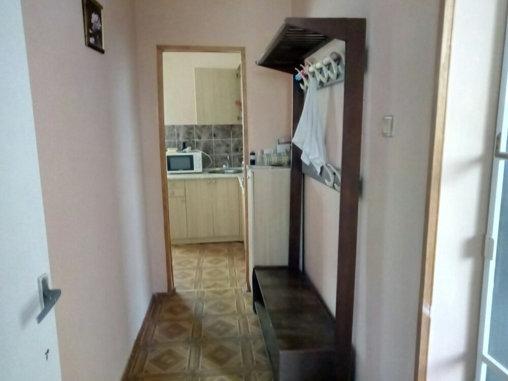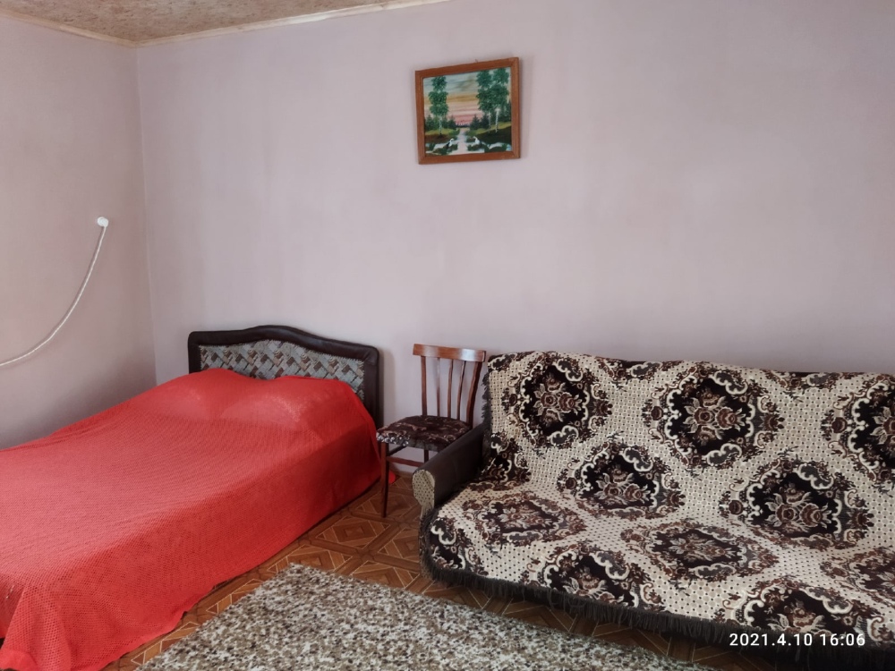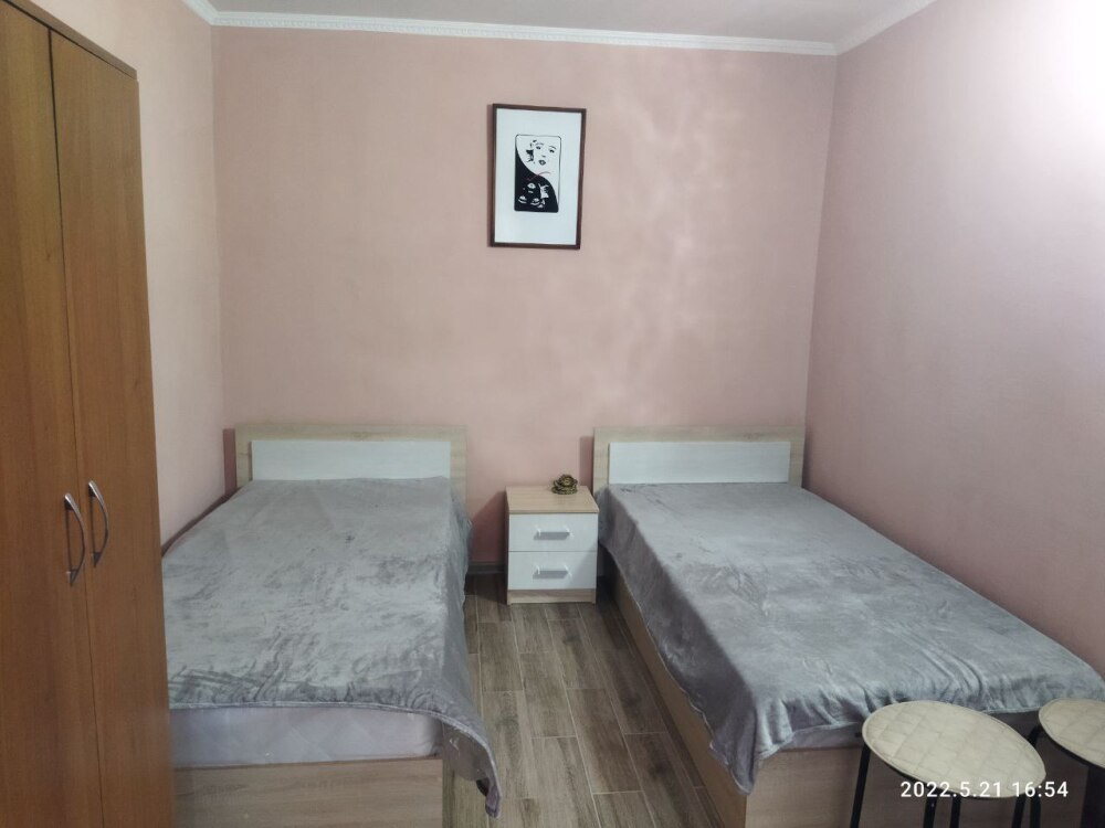 На первом этаже кухня и комната. В комнате 2 полуторные кровати, шкаф, стол и кресло. Кухня совмещает место для приготовления и столовую, посуда предоставляется.