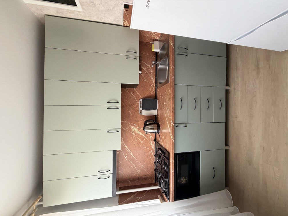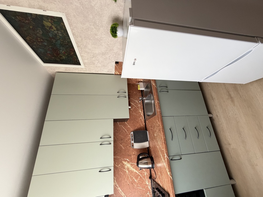 На кухне Вы найдете все необходимое: плиту, кастрюли, сковороды и посуду. Есть также микроволновая печь для удобного подогрева блюд.
