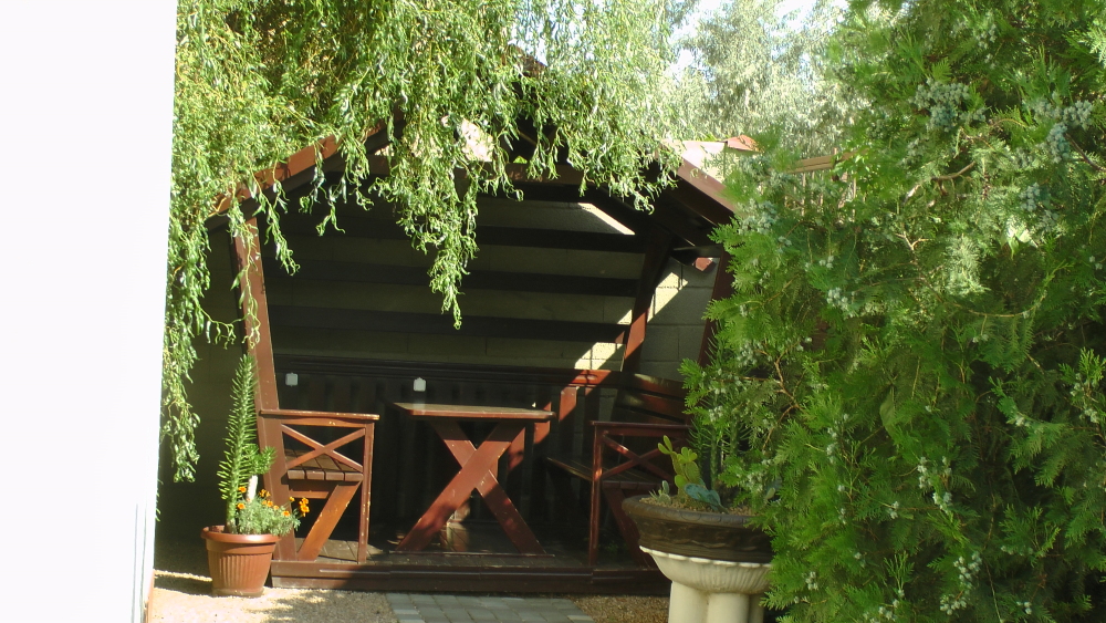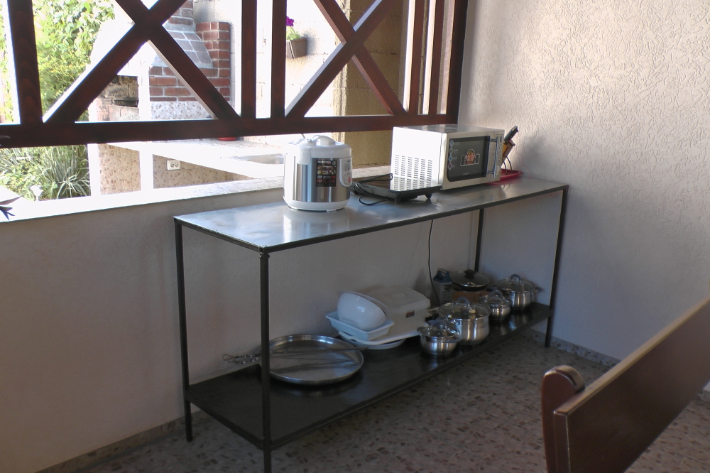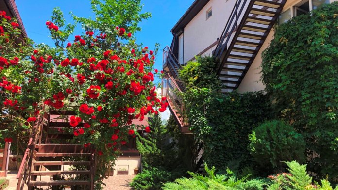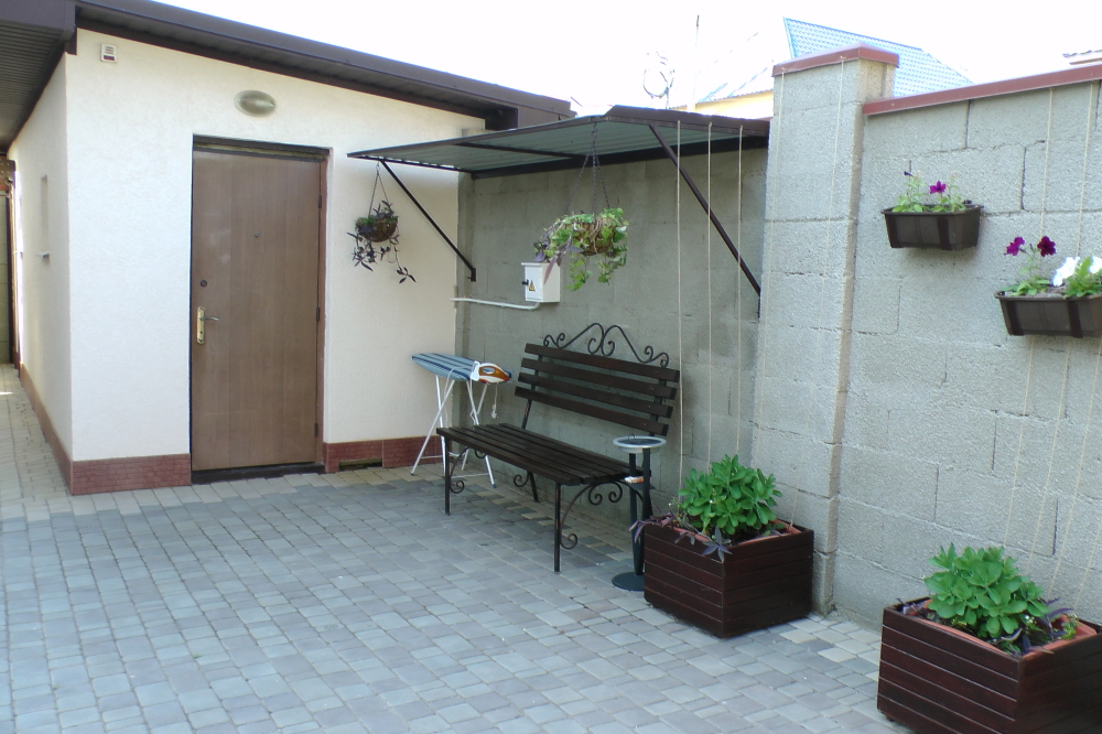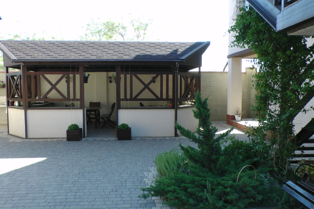 Территория озеленена клумбами с цветами и множеством цветов в горшках. Имеется большая беседка и оборудованный мангал для шашлыков.