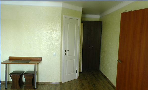 В номерах современная деревянная мебель, выдержанная в едином стиле. Кровати с ортопедическими матрасами, встроенный шкаф с высокими полками для размещения чемоданов, столик с табуретками, прикроватные полочки