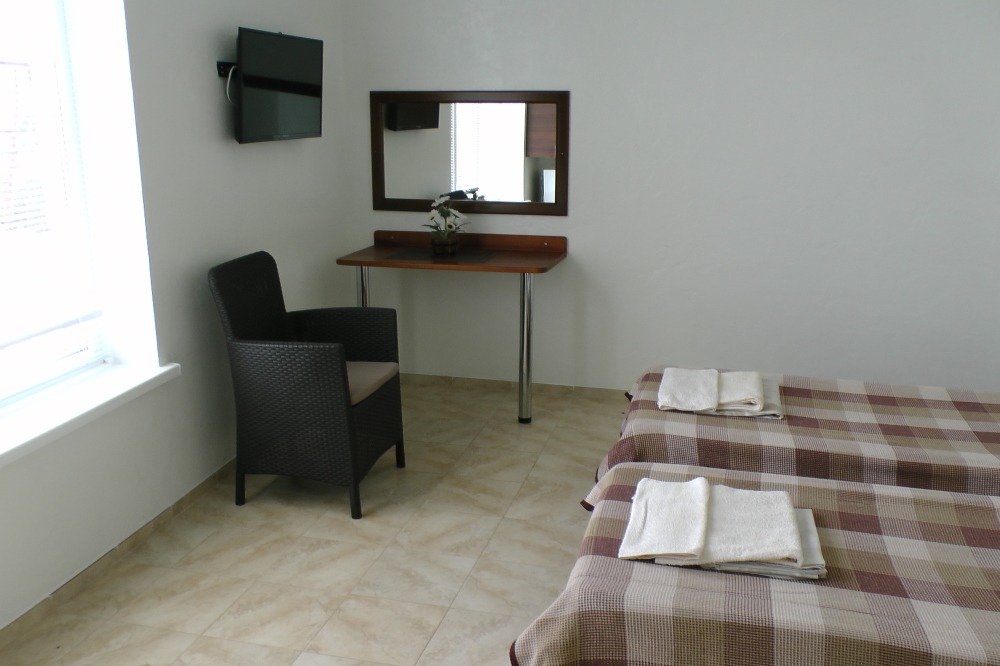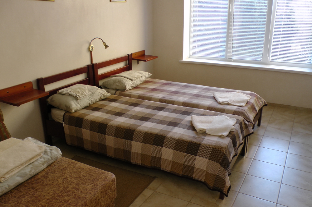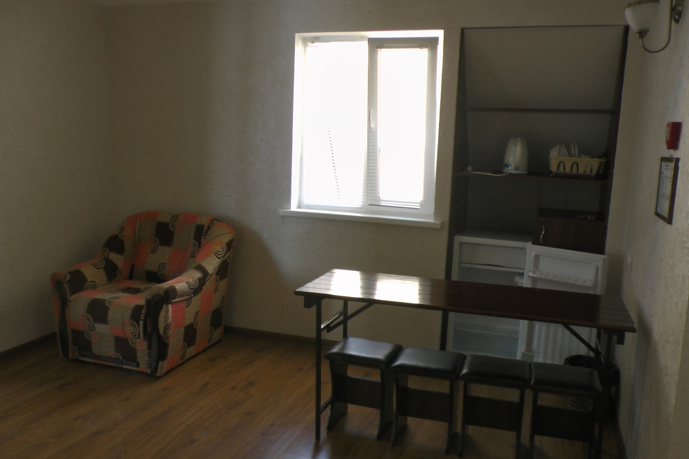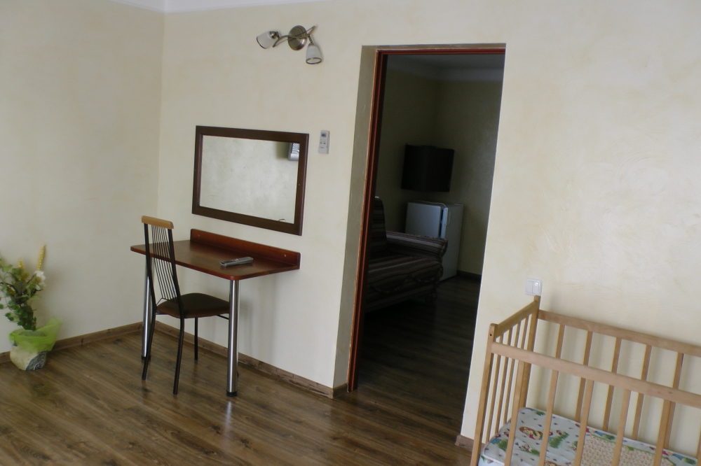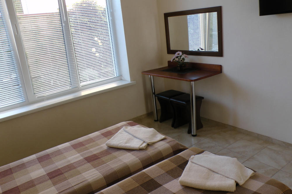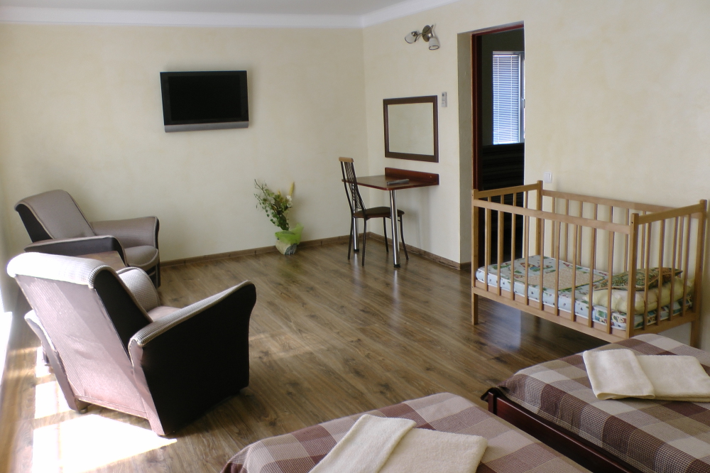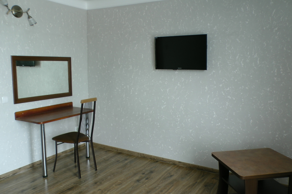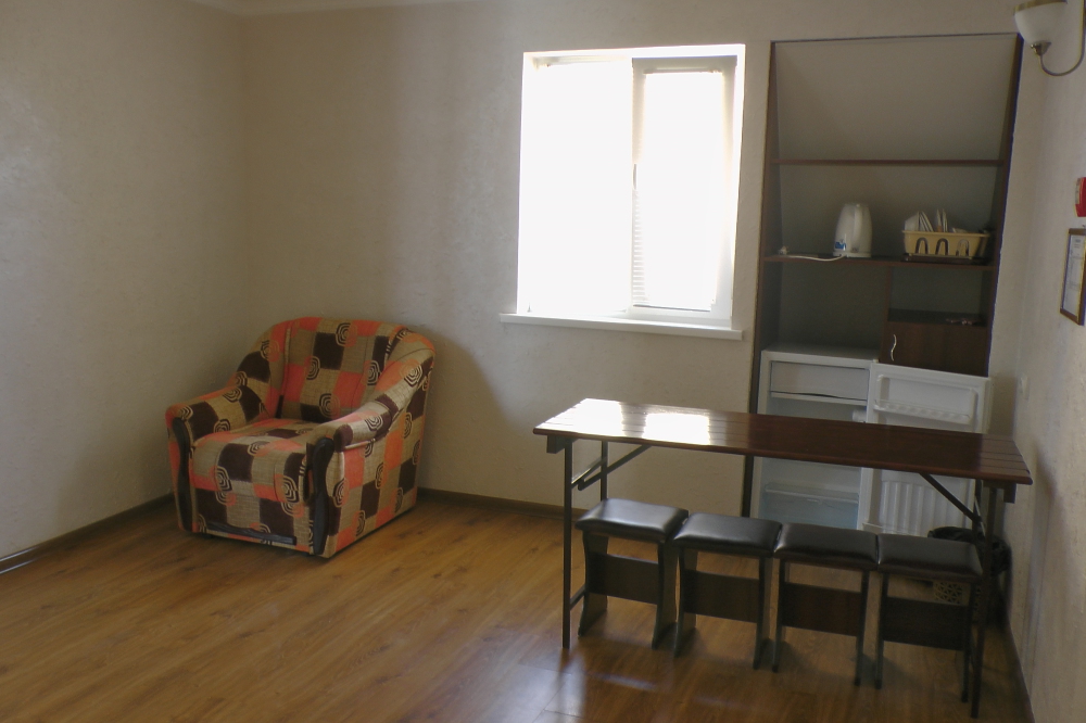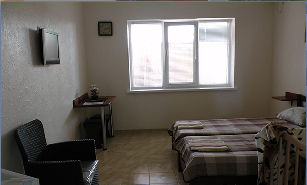 В номерах современная деревянная мебель, выдержанная в едином стиле. Кровати с ортопедическими матрасами, раскладные диванчики, встроенный шкаф с высокими полками для размещения чемоданов, столик с табуретками, прикроватные полочки - такой стандартный набор мебели расположен в номере. В санузлах однокомнатных номеров расположены душевые поддоны, туалет и умывальник, в двухкомнатных номерах – душевые кабины, туалет и умывальник. В каждом номере - фен, туалетные принадлежности, тапочки. На окнах -москитные сетки. Возле каждого номера- раздвижные вешалки для белья и полотенец. Номера оборудованы противопожарной сигнализацией.