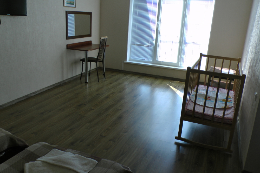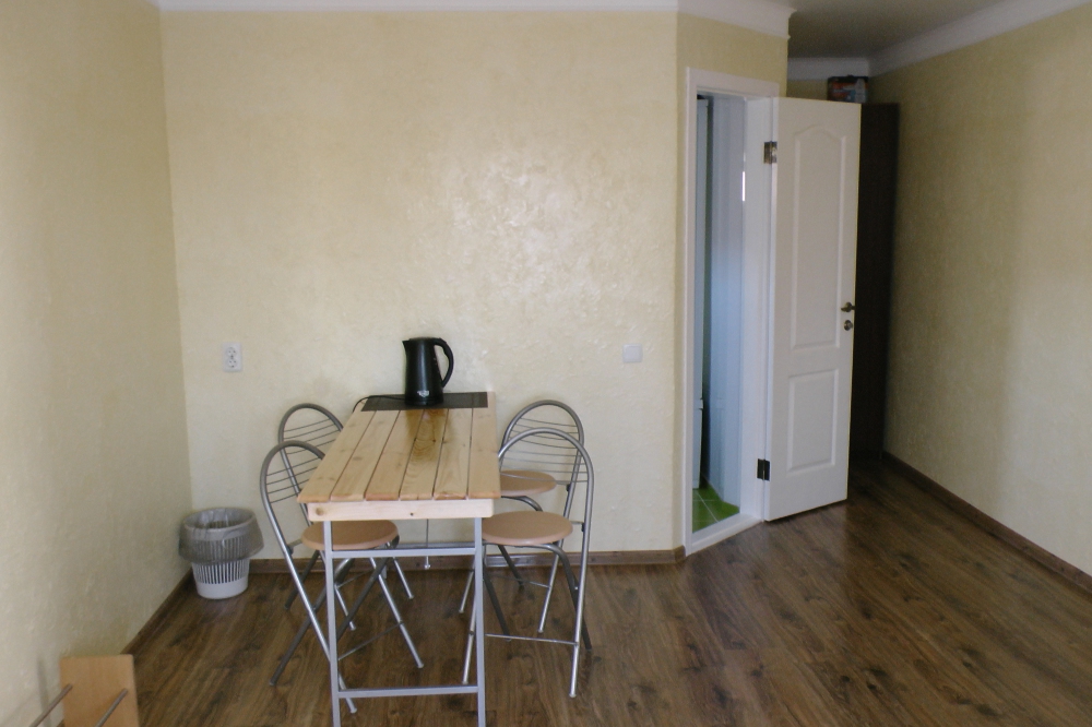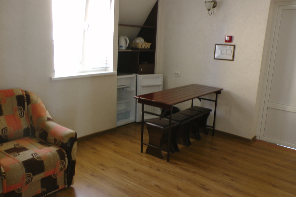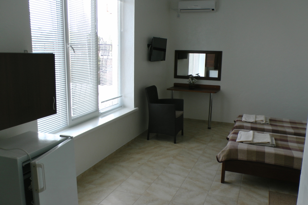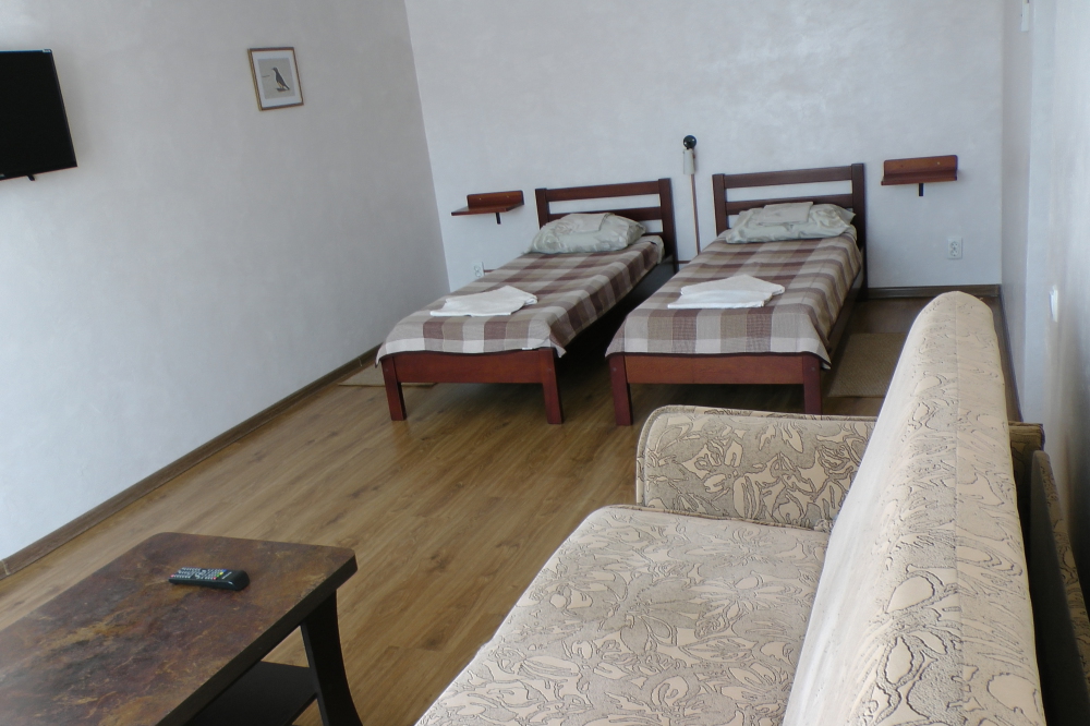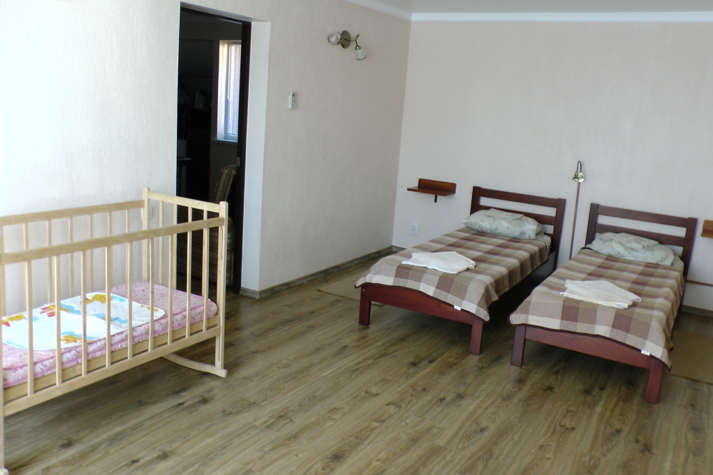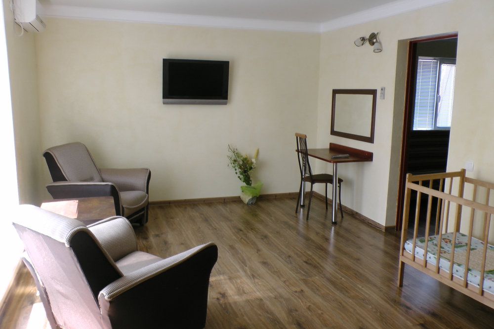 В номерах современная деревянная мебель, выдержанная в едином стиле. Кровати с ортопедическими матрасами, раскладные диванчики, встроенный шкаф с высокими полками для размещения чемоданов, столик с табуретками, прикроватные полочки - такой стандартный набор мебели расположен в номере. В санузлах однокомнатных номеров расположены душевые поддоны, туалет и умывальник, в двухкомнатных номерах – душевые кабины, туалет и умывальник. В каждом номере - фен, туалетные принадлежности, тапочки. На окнах -москитные сетки. Возле каждого номера- раздвижные вешалки для белья и полотенец. Номера оборудованы противопожарной сигнализацией.