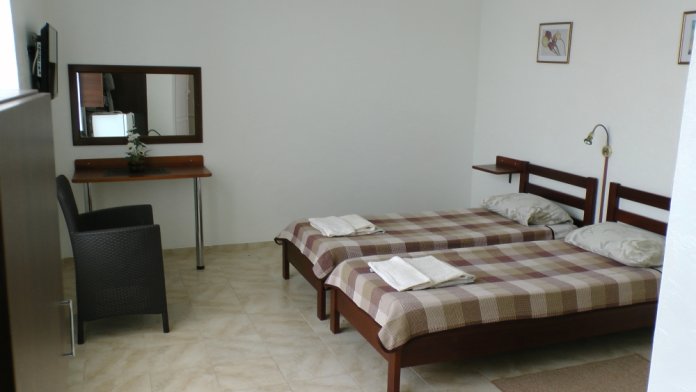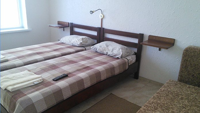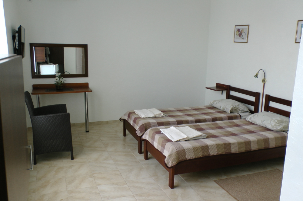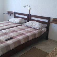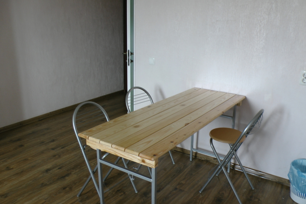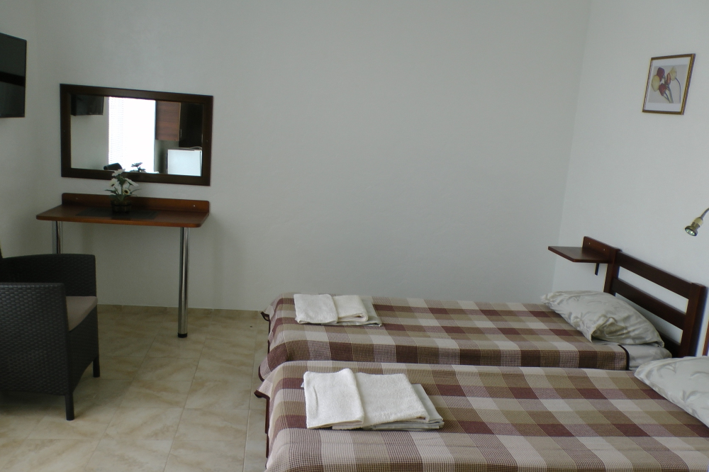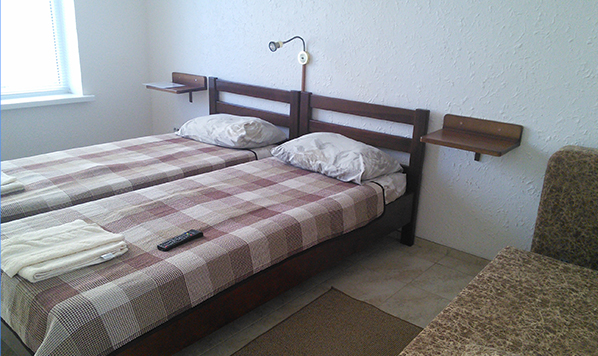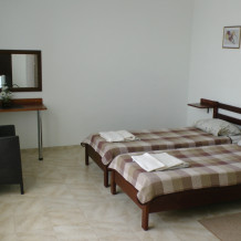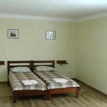 В номерах современная деревянная мебель, выдержанная в едином стиле. Кровати с ортопедическими матрасами, раскладные диванчики, встроенный шкаф с высокими полками для размещения чемоданов, столик с табуретками, прикроватные полочки.