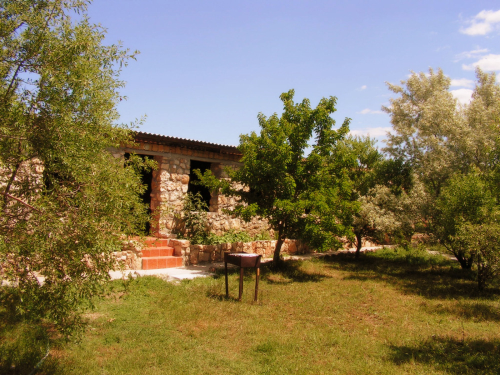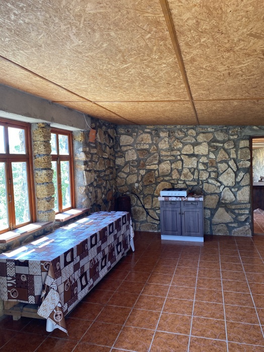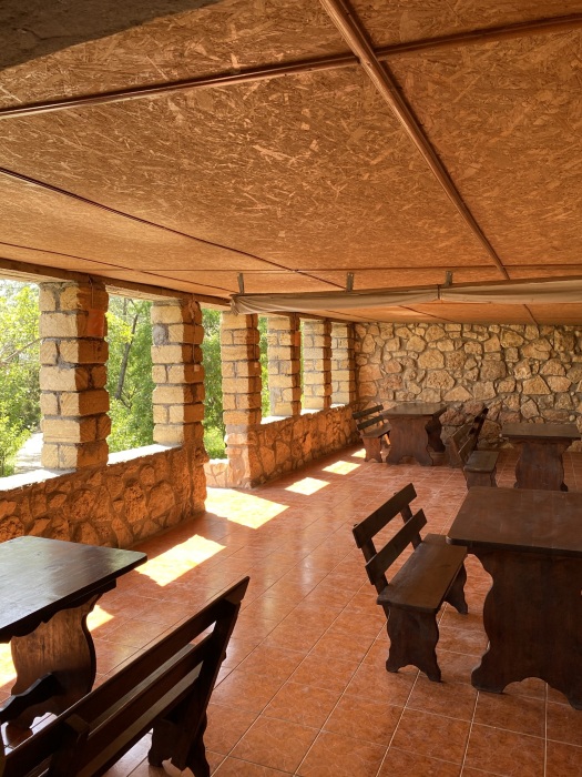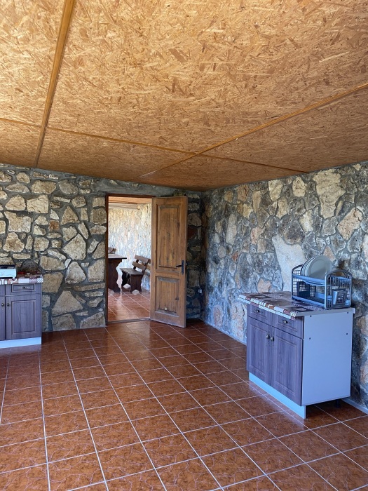 Весь наш участок огорожен красивым высоким забором (2,5 м) из природного камня. Внутри находится фруктовый сад. В нем множество деревьев: слива, вишня, миндаль, абрикос, шелковица. Также на участке есть детская площадка с песочницей и просторная веранда (4,5 х 13 м) с теннисным столом.