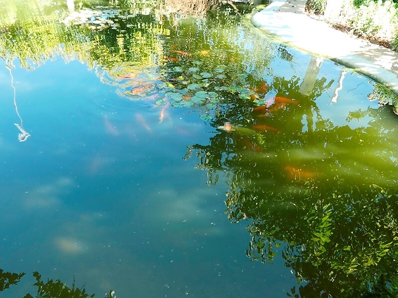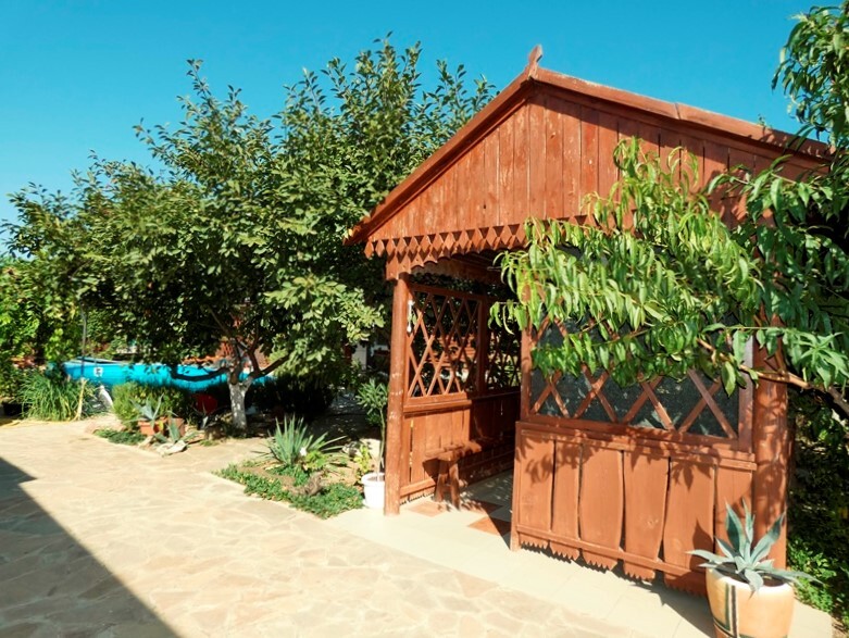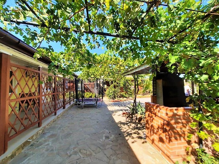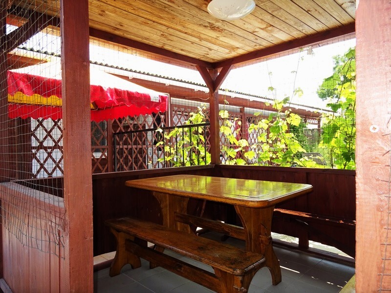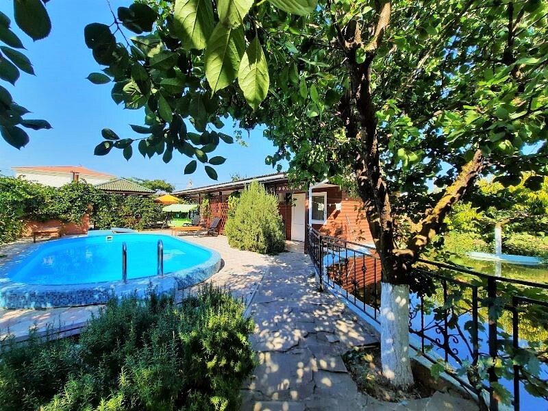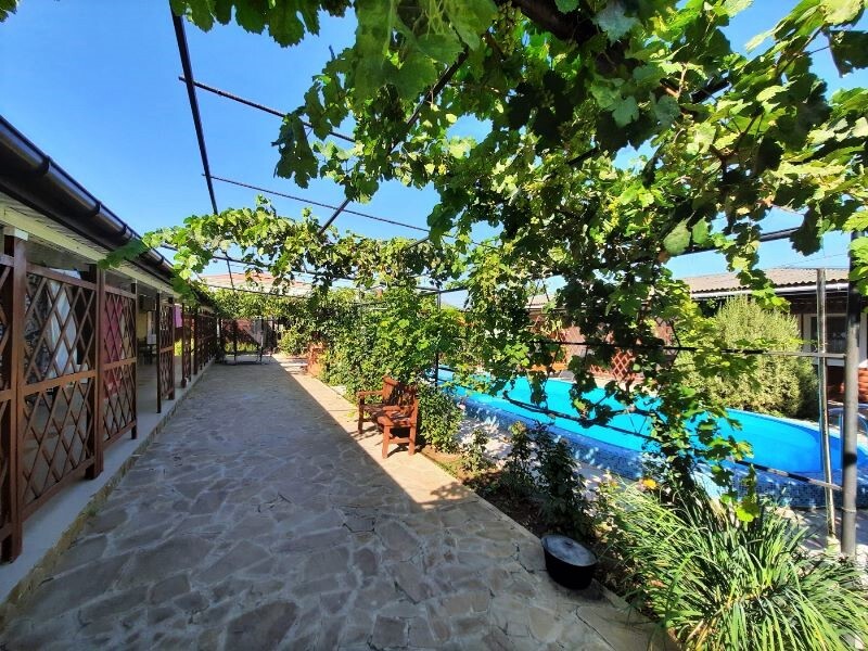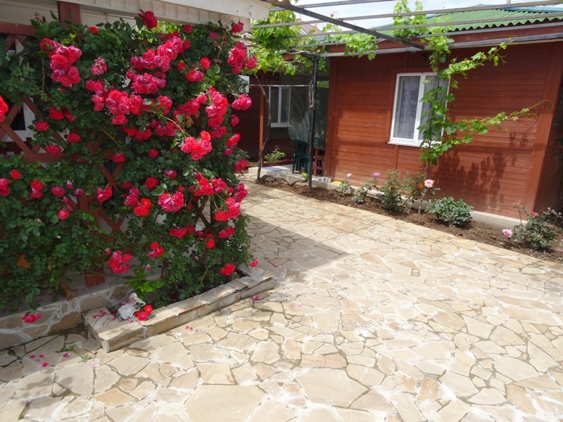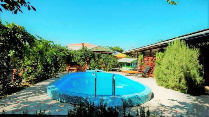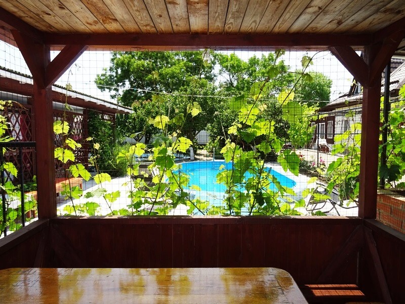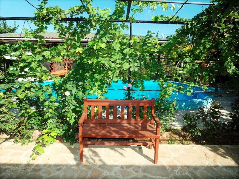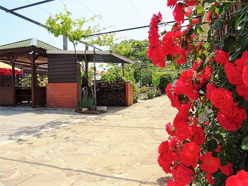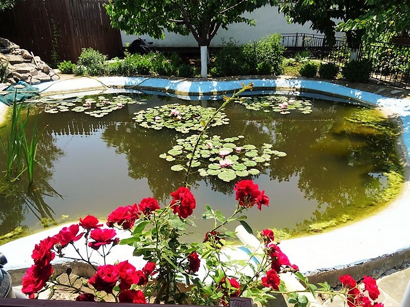 Двор гостевого дома поражает большим количеством зелени: много плодовых деревьев и цветов, есть виноградник. Изюминкой красивого ландшафта можно назвать большой пруд с рыбками и водопадом.