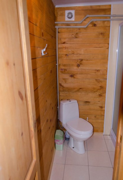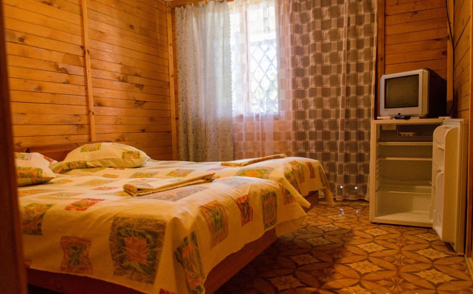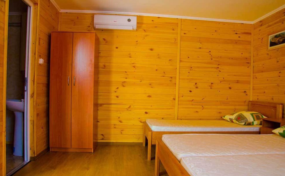 В деревянном корпусе находятся двухместные номера, в которых есть две деревянные кровати, гардероб, полочки, телевизор, холодильник, кондиционер, душевая кабинка, умывальник и туалет.