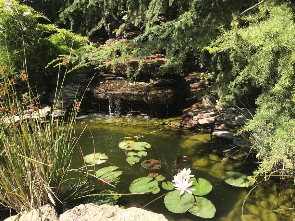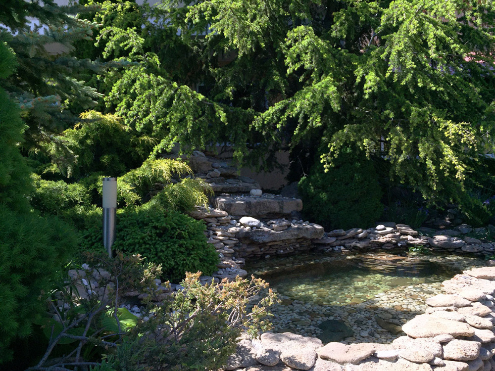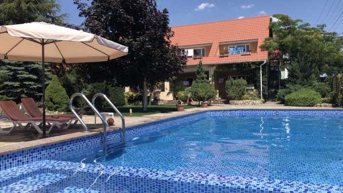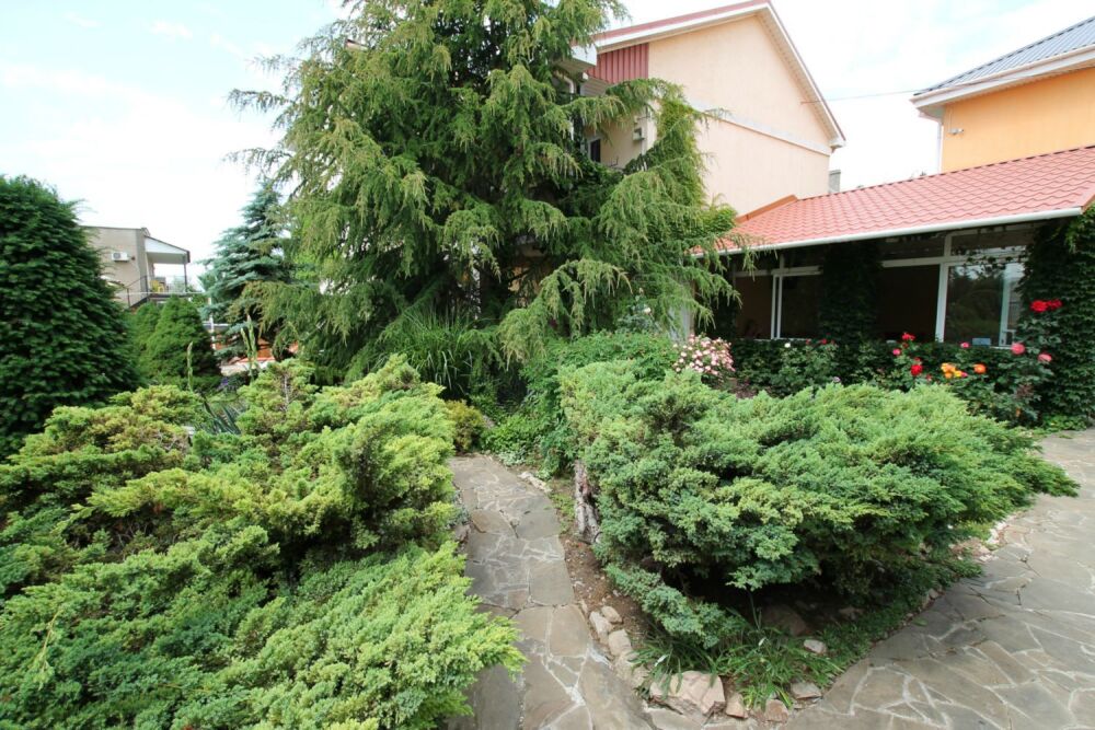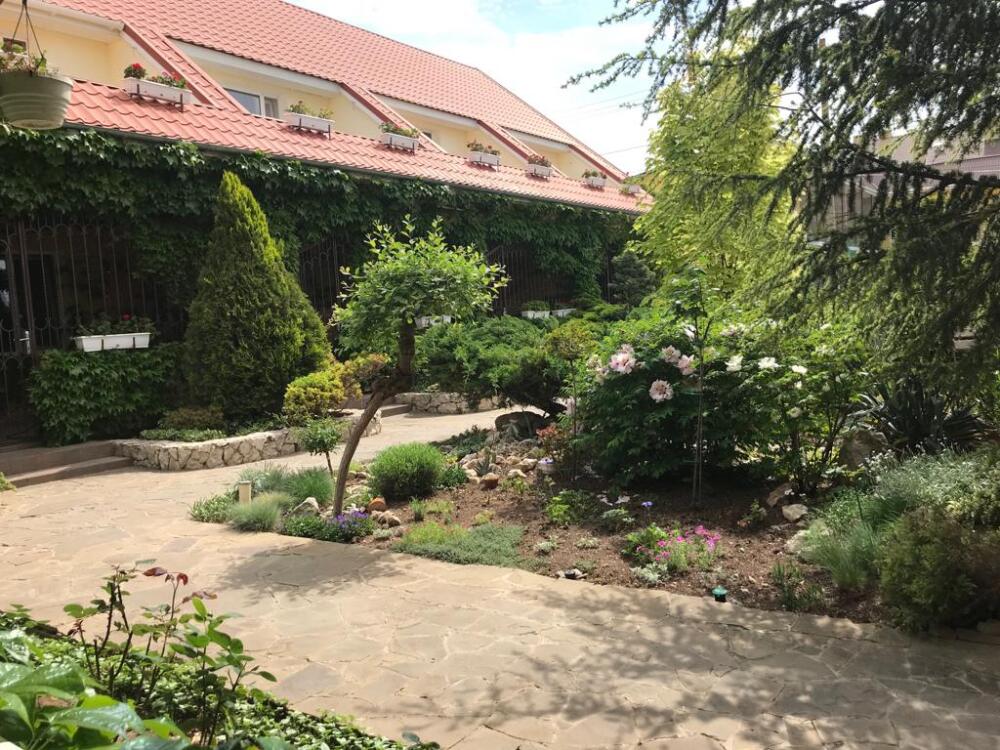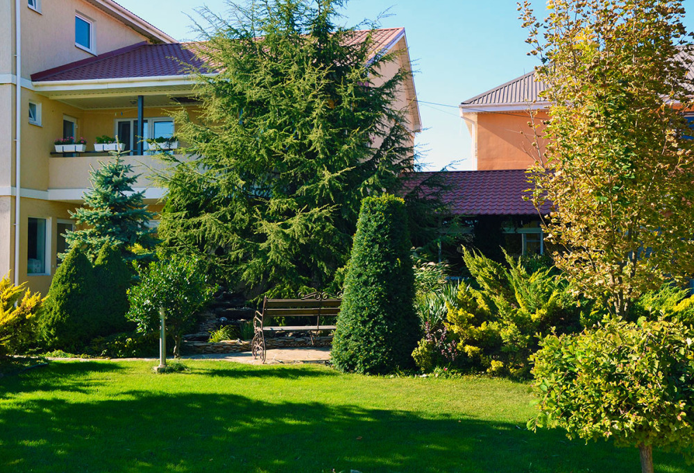 Территория огорожена. Во дворе красивый ландшафт, пруд, большой стационарный бассейн с подогревом (размер 10*4,5 метров, отделена детская зона, встроены гидромассаж и противоток), шезлонги (теневой зонт), детская площадка, батут, столовая с кондиционером и TV. Парковка рядом (бесплатно). Бесплатный wi-fi интернет.