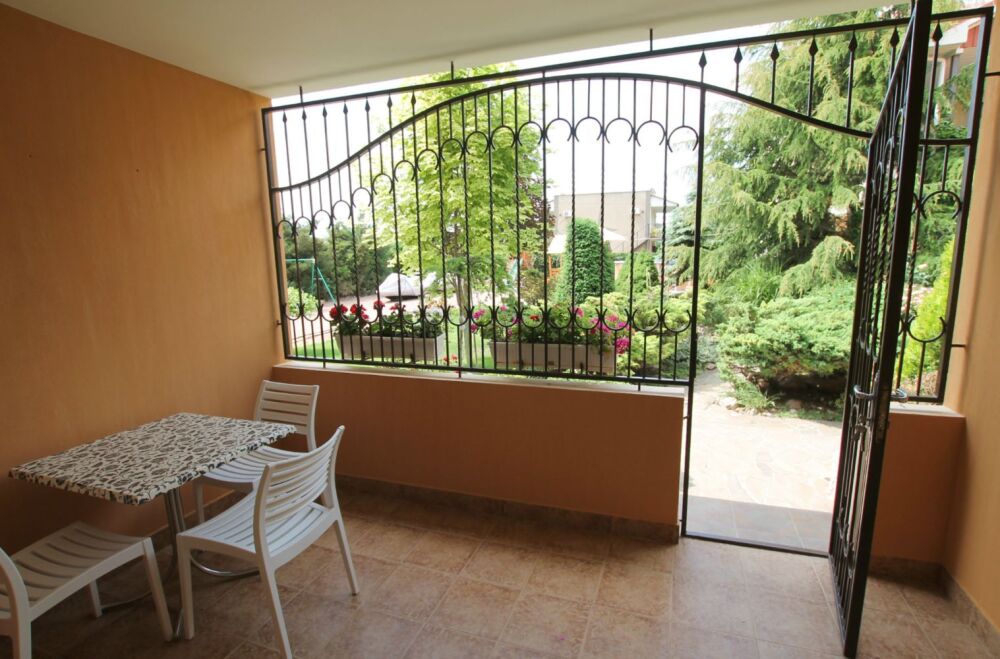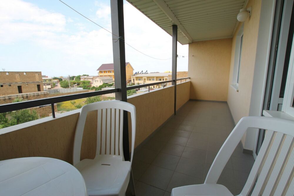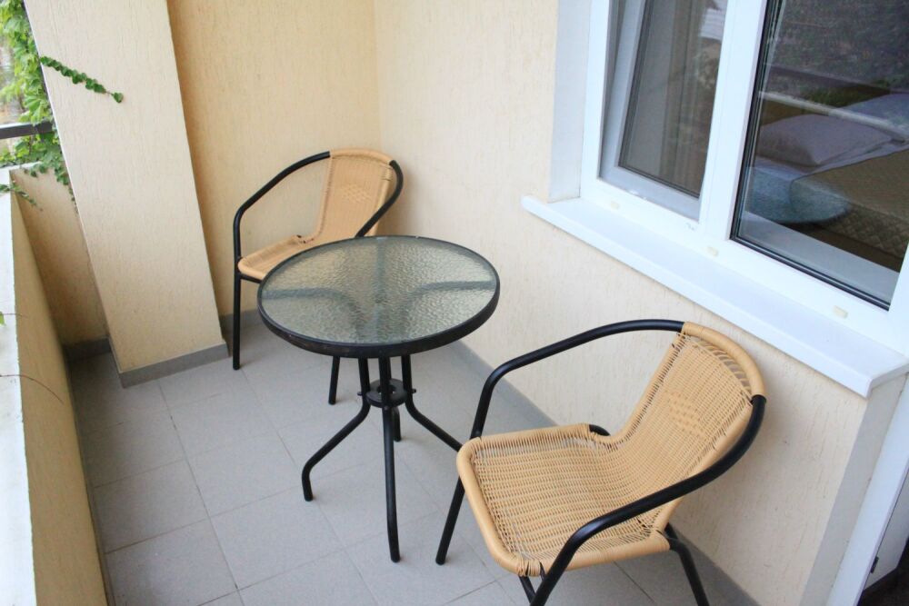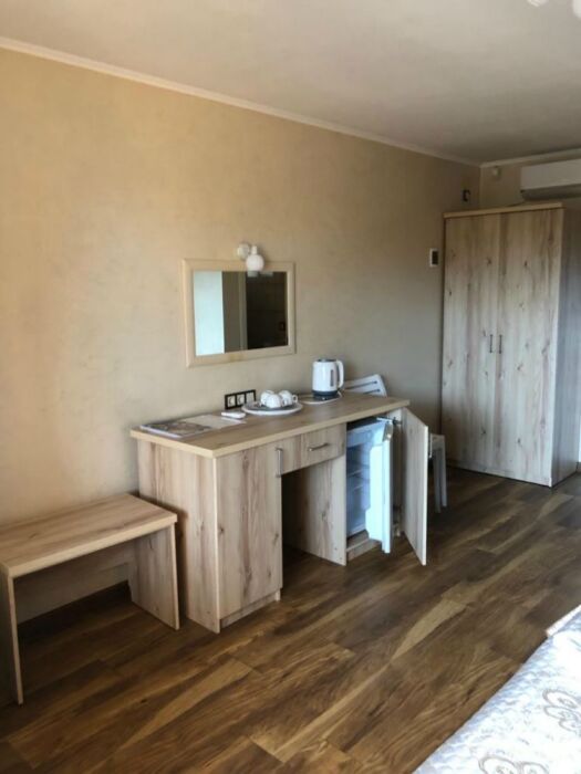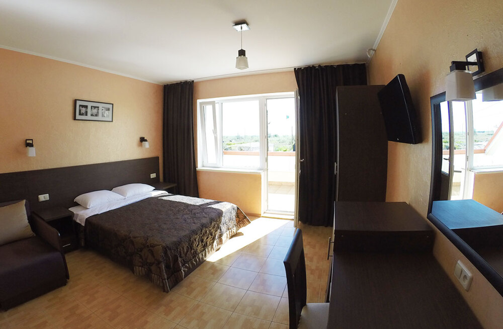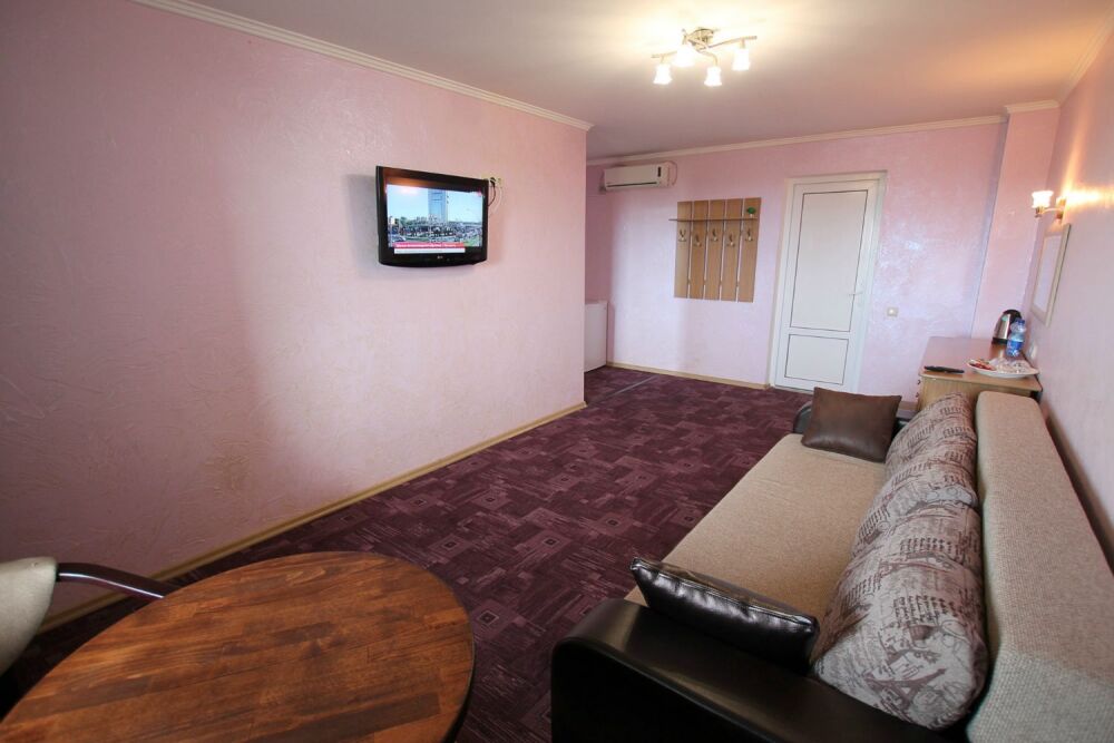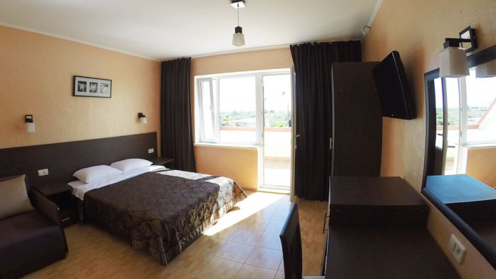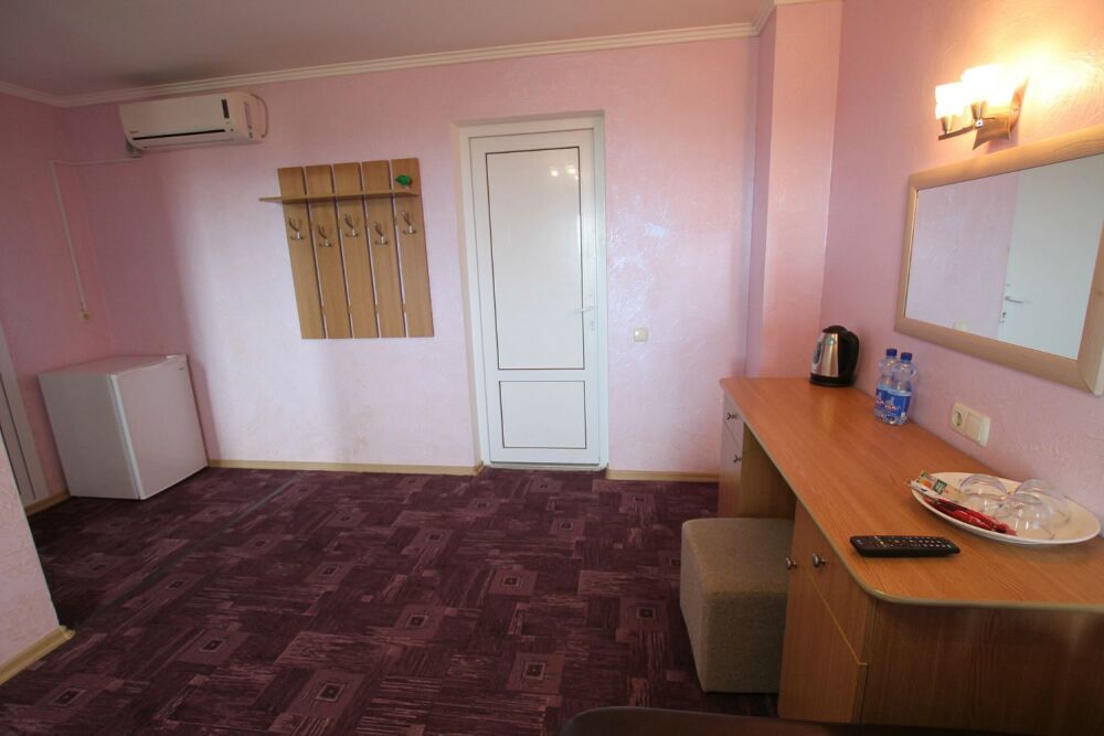 - Люкс 1 – однокомнатный (2,3-местный) номер 22 м2 с лоджией 10 м2 на 2 этаже со всеми удобствами, TV, холодильник, лоджия, кондиционер, сейф, чайник, косметические средства, фен, чайный набор, полотенца для пляжа.