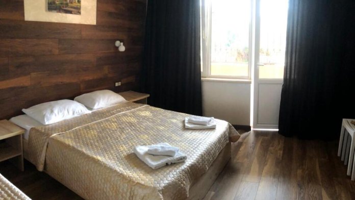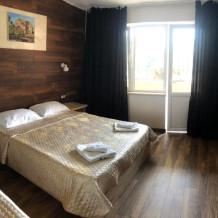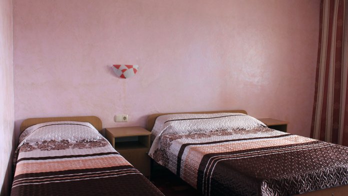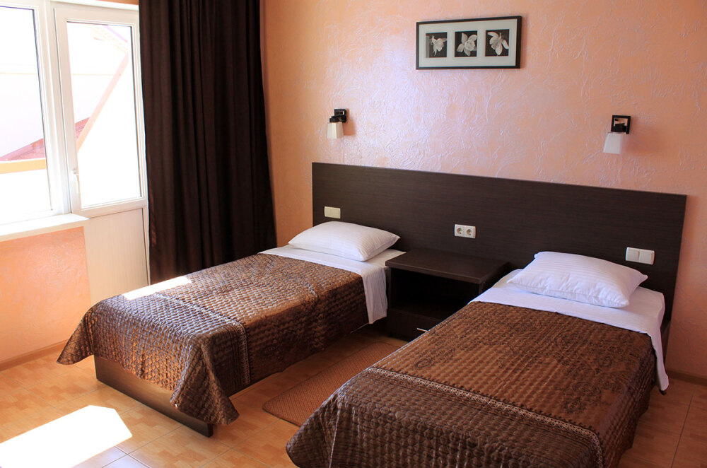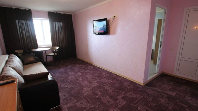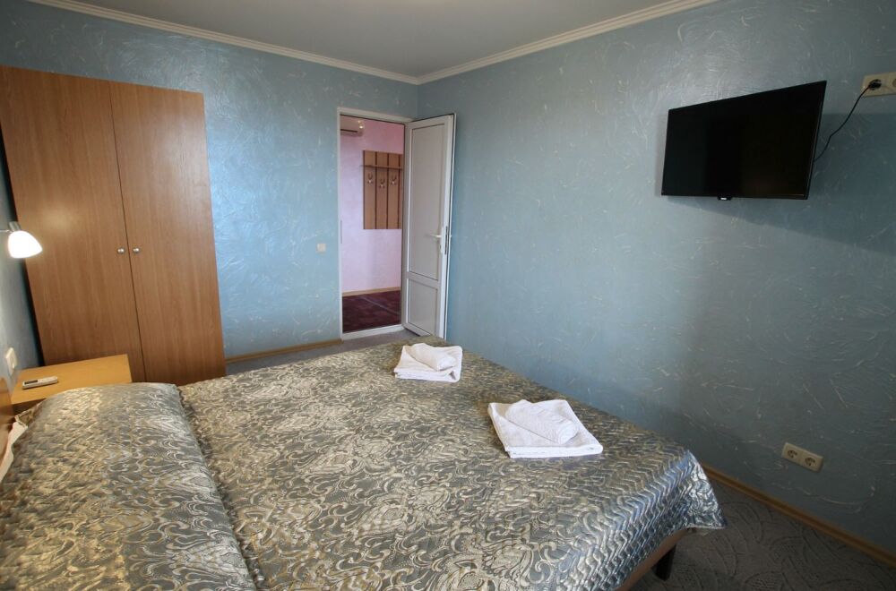 - Люкс 2 – двухкомнатный (проживание до 4-х человек) номер 40 м2 с балконом на 3 этаже со всеми удобствами, TV, холодильник, лоджия, кондиционер, сейф, чайник, косметические средства, фен, чайный набор, полотенца для пляжа.