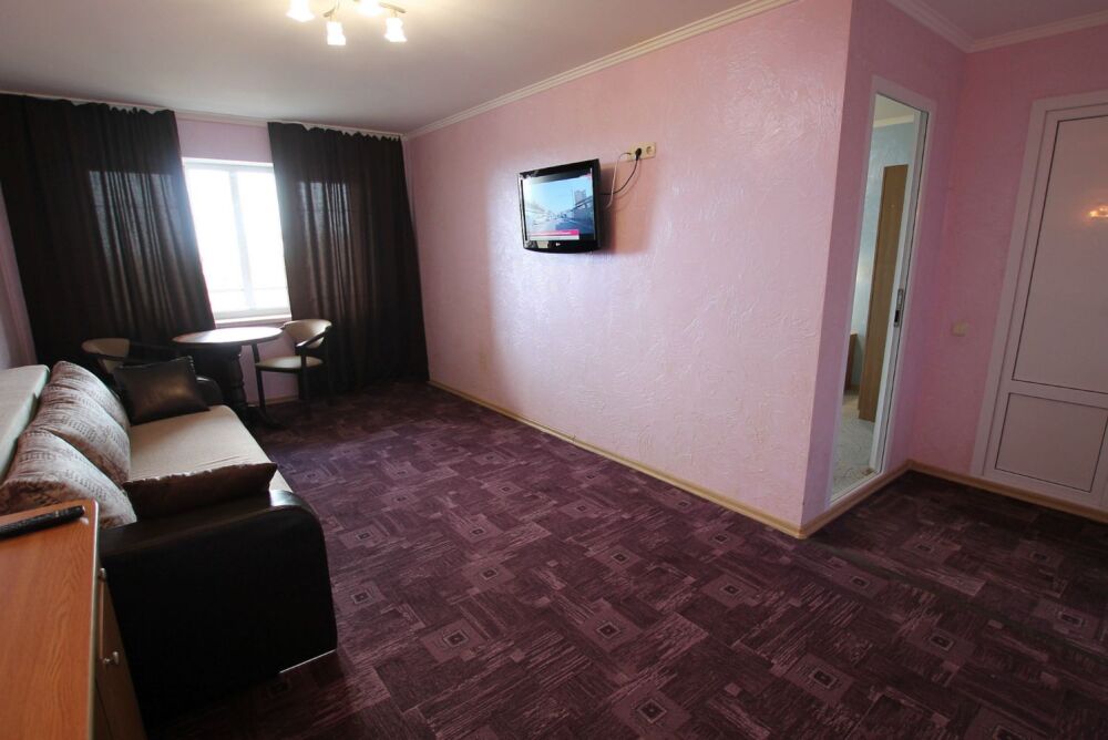 двухкомнатный (проживание до 4х человек) номер 40 м2 с балконом на 3 этаже со всеми удобствами, TV, холодильник, лоджия, кондиционер, сейф, чайник, косметические средства, фен, чайный набор.