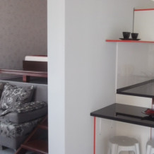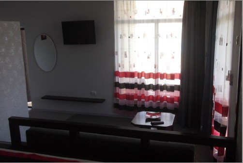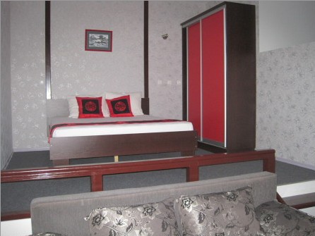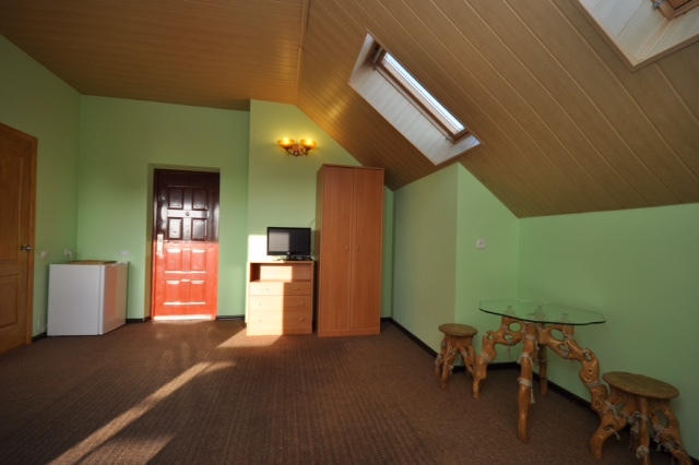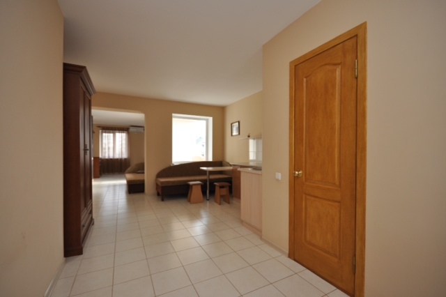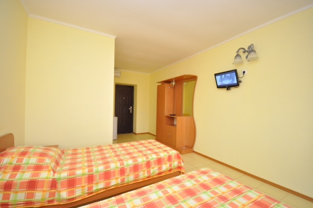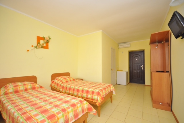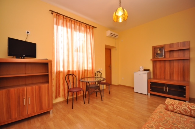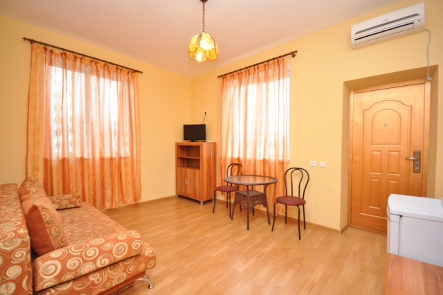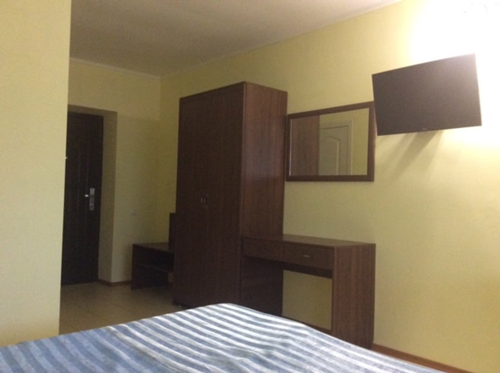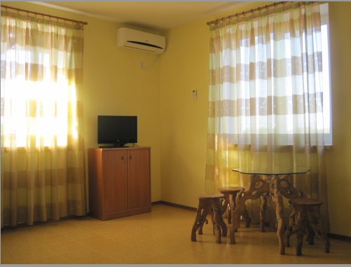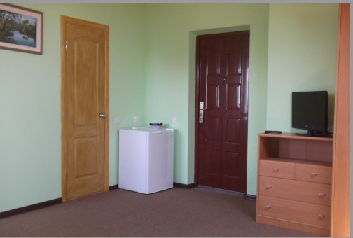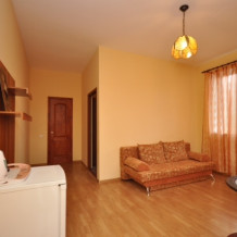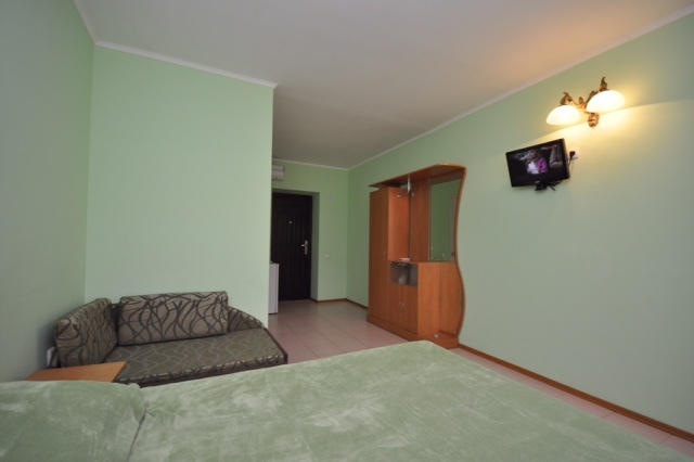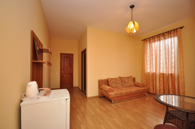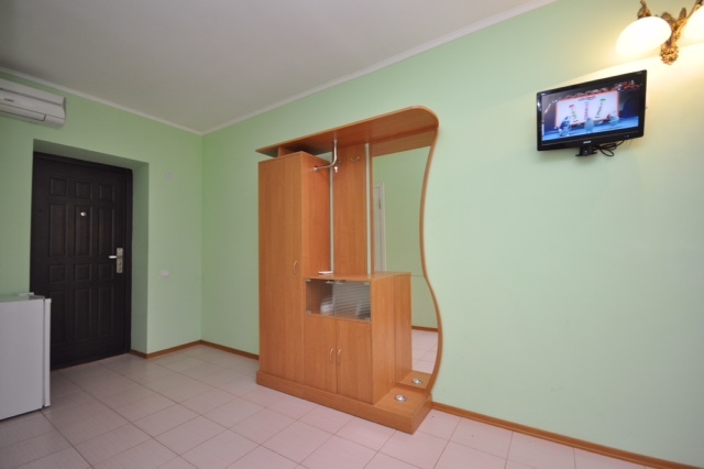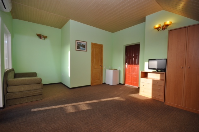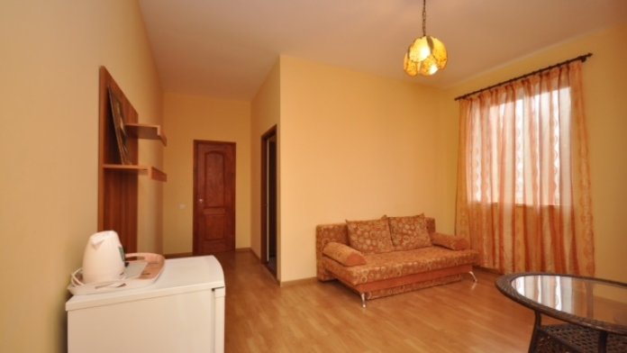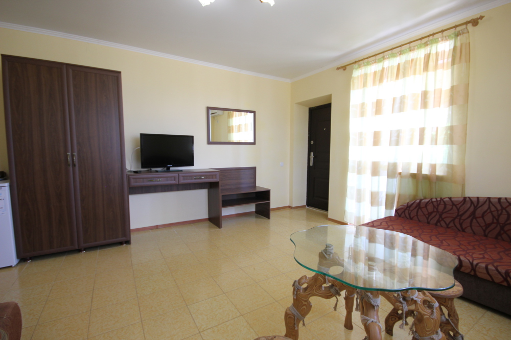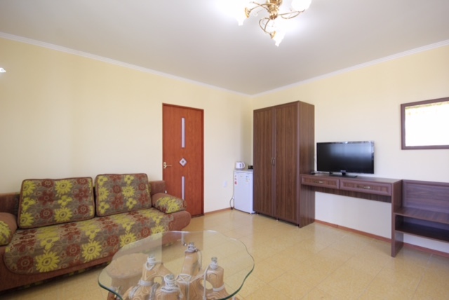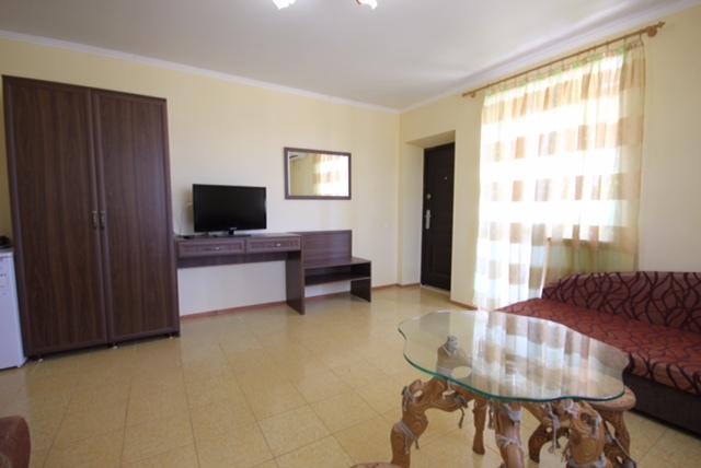 В номере: кондиционер, ТВ: спутник, кровати, диван, стенка, прихожая, журнальный столик, совмещенный сан-узел: душ, туалет, стол, стулья, холодильник.