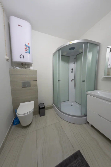 Спальня оснащена двуспальной кроватью 160х200 см, креслом, прикроватной тумбой и столиком с выдвижными ящиками. Во второй комнате - двуспальная кровать 140х200, окно в видом на дубовый лес, столик, диван и телевизор 52 дюйма. В номере большой шкаф с зеркалом в полный рост. Ванная комната оснащена душем. Фен. Махровые халаты.