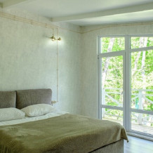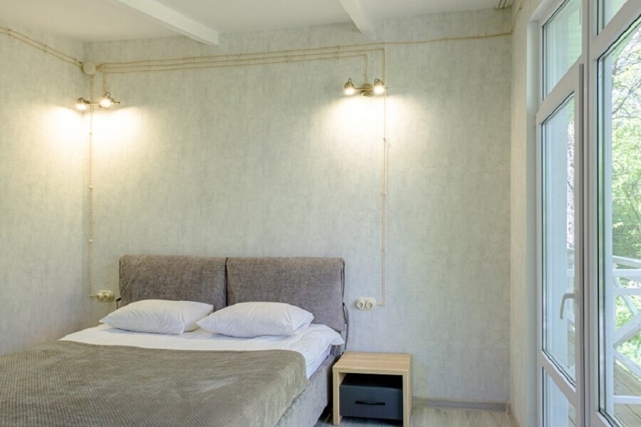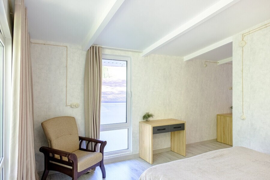 Конфигурация : Двухкомнатный домик с панорамным окном в спальне и выходом на просторную террасу в гущу дубового леса или на балкон с видом на гору Демерджи. Спальня оснащена двуспальной кроватью 160х200 см, креслом, прикроватной тумбой и столиком с выдвижными ящиками. Во второй комнате - двуспальная кровать 140х200, окно в видом на дубовый лес, столик, диван и телевизор 52 дюйма. В номере большой шкаф с зеркалом в полный рост. Ванная комната оснащена душем. Фен в каждом номере. Махровые халаты.