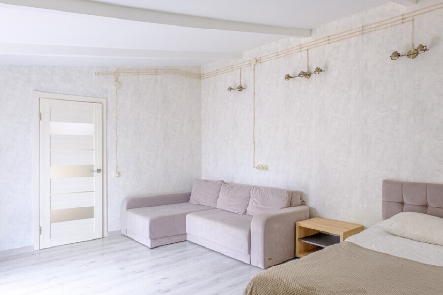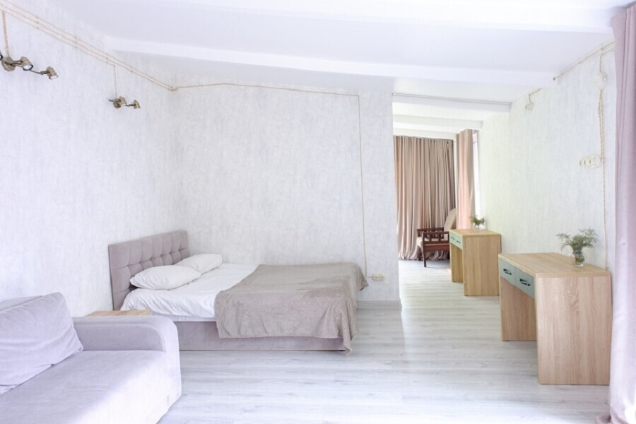 В номере имеется две комнаты в каждой из которых двуспальная кровать. Вторая комната является проходной. Первая комната с выходом на балкон, двуспальная кровать 160х200 см, кресло, прикроватная тумба и столик с выдвижными ящиками. Вторая комната с окно, двуспальная кровать 145х210 см, диван, столик с выдвижными ящиками. В номере отдельный санузел и вместительный шкаф с зеркалом в полный рост. Ванная комната оснащена душем. Фен в каждом номере. 3х разовое питание, Походы в места силы, Психолог, Нутрициолог, Тренер