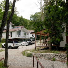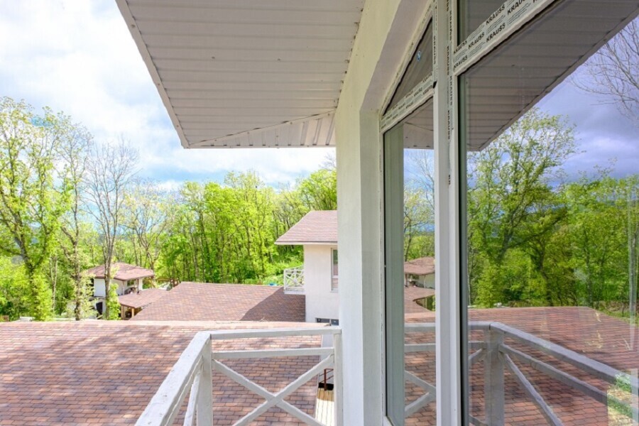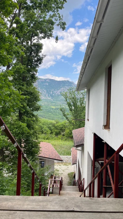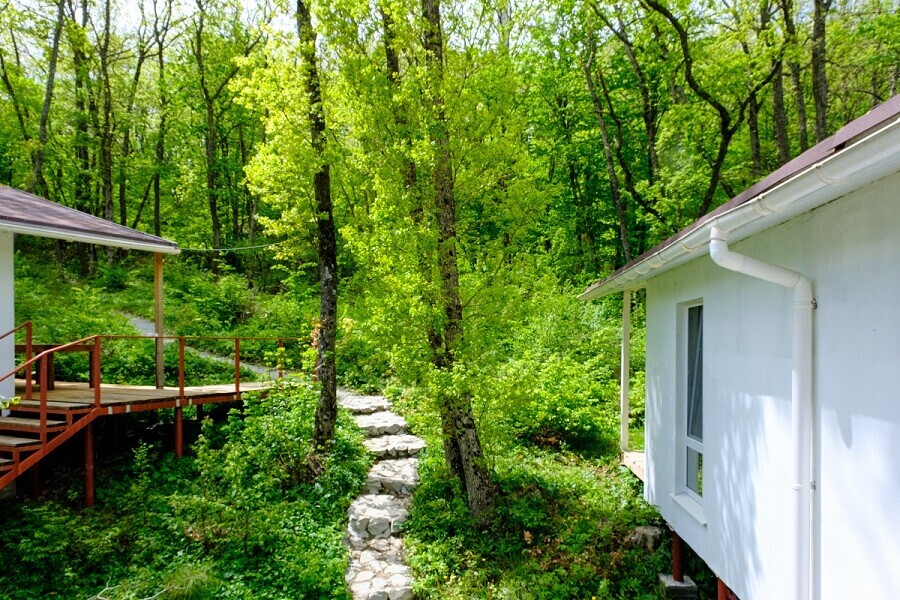 Общая площадь 40 м. В домике 2 комнаты. Просторная терраса с выходом в дубовый лес или балкон с видом на горы или лес.