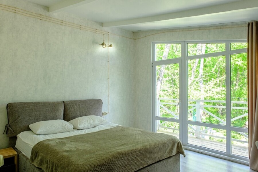 В домике имеется две комнаты. Просторная терраса с выходом в дубовый лес или балкон с панорамным видом на горы или лес.