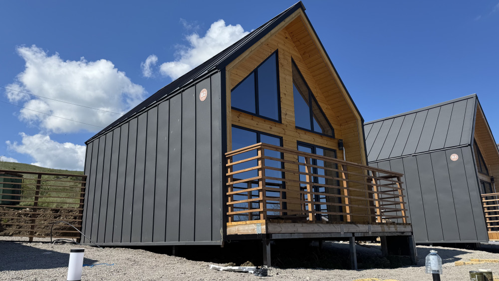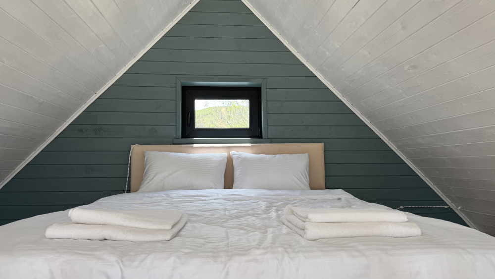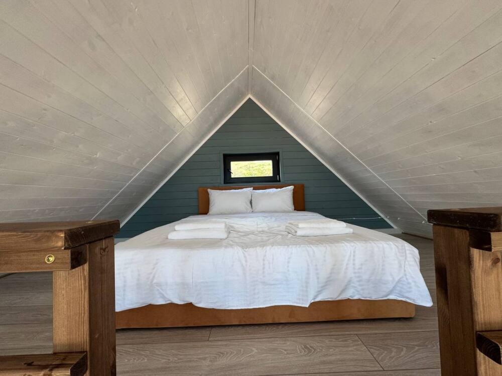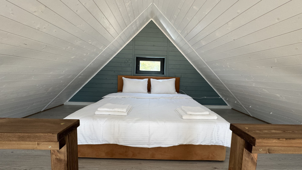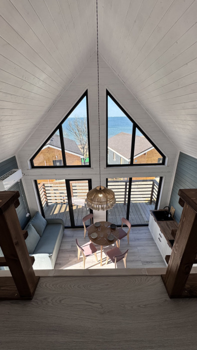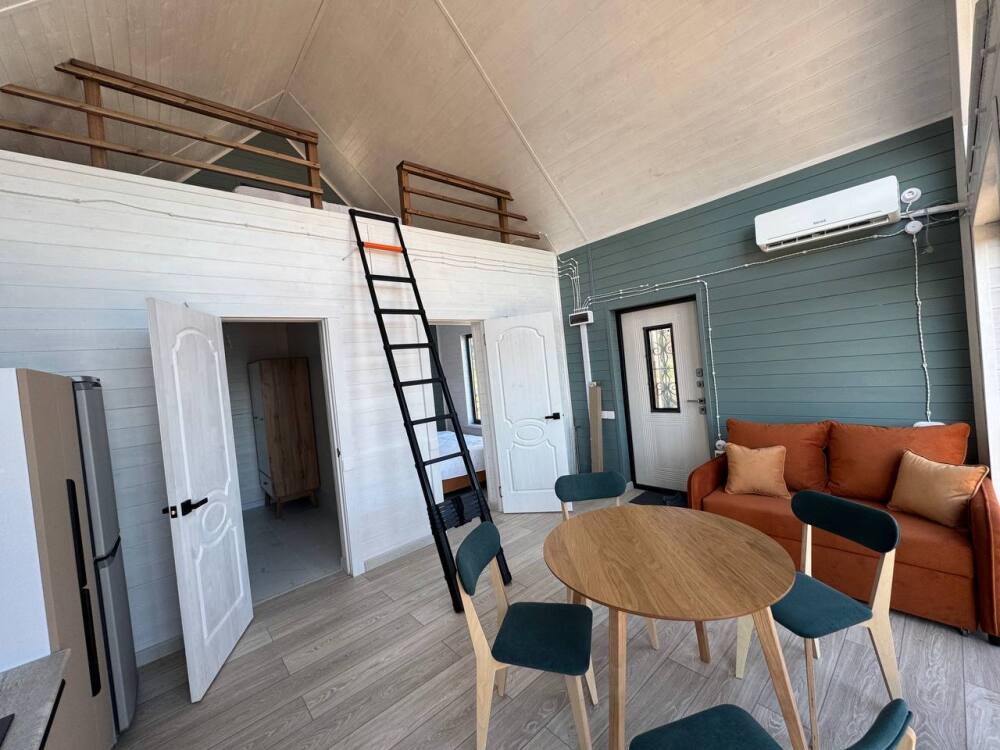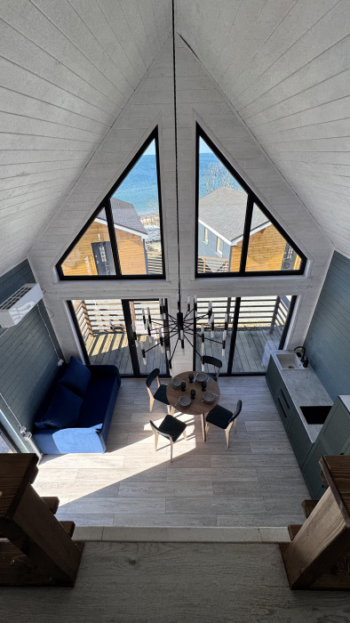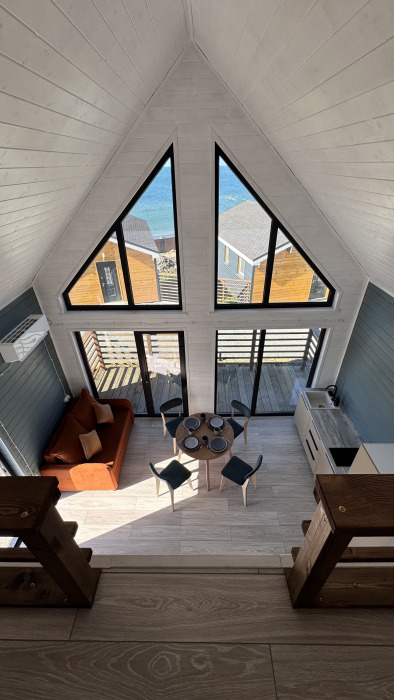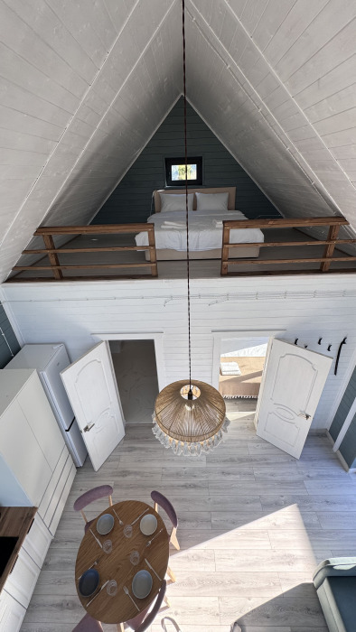 Коттедж в стиле А-фрейма со вторым светом выполнен в насыщенных песочных оттенках с отдельной спальней на 1 этаже, спальней со вторым светом на 2 этаже, кухней-гостиной, душевой комнатой и террасой.