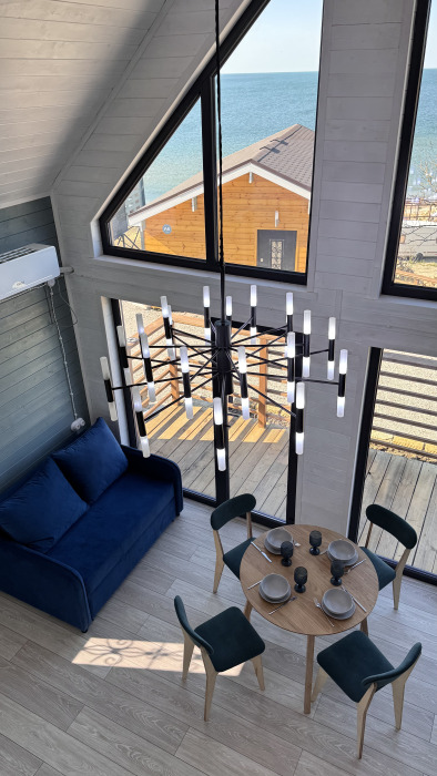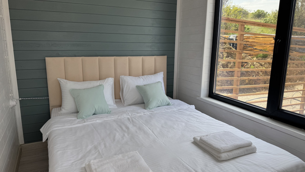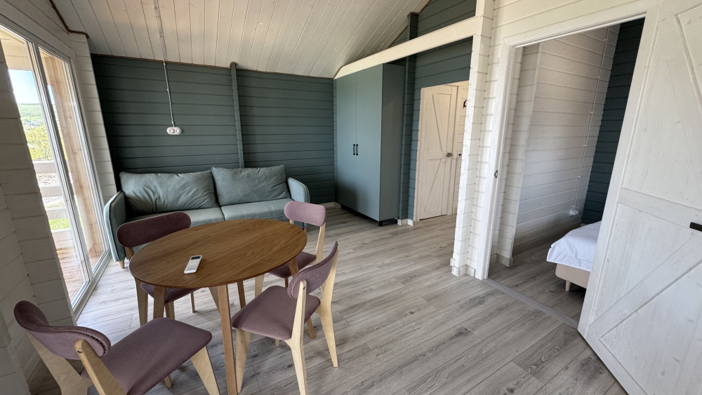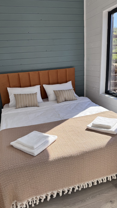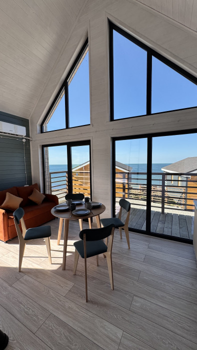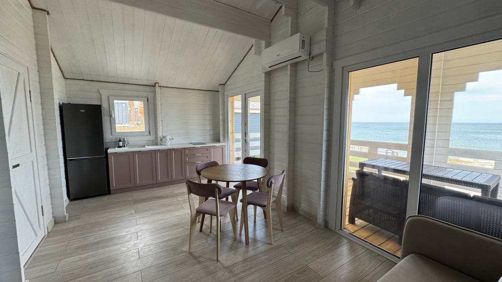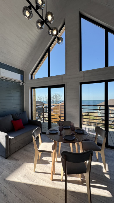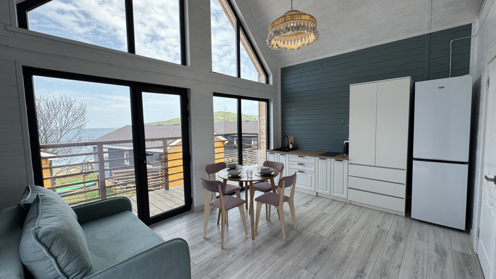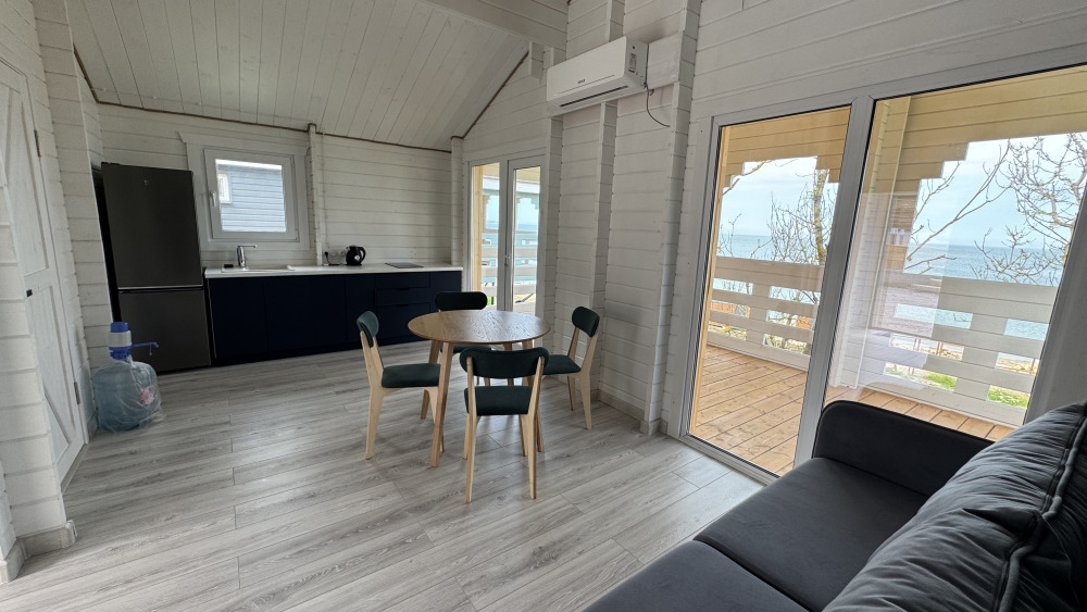 Современный дизайн, натуральное дерево и минимализм - интерьер напоминает, что Вы находитесь наедине с природой. Внутри расположена отдельная спальня, кухня-гостиная, душевая комната и собственная терраса с видом на море. Вместимость коттеджа до 4 человек: 2 основных спальных места на кровати и 2 дополнительных на большом двуспальном диване. Полная комплектация коттеджа сделает Ваш отдых комфортным: необходимая мебель, бытовая техника, посуда и кухонные приборы, а также комплекты белоснежных полотенец, халатов и косметических принадлежностей для каждого гостя.