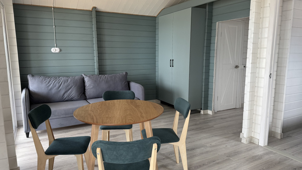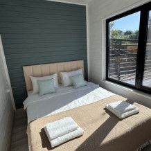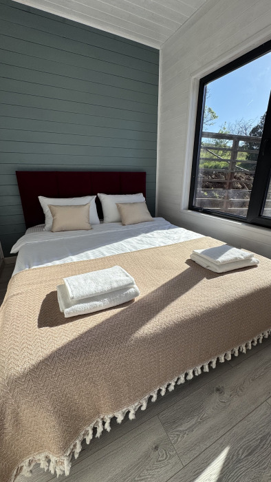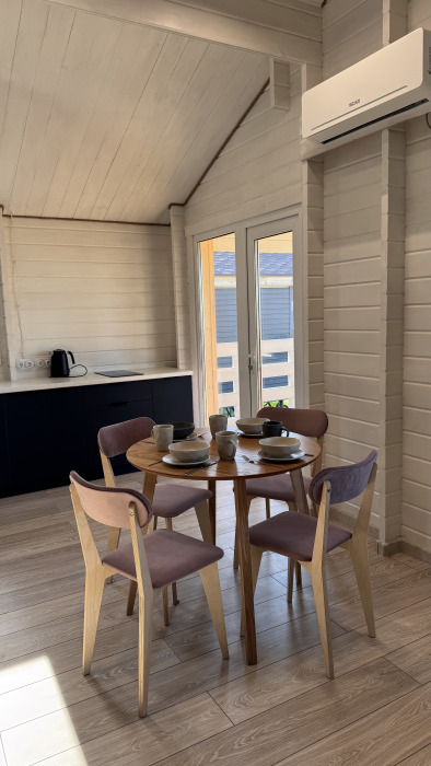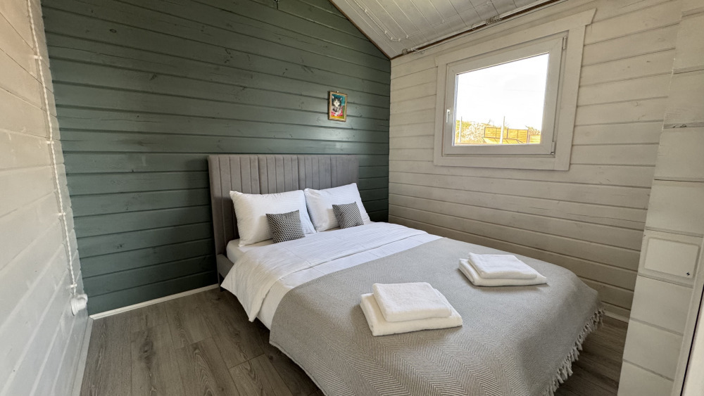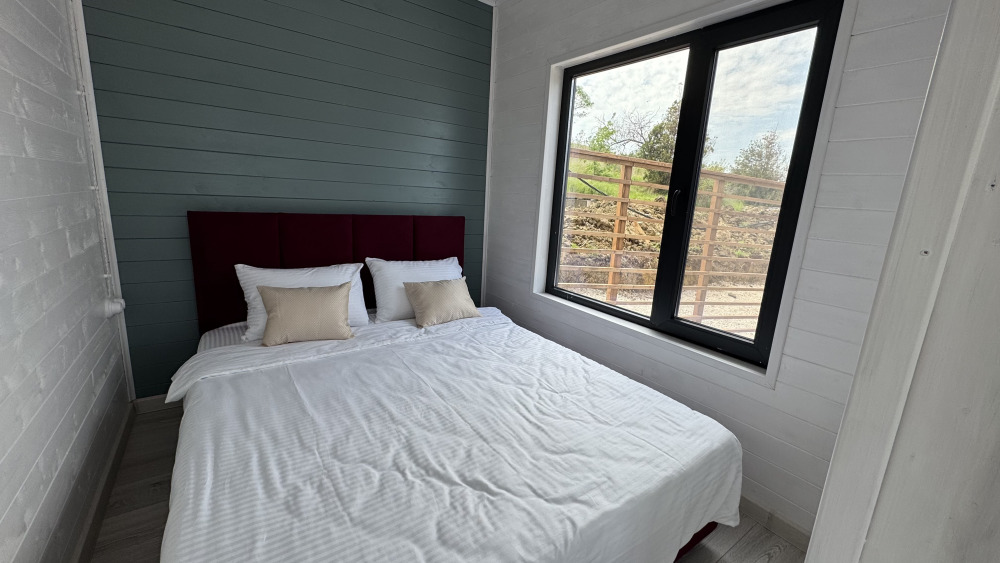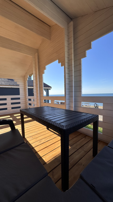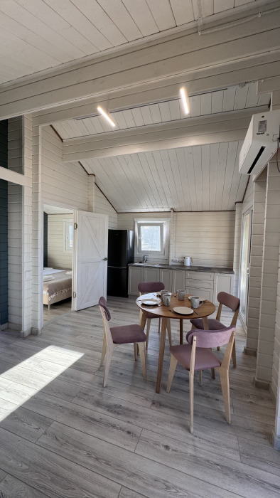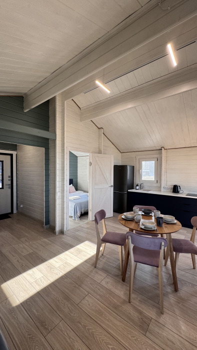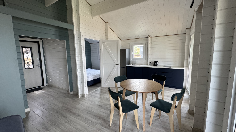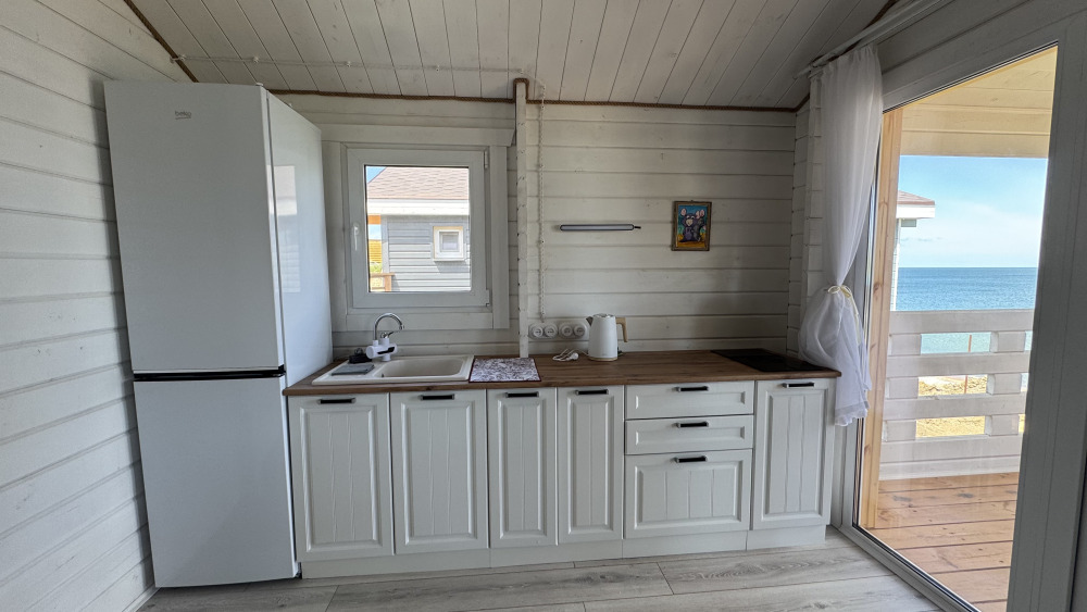 Современный дизайн, натуральное дерево и минимализм - интерьер напоминает, что Вы находитесь наедине с природой. Внутри расположена отдельная спальня, кухня-гостиная, душевая комната и собственная терраса с видом на море. Вместимость коттеджа до 4 человек: 2 основных спальных места на кровати и 2 дополнительных на большом двуспальном диване. Полная комплектация коттеджа сделает Ваш отдых комфортным: необходимая мебель, бытовая техника, посуда и кухонные приборы, а также комплекты белоснежных полотенец, халатов и косметических принадлежностей для каждого гостя.
