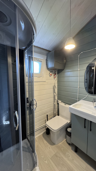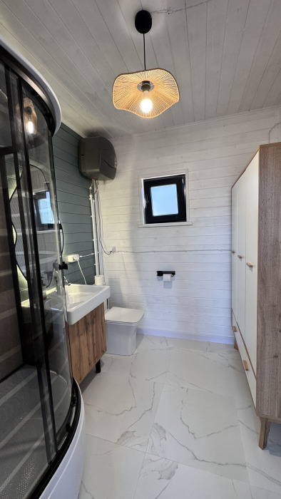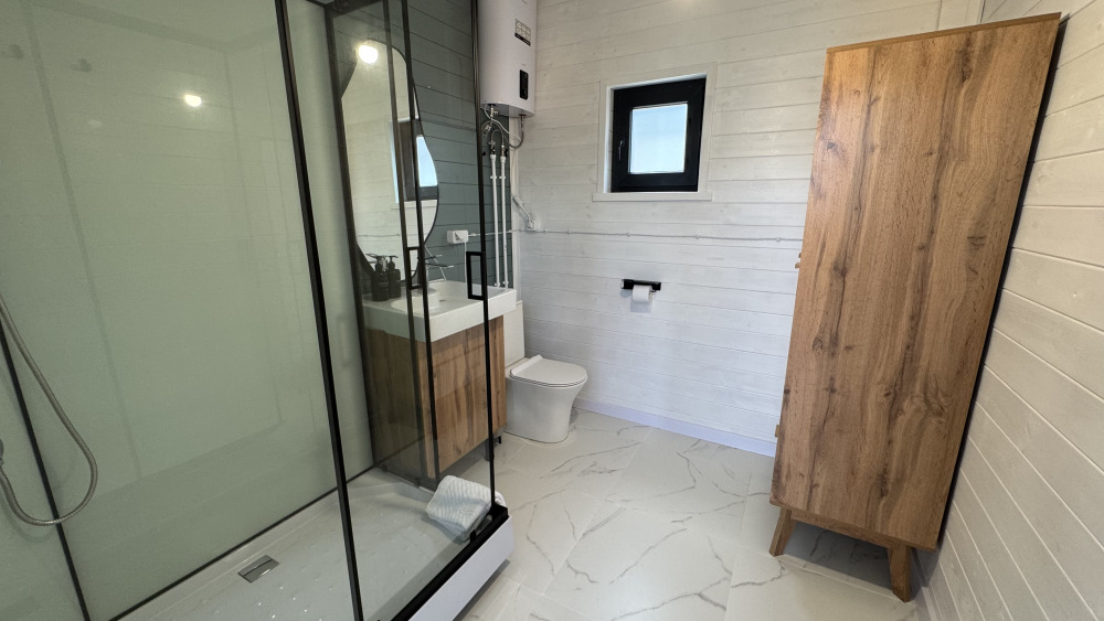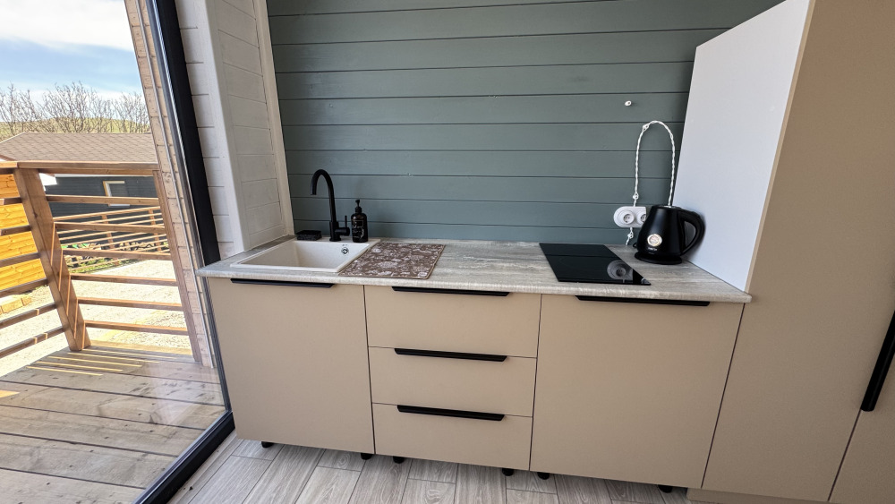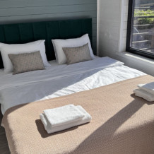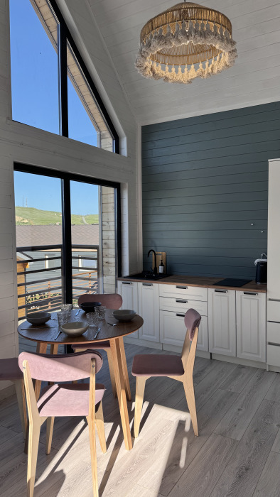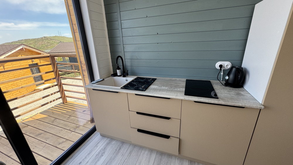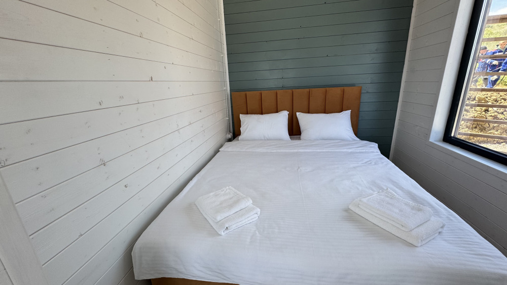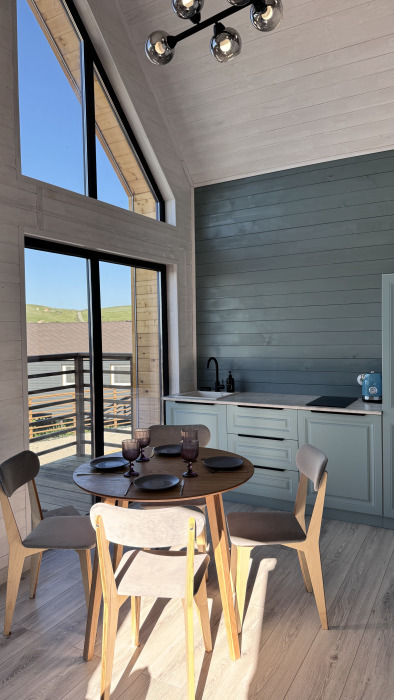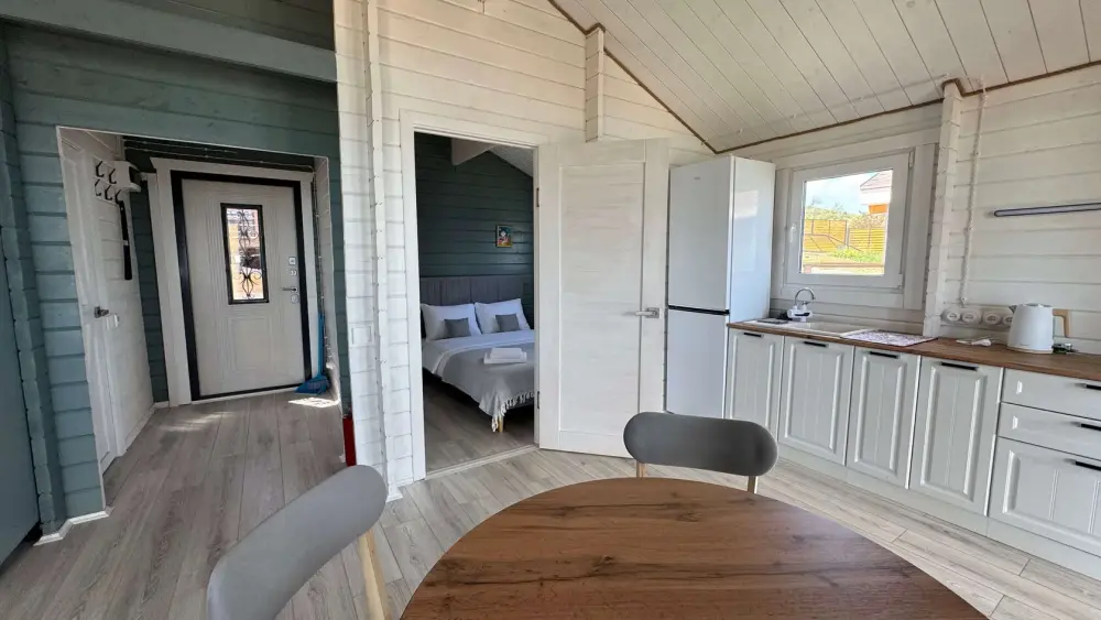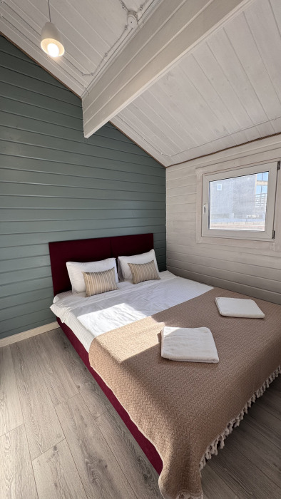 Современный дизайн, натуральное дерево и минимализм - интерьер напоминает, что Вы находитесь наедине с природой. Внутри расположена отдельная спальня, кухня-гостиная, душевая комната и собственная терраса с видом на море. Вместимость коттеджа до 4 человек: 2 основных спальных места на кровати и 2 дополнительных на большом двуспальном диване. Полная комплектация коттеджа сделает Ваш отдых комфортным: необходимая мебель, бытовая техника, посуда и кухонные приборы, а также комплекты белоснежных полотенец, халатов и косметических принадлежностей для каждого гостя.