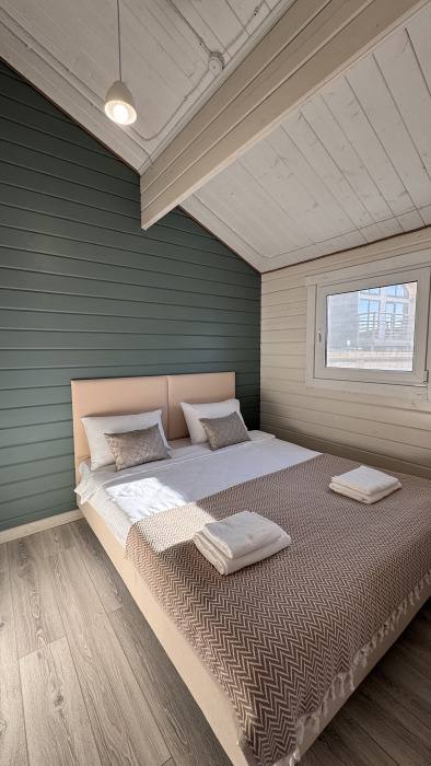 Вместимость коттеджа до 4 человек: 2 основных спальных места на кровати и 2 дополнительных на большом двуспальном диване. Полная комплектация коттеджа сделает Ваш отдых комфортным: необходимая мебель, бытовая техника, посуда и кухонные приборы, а также комплекты белоснежных полотенец, халатов и косметических принадлежностей для каждого гостя.