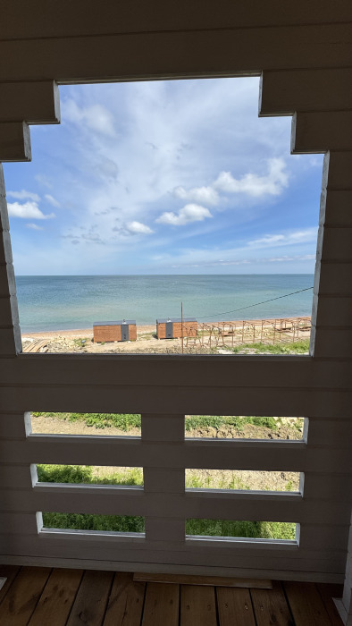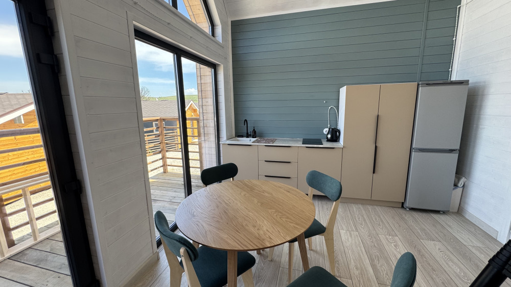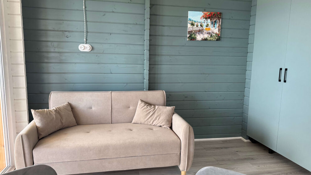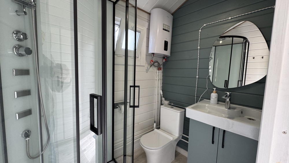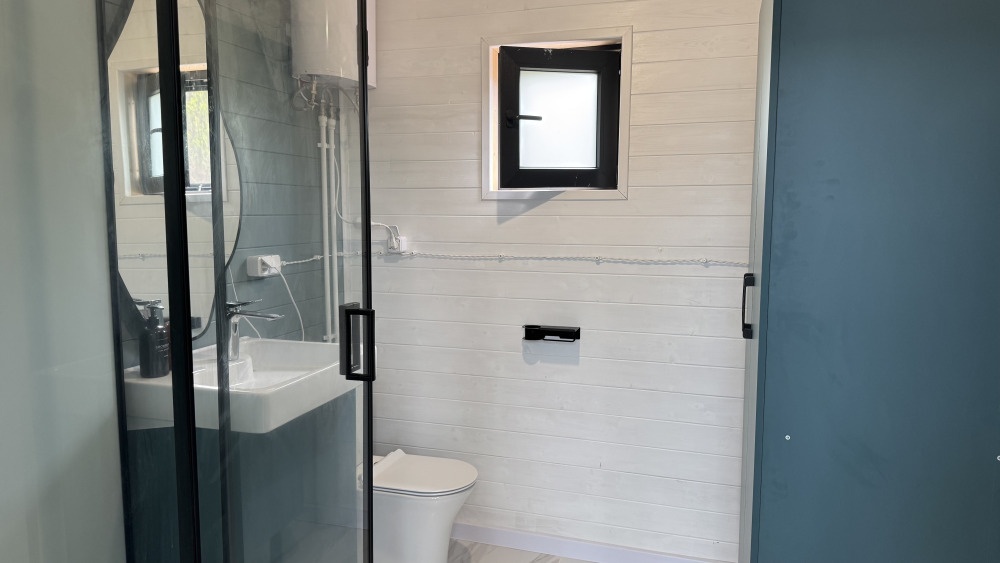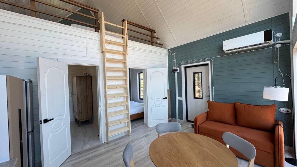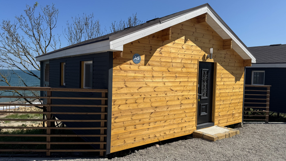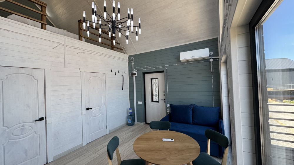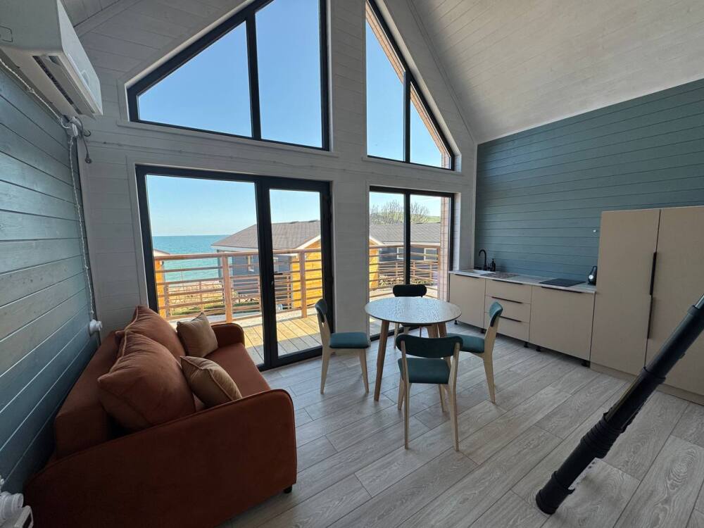 Коттедж в смелых морских оттенках выполнен из натурального дерева с отдельной спальней, кухней-гостиной и душевой комнатой, оборудован собственной террасой с видом на море.