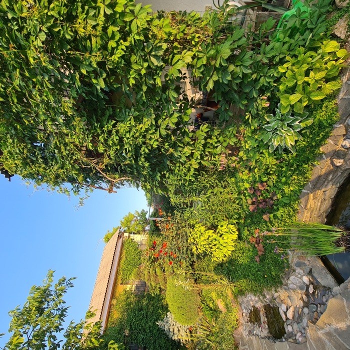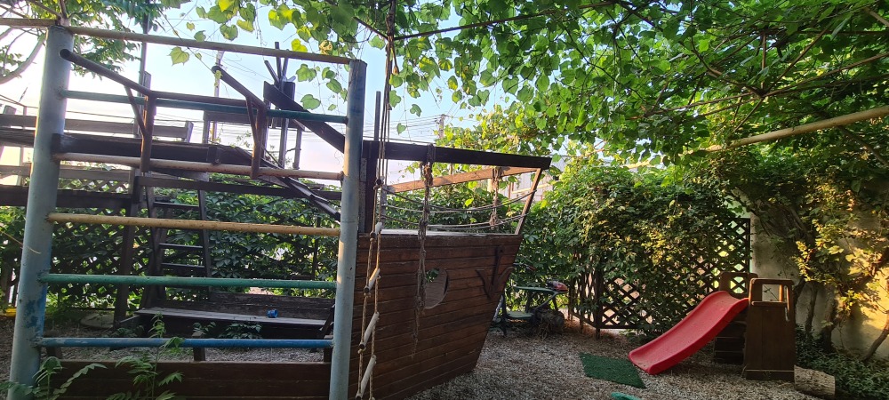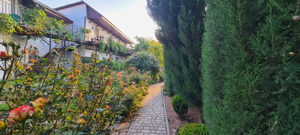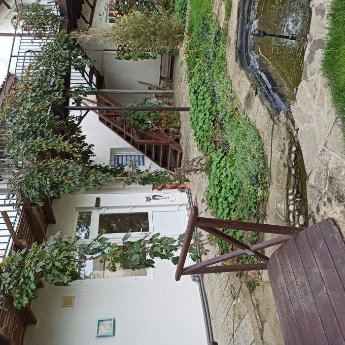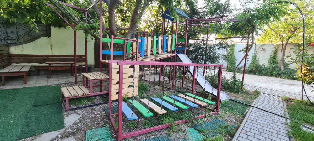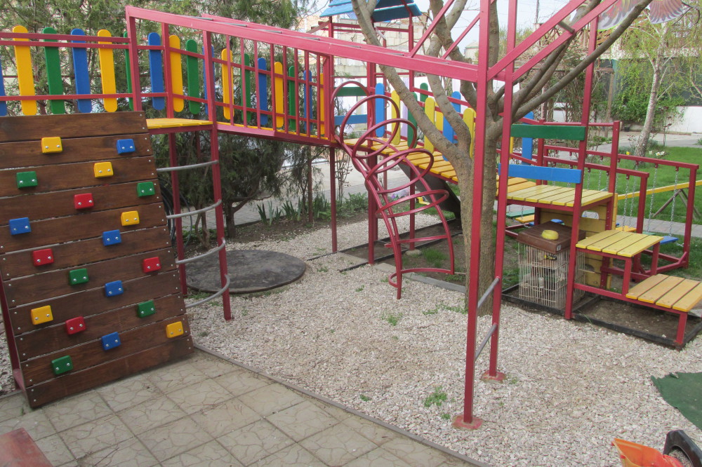 Территория пансионата озеленена, декоративный пруд с ручейком и фонтаном, имеется несколько выделенных зон отдыха, теневые беседки с видом на море, комфортное место отдыха перед каждым номером; качели, две детские площадки,