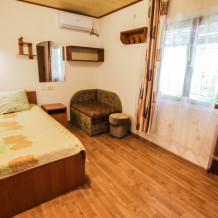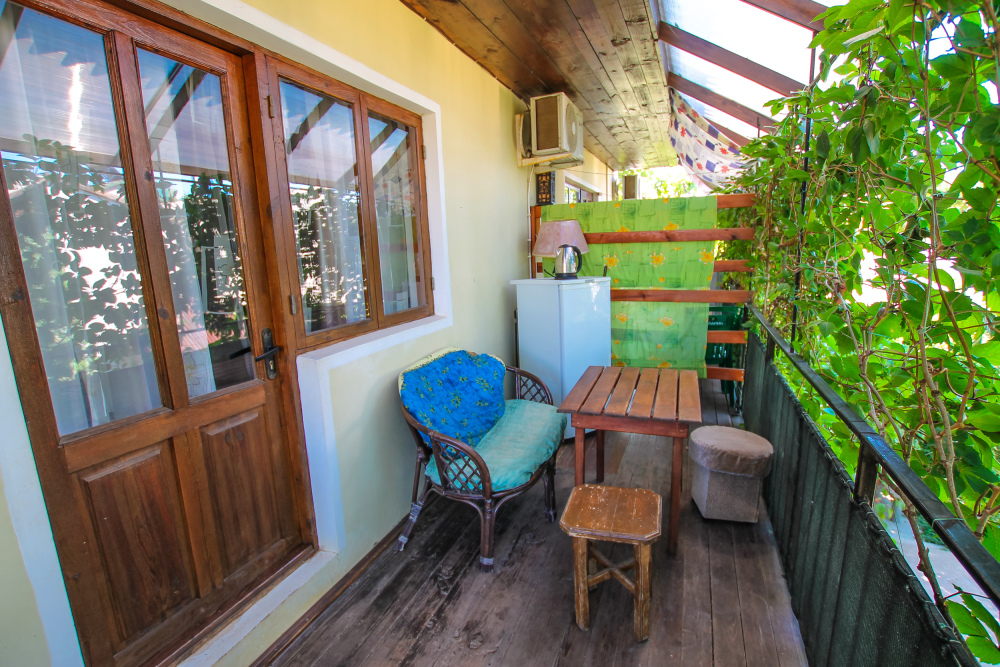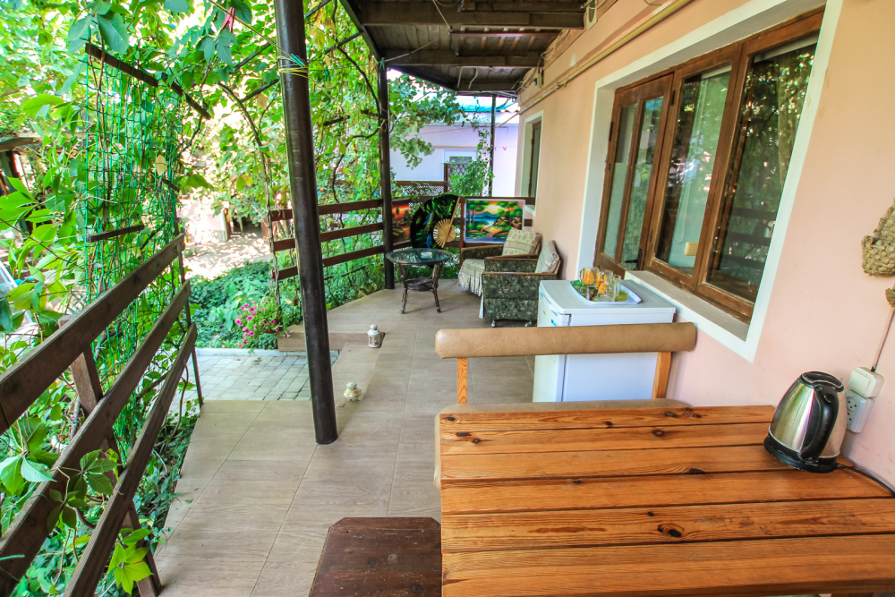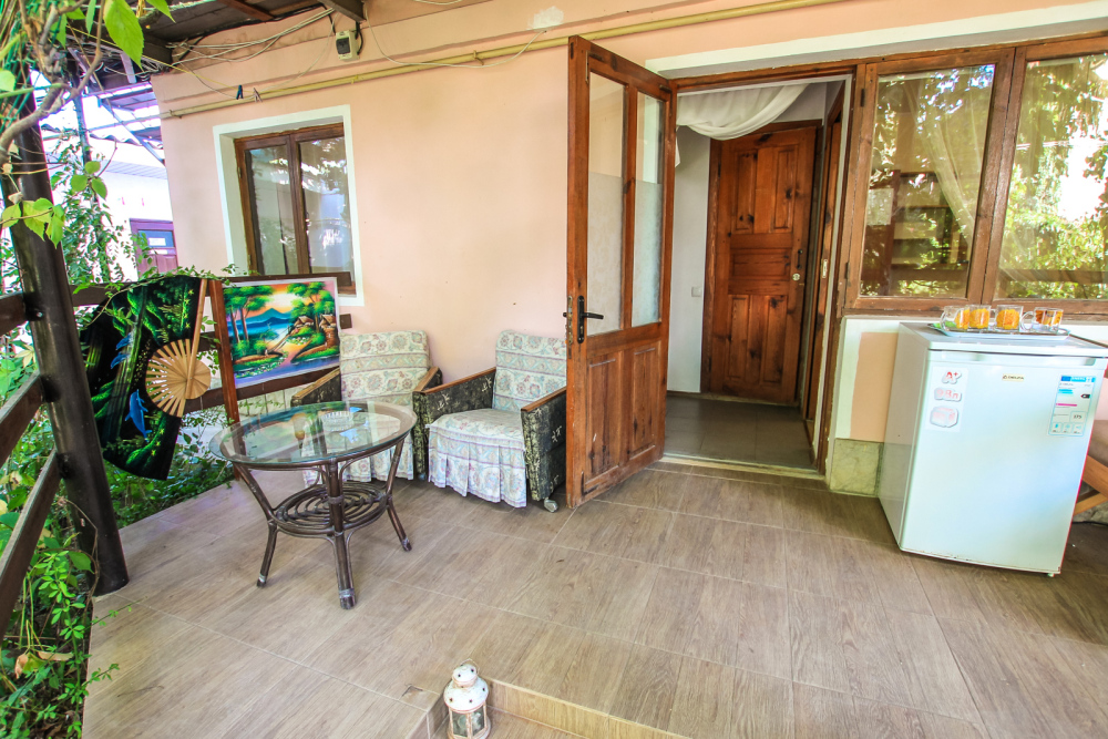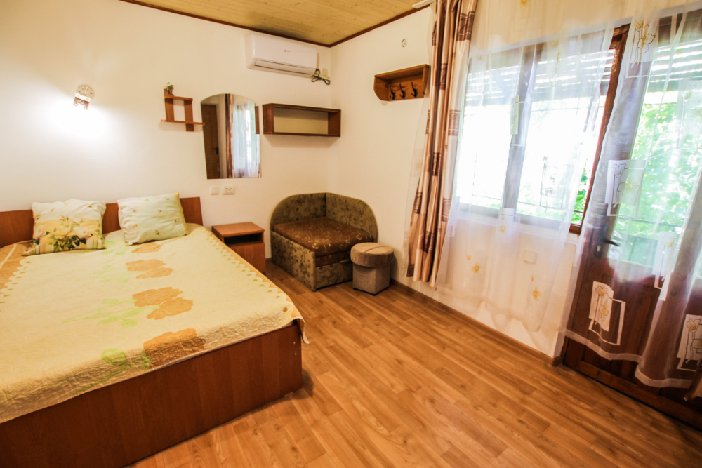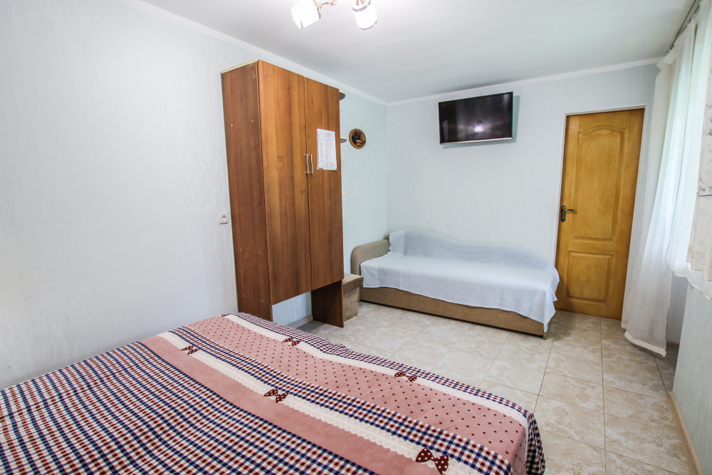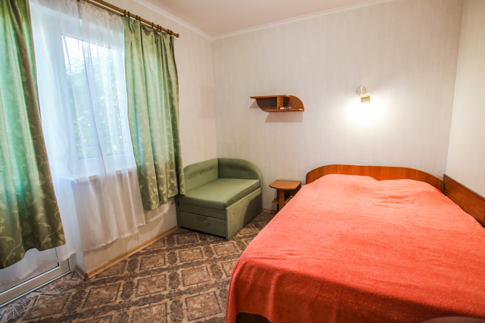 Уютный трехместный номер для Вашего отдыха. Есть 2 номера данной категории имеющие некоторые отличия. В стандартную комплектацию номера входит: телевизор, холодильник, электрический чайник, чайная посуда, кровати, диван, тумбочки, шкаф, пуфики, журнальный и туалетный столик. Перед номером личное пространство для отдыха с садовой мебелью. Общая кухня на территории.