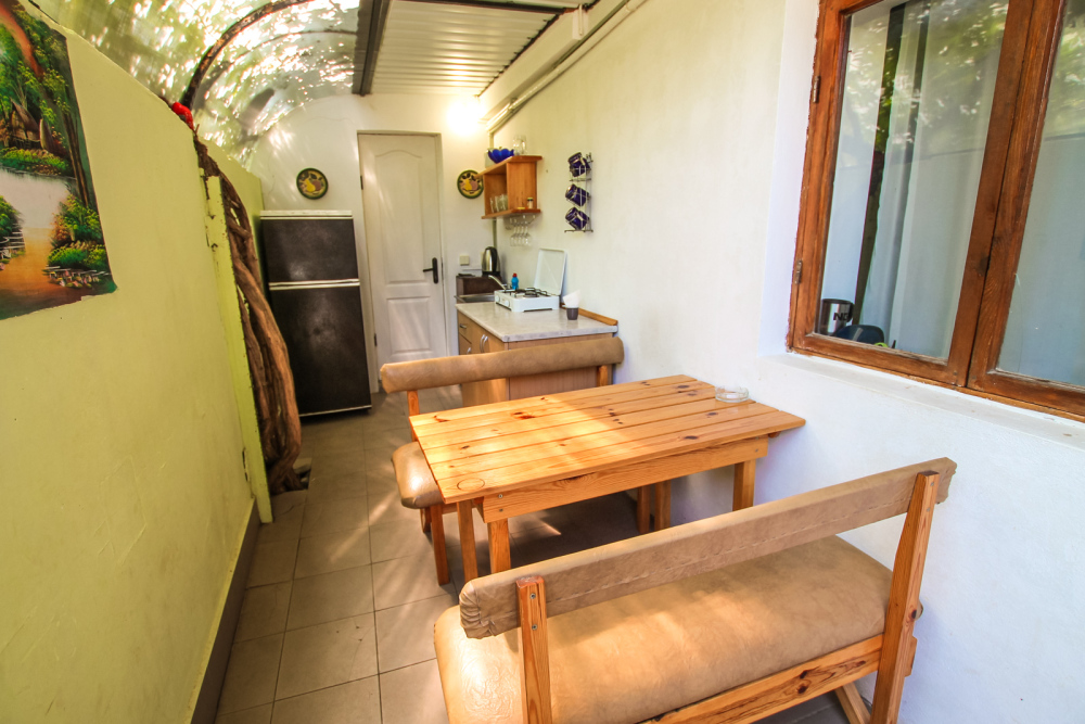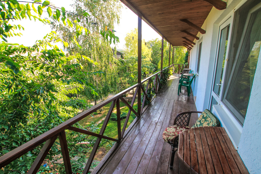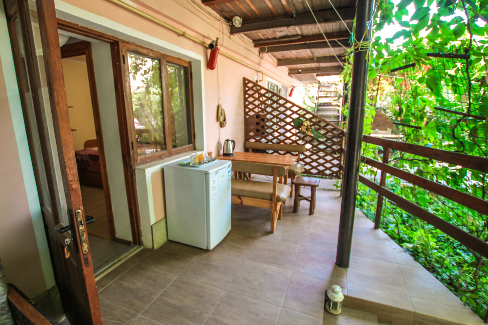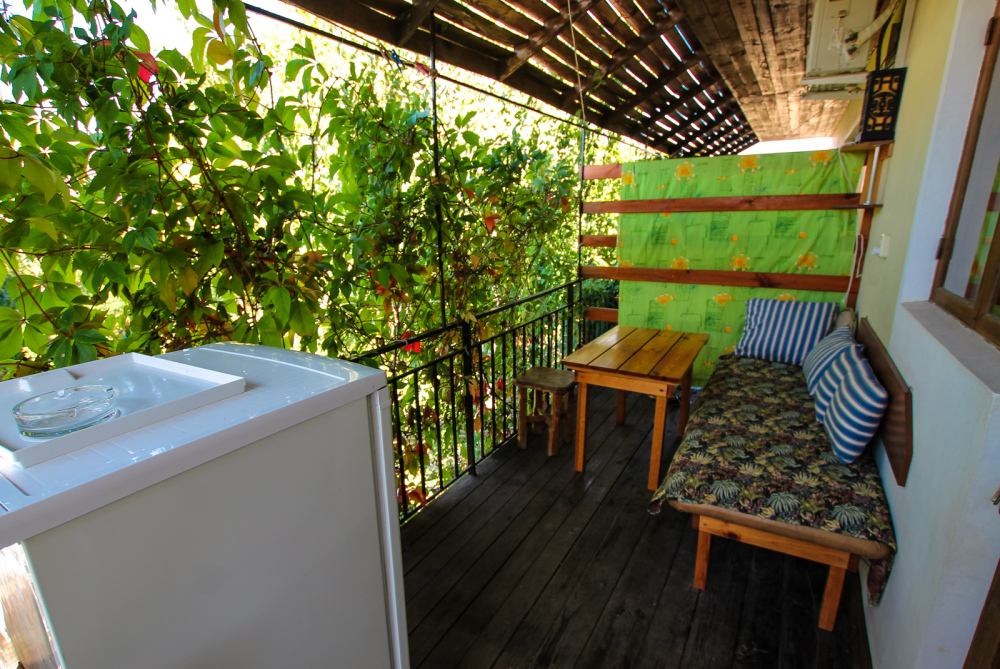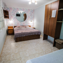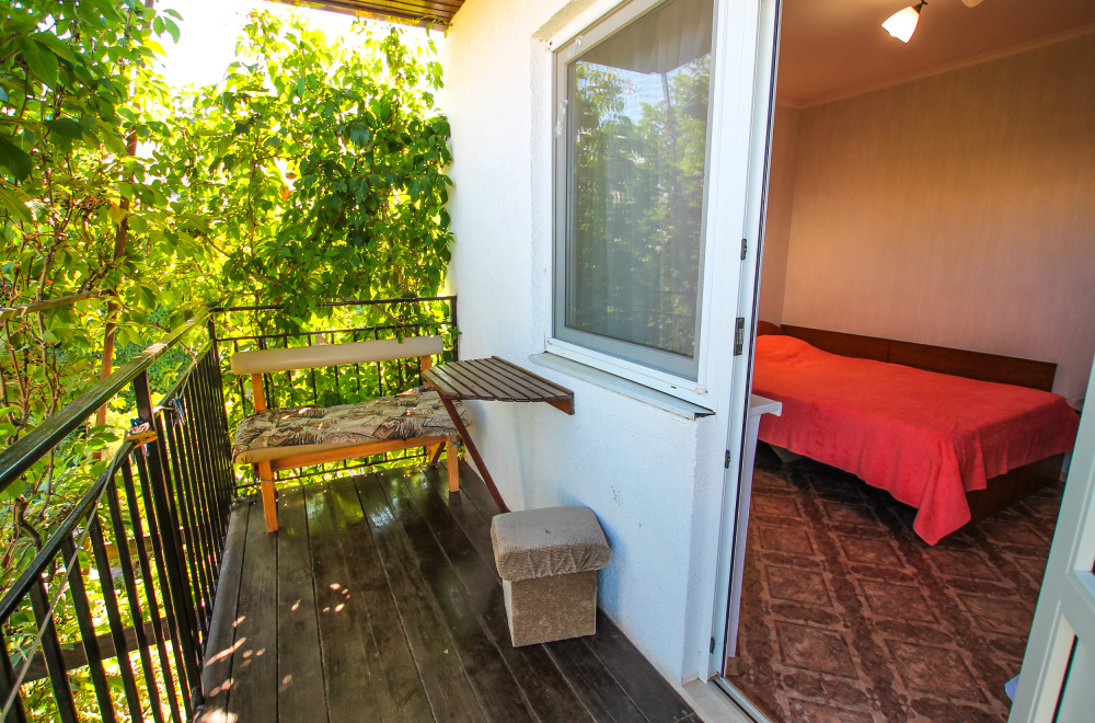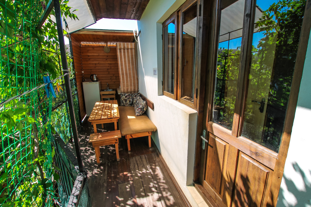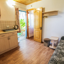 Уютный трехместный номер для Вашего отдыха. Есть 2 номера данной категории имеющие некоторые отличия. В стандартную комплектацию номера входит: телевизор, холодильник, электрический чайник, чайная посуда, кровати, диван, тумбочки, шкаф, пуфики, журнальный и туалетный столик. Перед номером личное пространство для отдыха с садовой мебелью. Общая кухня на территории.