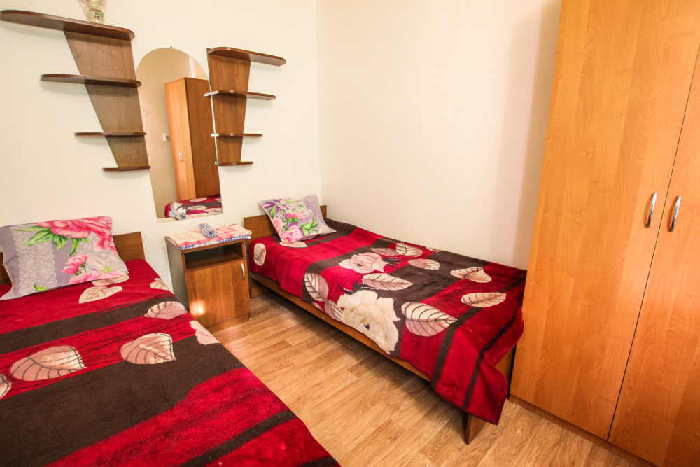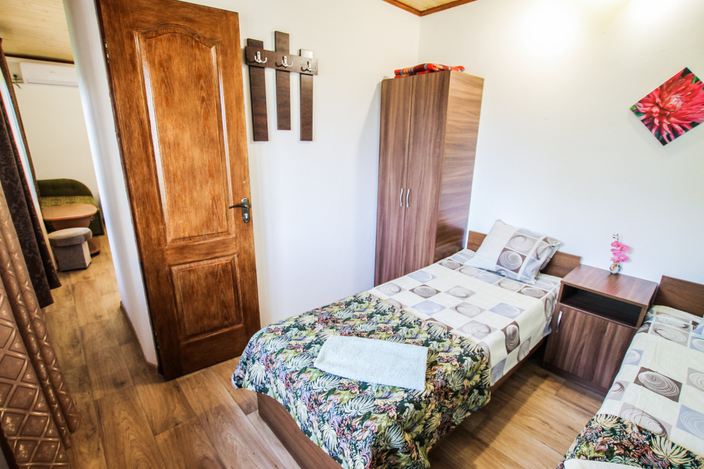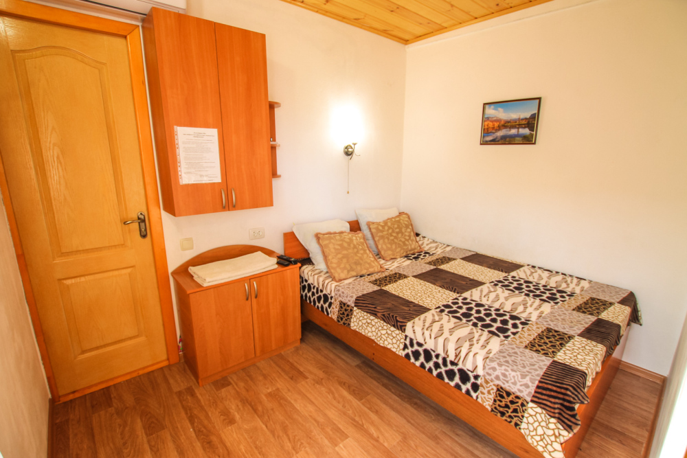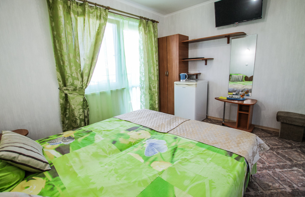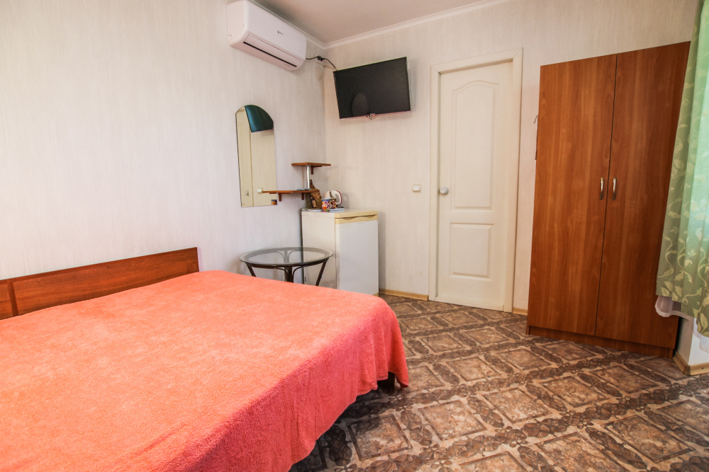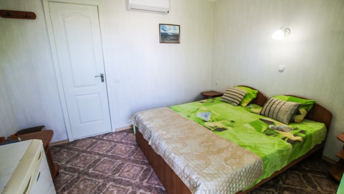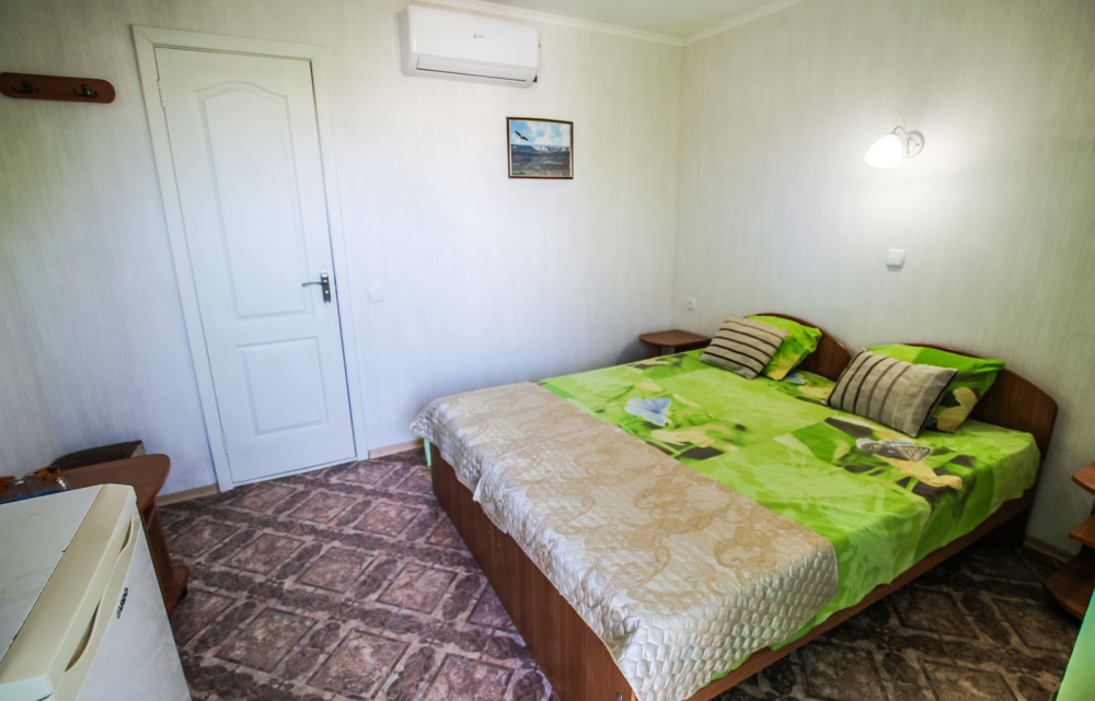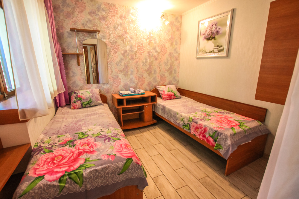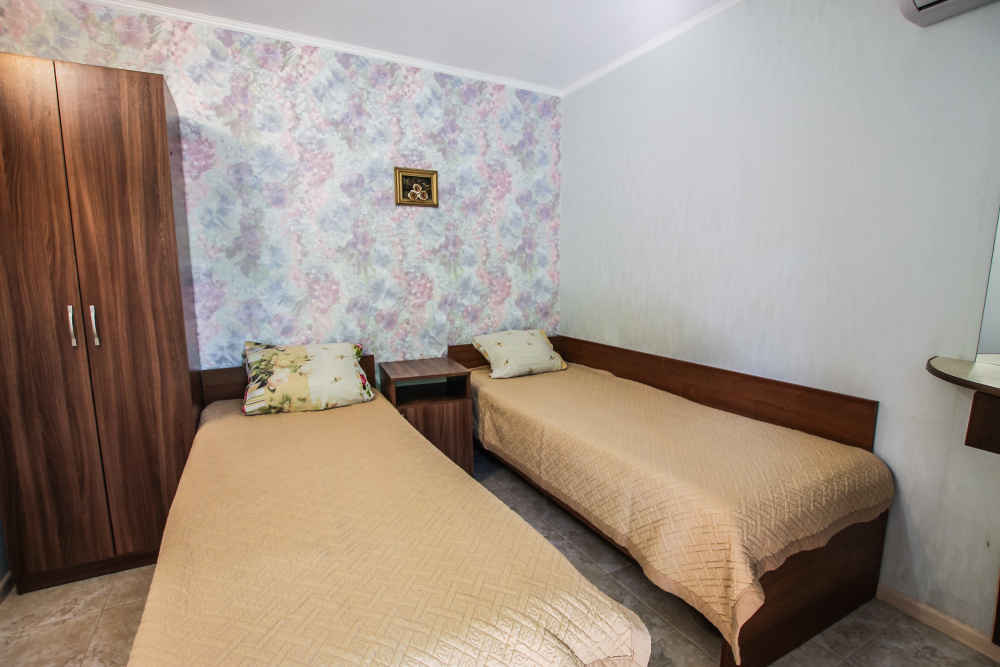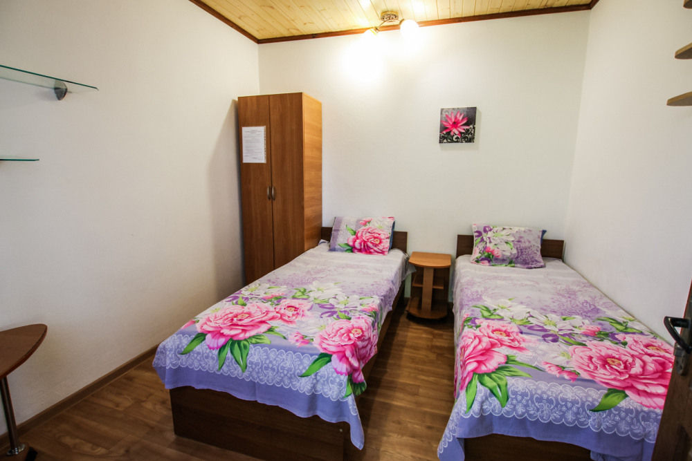 Уютный двухместный номер для комфортного отдыха. Все самое необходимое есть в номере. Две односпальные кровати с ортопедическими матрасами. Кондиционер, телевизор, холодильник, фен. Чайник и чайная посуда. Общая кухня на территории.