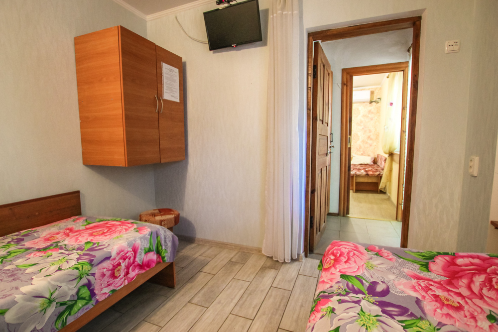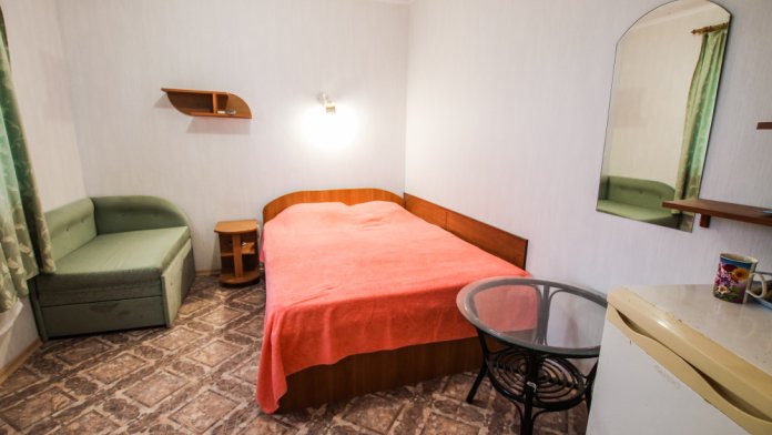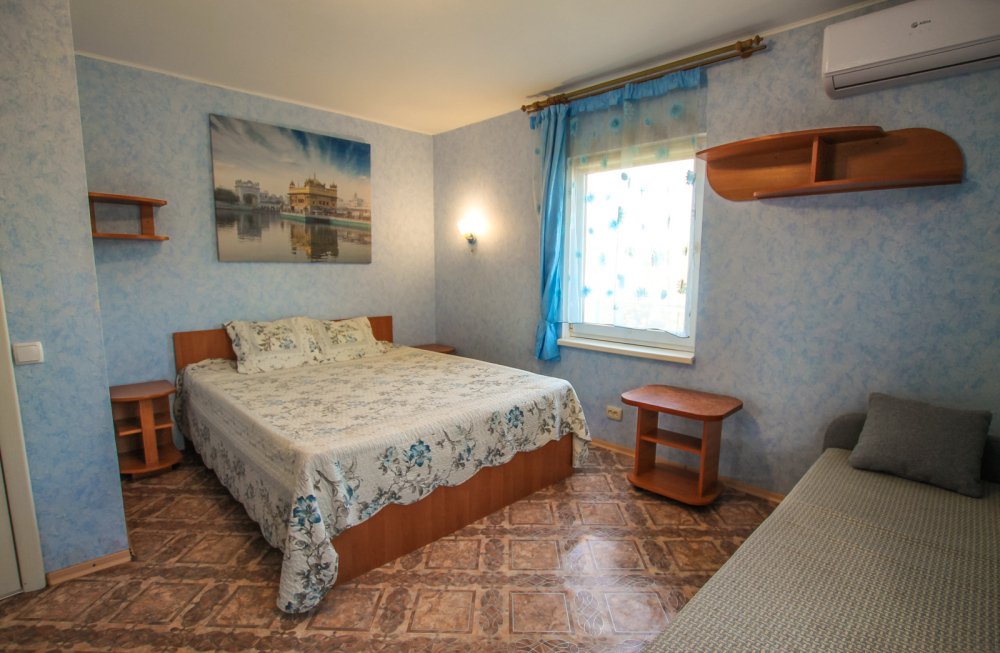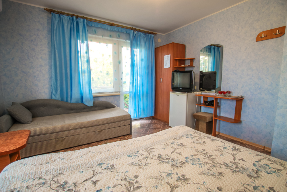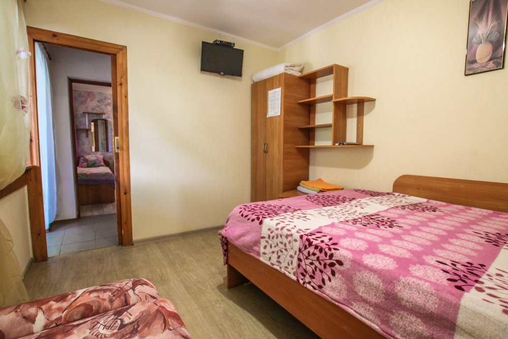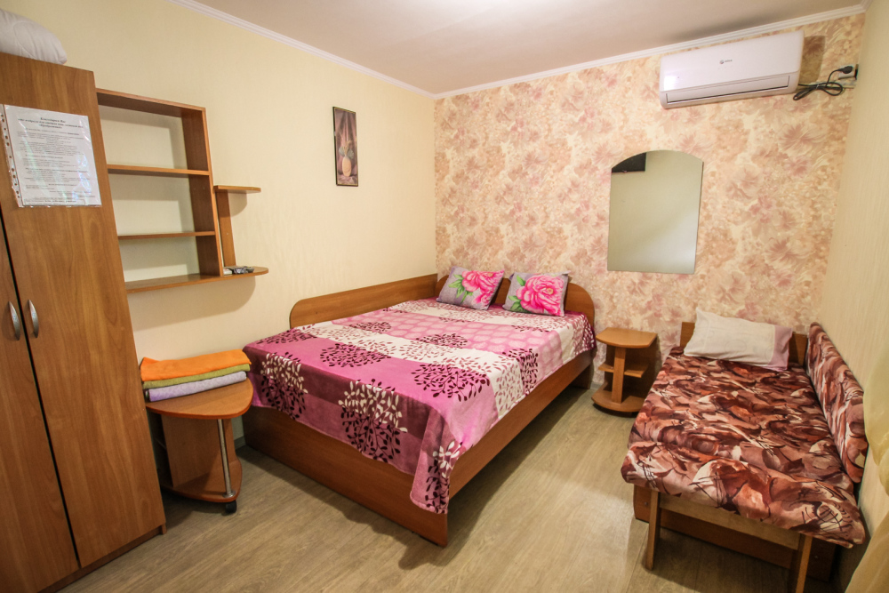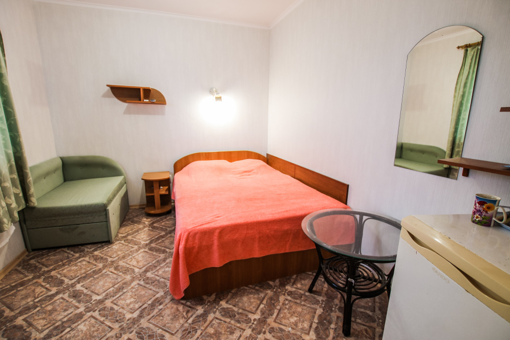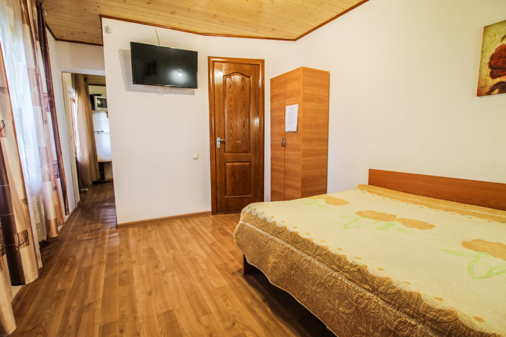 Уютный номер на 4 ех гостей для комфортного отдыха. В стандартную комплектацию номера входит: кондиционер, электрический чайник с чайной посудой, телевизор, холодильник, кровать, диван, тумбочки, шкаф, пуфики, журнальный и туалетный столик. Перед номером личное пространство для отдыха. Санузел с душем. Общая кухня на территории.