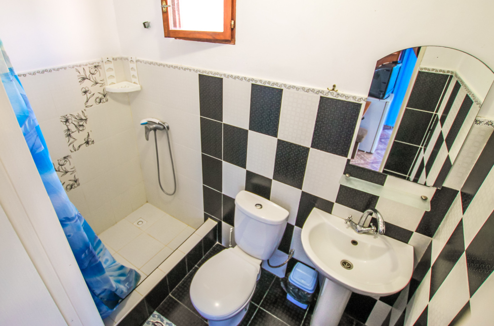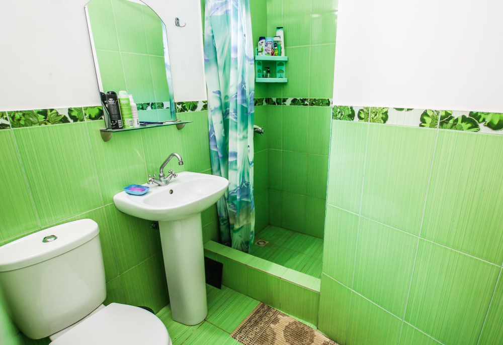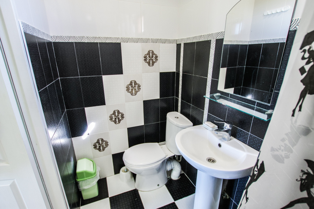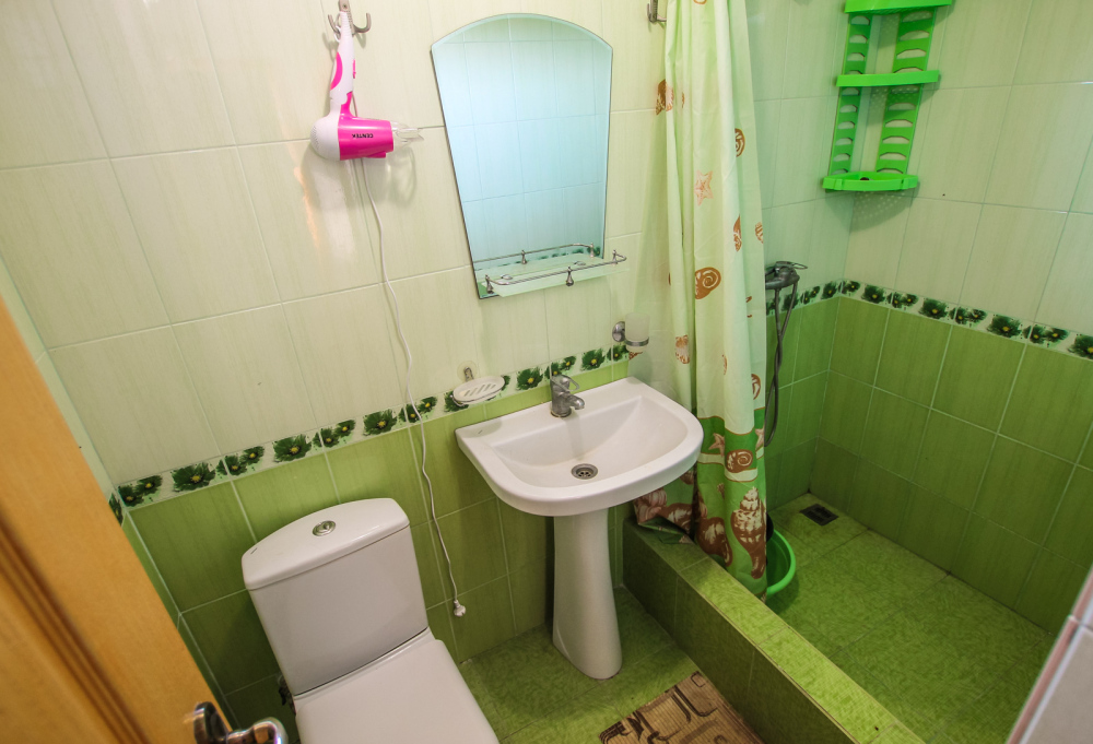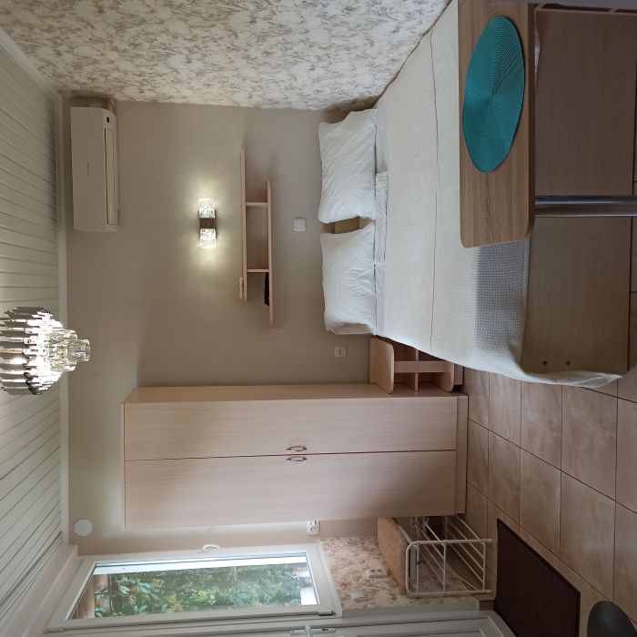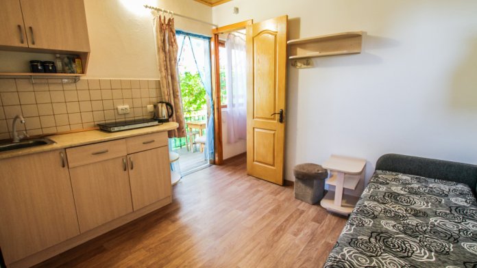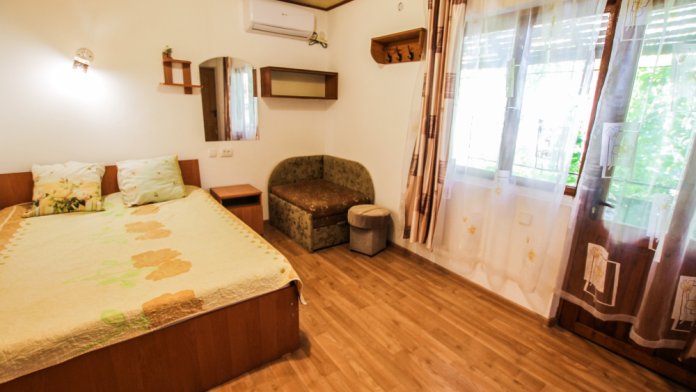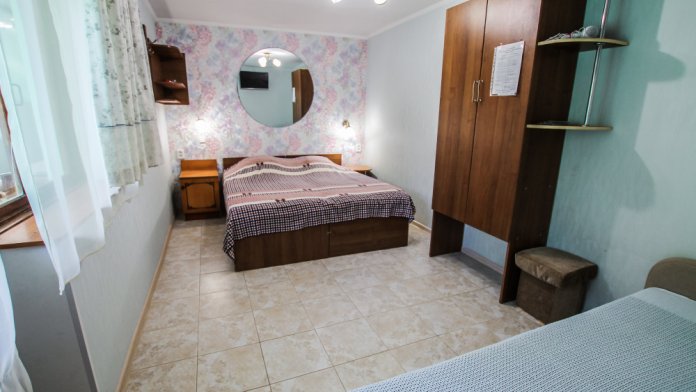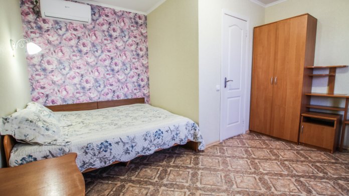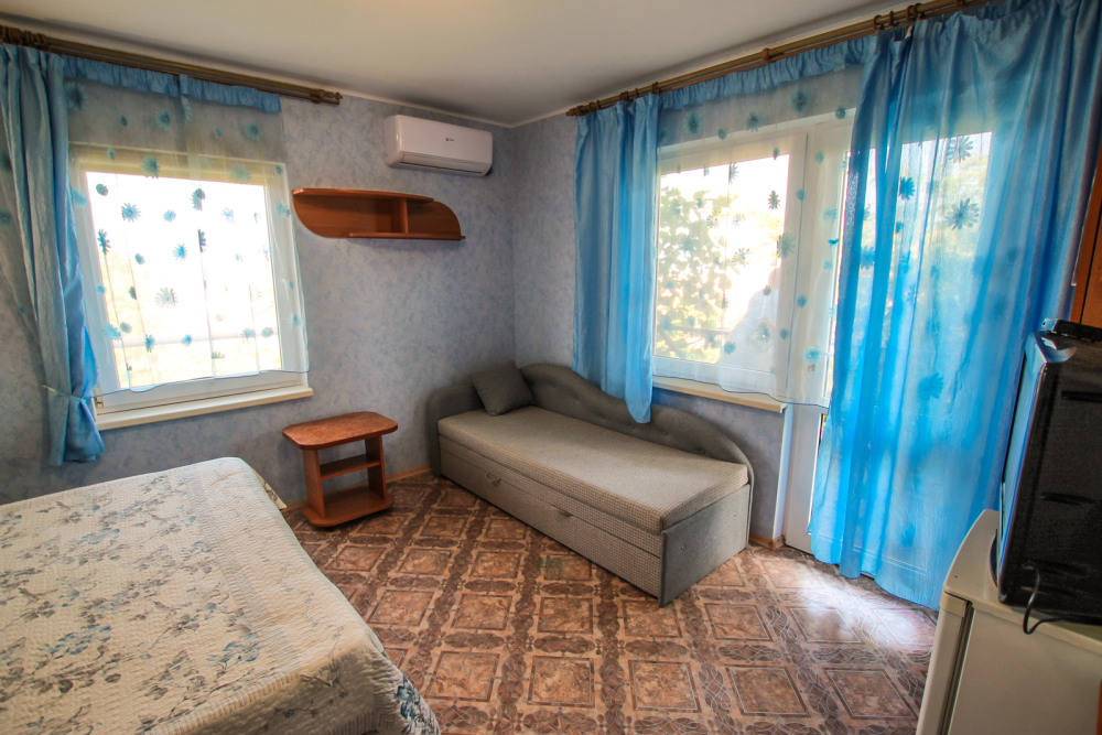 Уютный номер на 4 ех гостей для комфортного отдыха. В стандартную комплектацию номера входит: кондиционер, электрический чайник с чайной посудой, телевизор, холодильник, кровать, диван, тумбочки, шкаф, пуфики, журнальный и туалетный столик. Перед номером личное пространство для отдыха. Санузел с душем. Общая кухня на территории.