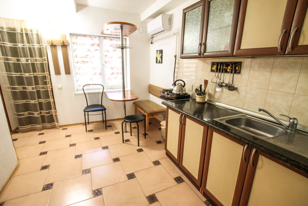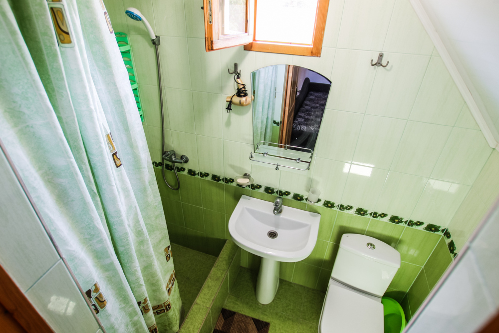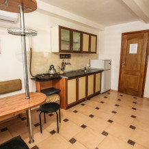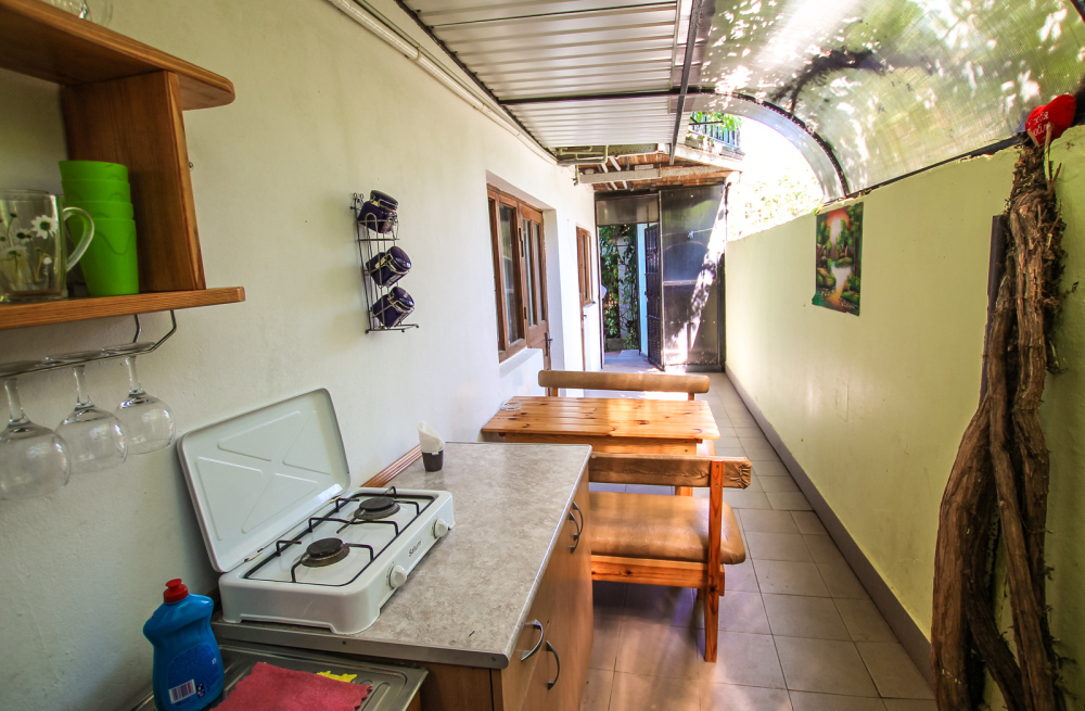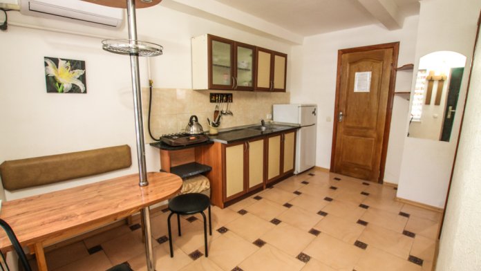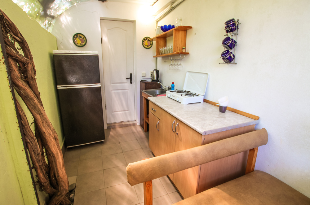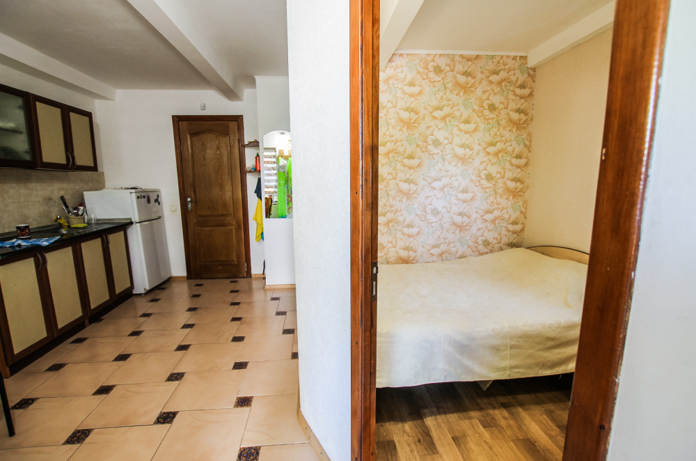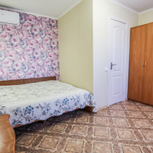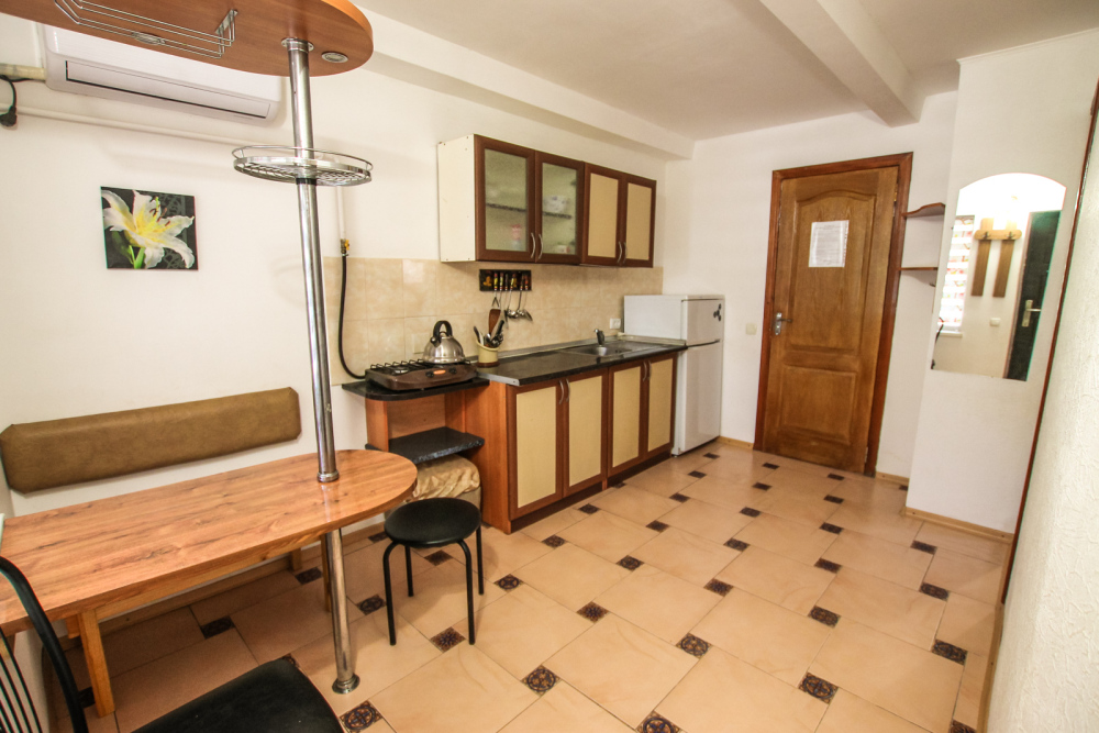 Просторный двухкомнатный номер со своей кухней для комфортного отдыха. Изолированные комнаты с двуспальными кроватями. Полностью оборудованная кухня с газовой плитой. На улице своя беседка. Санузел с ванной.