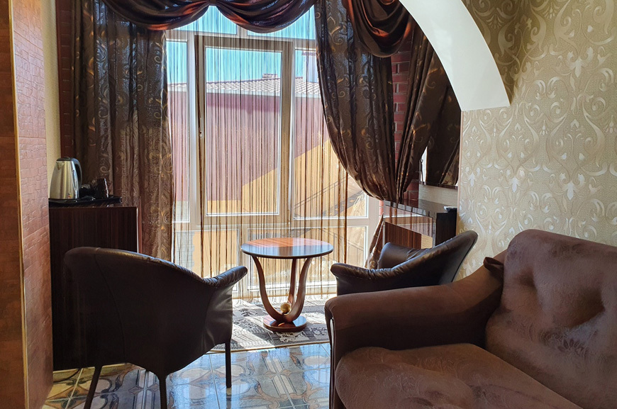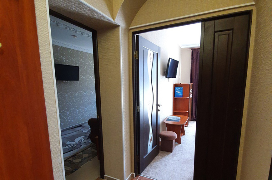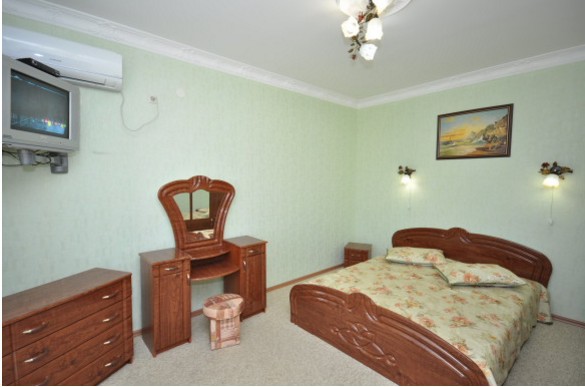 В номере: кровать двуспальная или 2 односпальные, прикроватные тумбочки, мягкое кресло, столик, 2 стула, шкафчик, комплект полотенец, мыльные принадлежности, бойлер, ТВ 95 каналов, смена белья 1 раз в неделю.